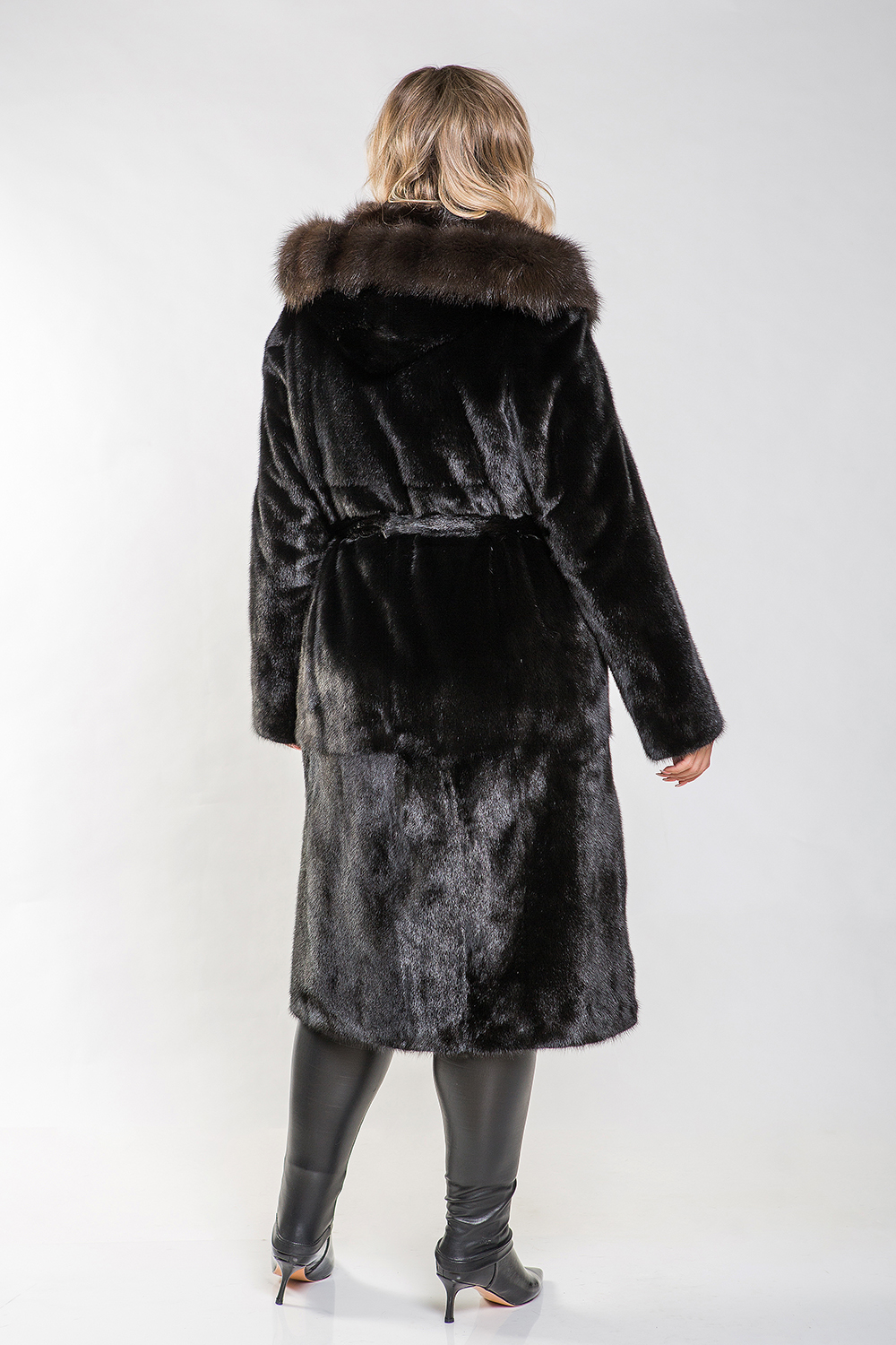 Полупальто, изготовленное из норки, с капюшоном, украшенным мехом куницы, который мастерски имитирует благородный оттенок соболя. Эта модель, выполненная из пластин с роспуском, отличается гибкостью и удобством. Рукава полупальто оснащены регулирующими утяжками, что позволяет подогнать изделие под ваш индивидуальный стиль.