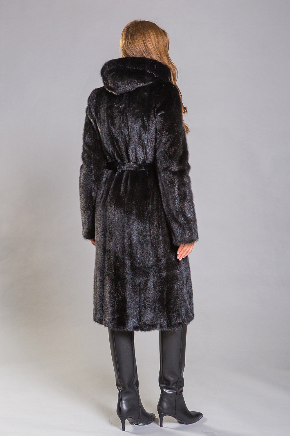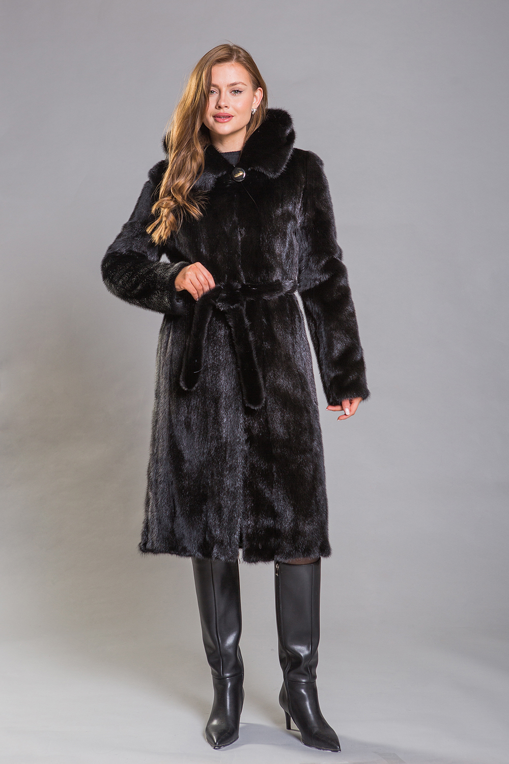 Длина полупальто составляет 110 сантиметров, что делает его универсальным вариантом для тех, кто ценит элегантность и женственность. Меховой пояс подчеркивает стройность и подчеркивает изящность силуэта, придавая образу утонченность. Эта шубка идеально дополнит строгий классический стиль, а ее главной изюминкой являются разрезы по бокам, которые придают ей особый шарм.