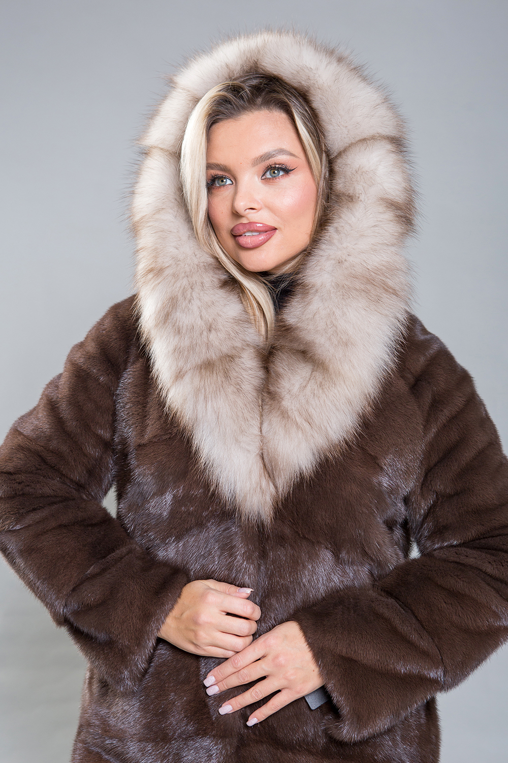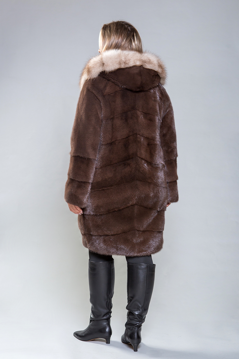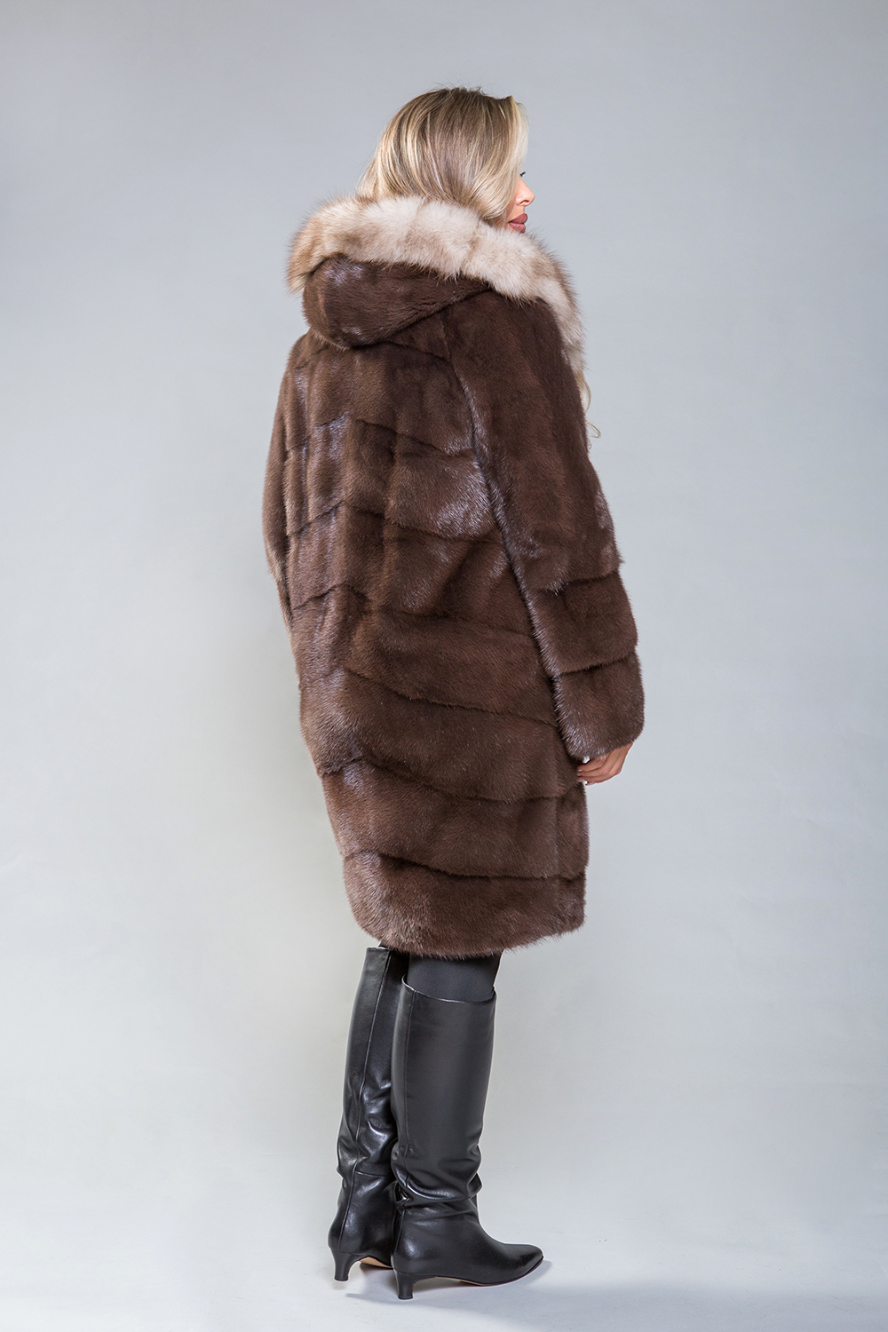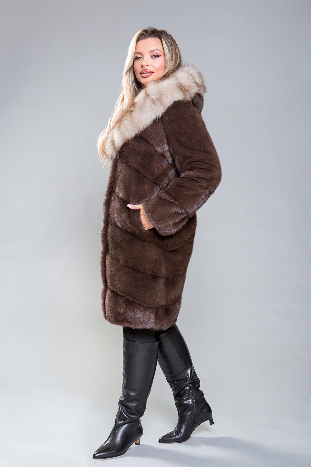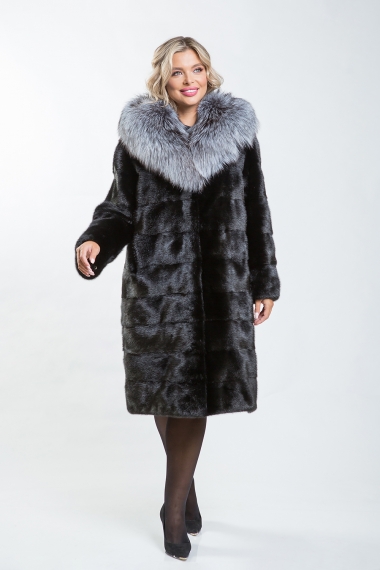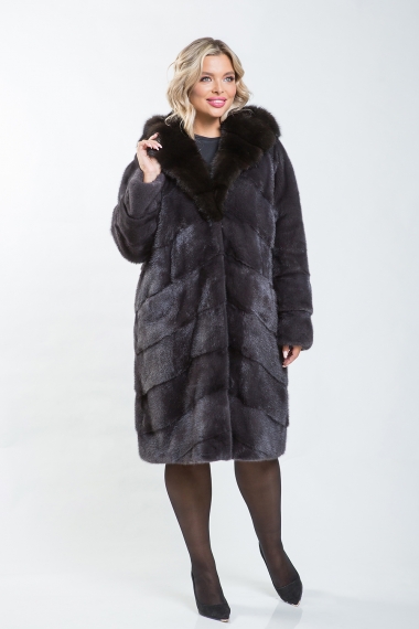 Полупальто из норкового меха с отделкой из куницы. Крой выполнен по технологии диагональной выкладки пластин. Внутренние утяжки на талии, рукавах и подоле позволяют регулировать посадку. Длина полупальто — 100 см. Рукава можно укоротить с помощью скрытых молний. К низу изделие слегка заужено. Эта модель гарантирует максимальный комфорт благодаря продуманному лекалу. Капюшон из роскошного меха куницы придает образу утонченность и благородство. Полупальто подчеркнёт статус и добавит солидности любой женщине.