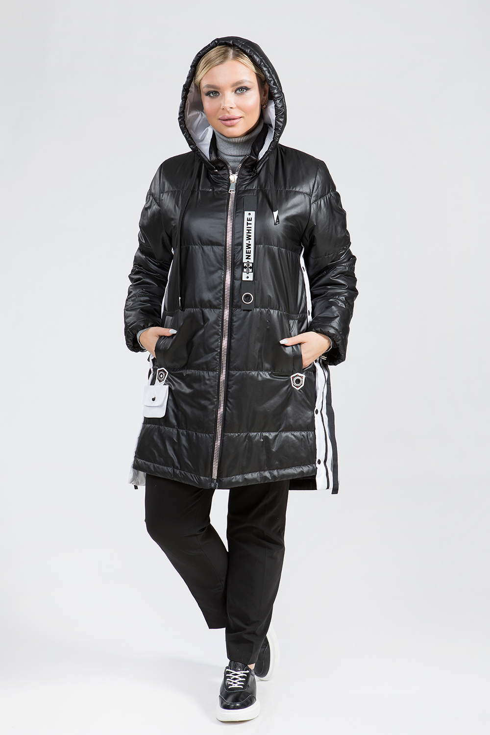 Куртка женская из текстиля с утеплителем. Утеплитель тонкий и рассчитан на весеннюю и осеннюю погоду. Капюшон на курточке отстегивается, получается элегантная стойка. По бокам модели декоративные кнопки и ленты. Есть карманы. Куртка застегивается на молнию. Спинка модели декорирована ярким принтом. Длина изделия спереди 80 см, а сзади 98 см. Куртка стильная и оригинальная, подойдет девушкам любой комплекции.
