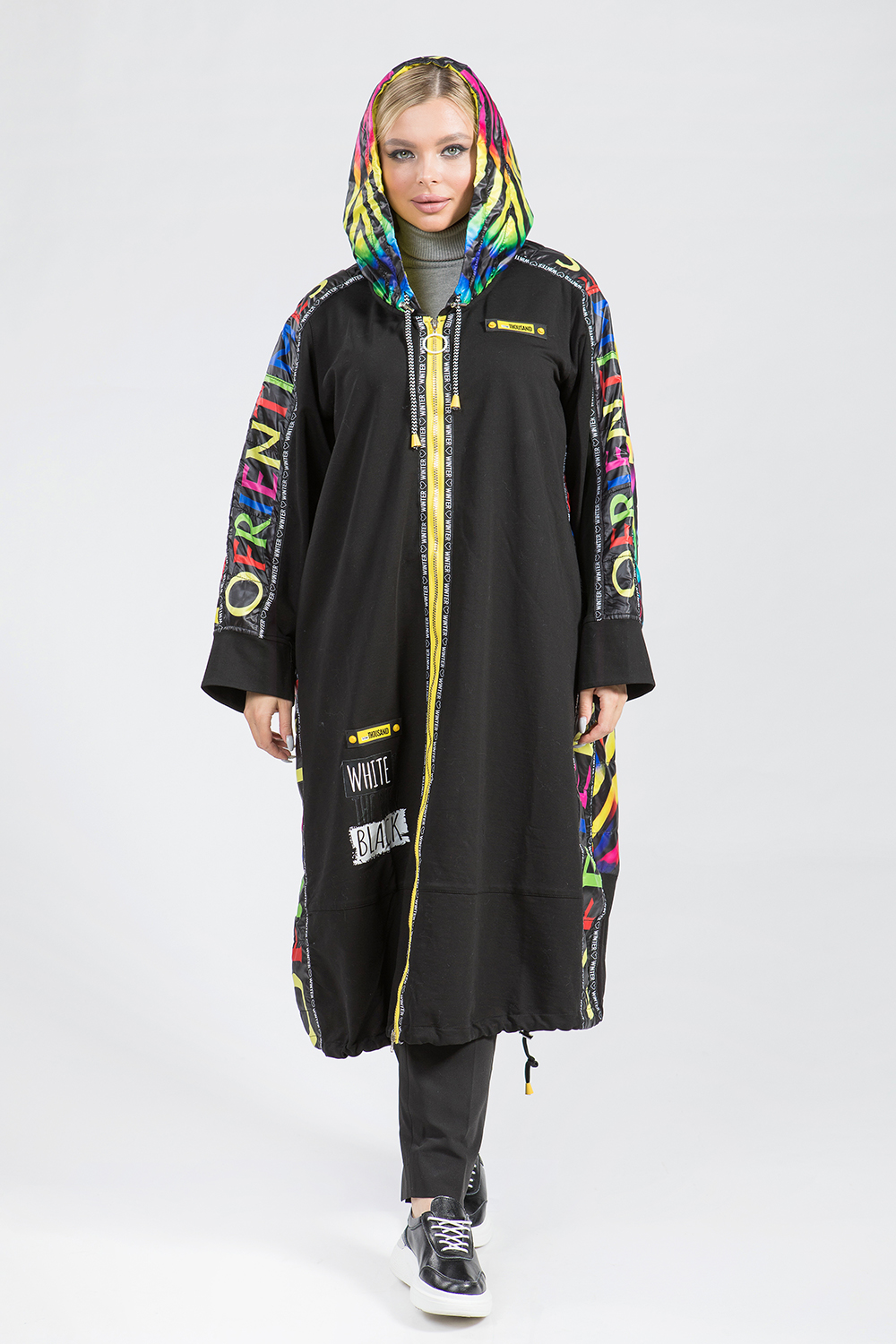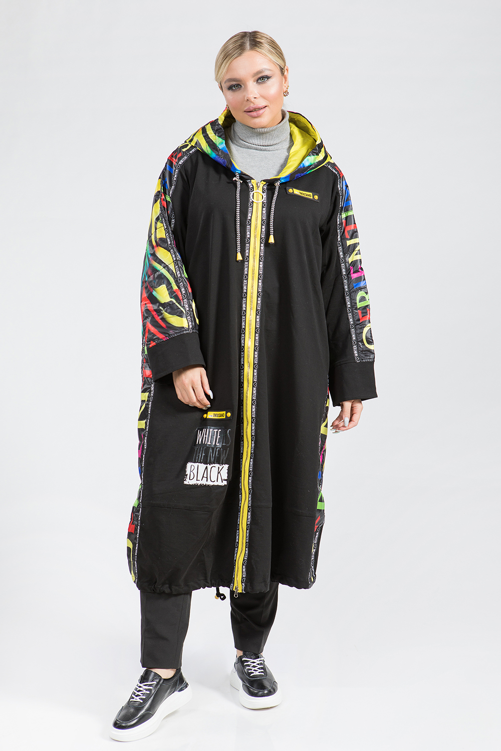 Полупальто женское из текстиля с утеплителем. Перед модели выполнен из трикотажа, а спина с тонким утеплителем, который рассчитан на теплую весну. Модель напоминает удлиненную кофту. Полупальто с капюшоном застегивается на молнию. Спинка модели декорирована ярким, позитивным принтом. Длина изделия спереди 105 см, а сзади 120 см. Полупальто снизу имеет регулирующую утяжку. Модель стильная и оригинальная, подойдет дамам любой комплекции!