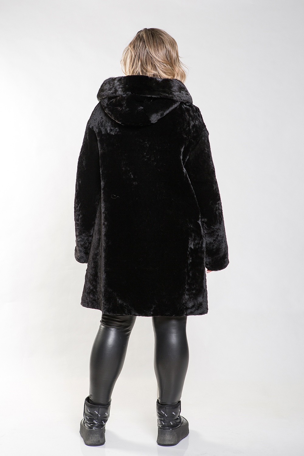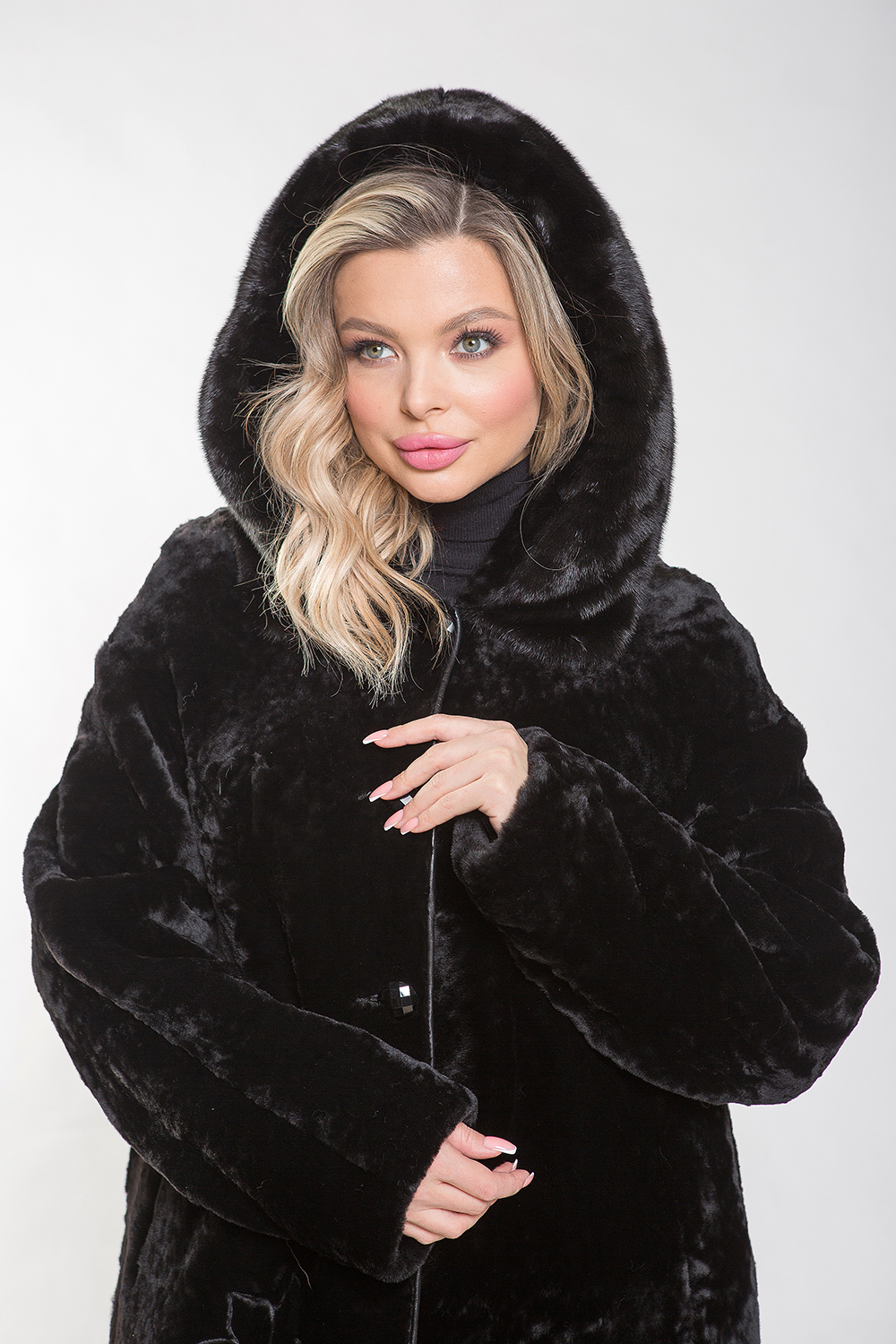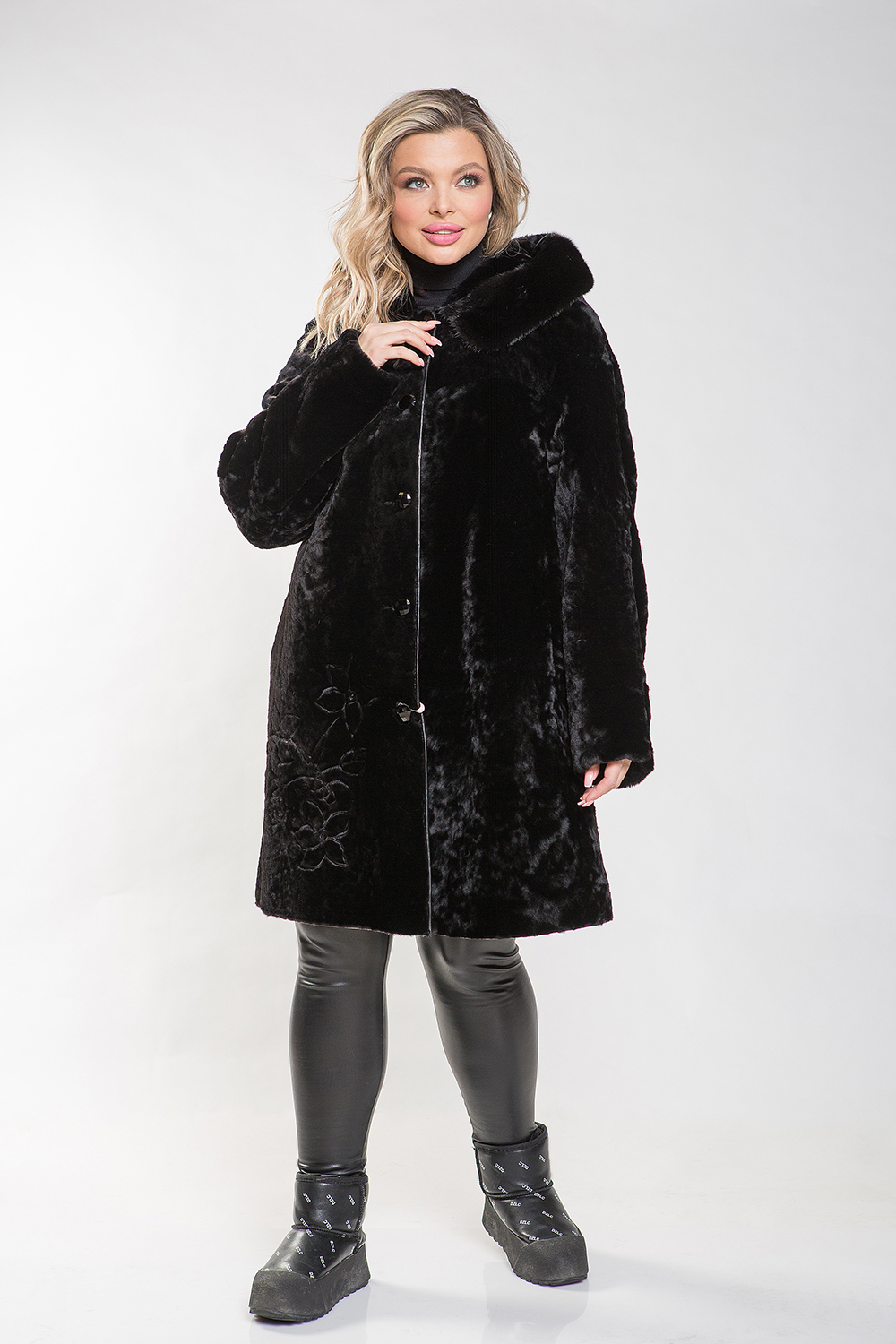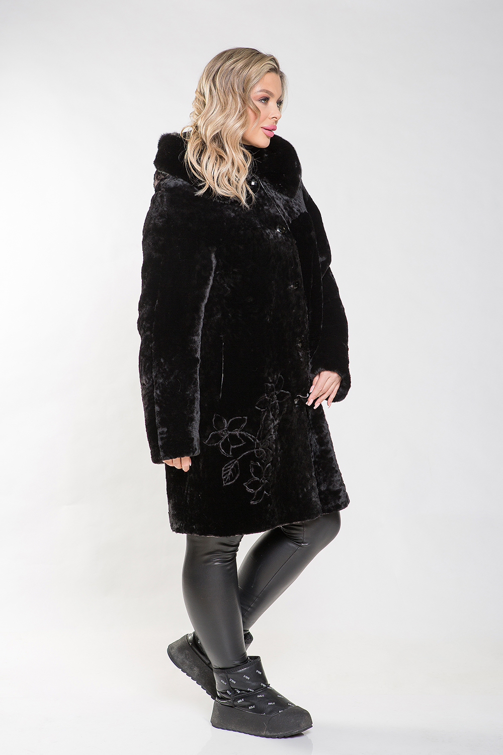 Полупальто из овчины, дополненное капюшоном из меха норки, — превосходное изделие, которое станет украшением вашего гардероба. Крой модели — пластинчатый, а борта отделаны натуральной кожей. Перед полупальто украшен вышивкой. Застёгивается шубка на пуговицы, а её длина составляет 90 сантиметров. Натуральный мех овчины прекрасно выдерживает погодные условия, сохраняет тепло и обеспечивает надежную защиту от ветра. Классическое полупальто с элементами декора всегда будет актуальным в вашем гардеробе!