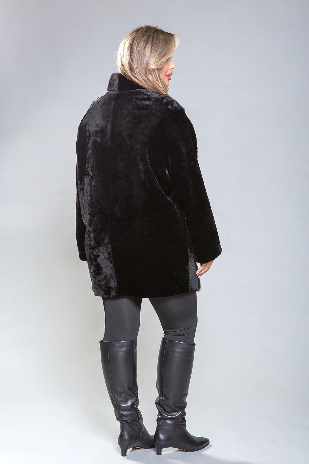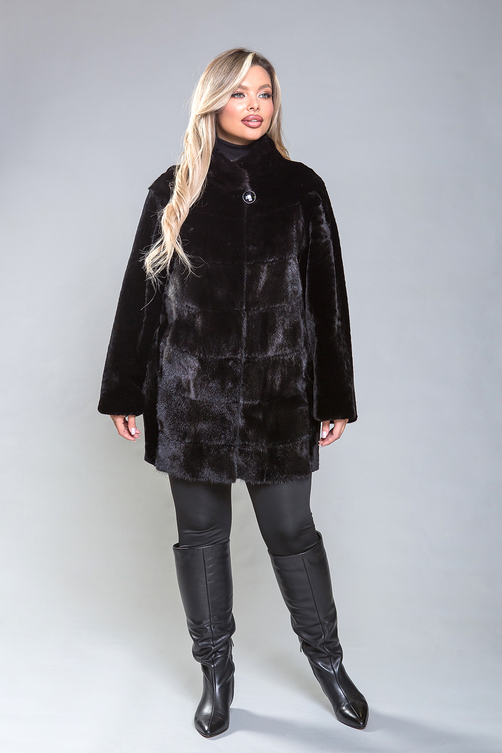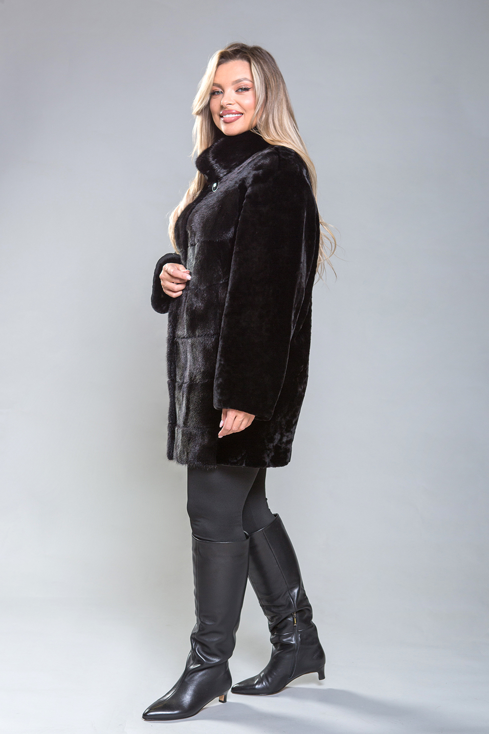 Элегантное полупальто из высококачественной овчины, дополненное изысканным воротником-стойкой. Передняя часть изделия украшена роскошной норкой, выполненной в технике поперечных пластин. Воротник из норки фиксируется с помощью декоративной пуговицы, а сама модель застегивается на клипсы. Карманы и борта изготовлены из натуральной замши, а карманы оснащены магнитами. Длина изделия составляет 98 см. Благородный черный цвет легко сочетается с любым стилем, делая эту шубку идеальным выбором для ценителей премиум-класса.