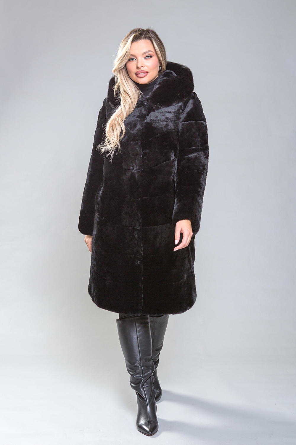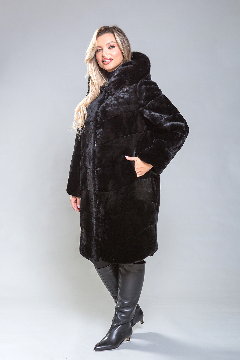 Полупальто из высококачественной овчины с капюшоном из норки выполнено по технологии диагональной выкладки пластин. Капюшон фиксируется на пуговицу, а само пальто — на клипсы. Длина изделия составляет 100 см. Прямой крой подходит для любого типа фигуры, обеспечивая удобство и комфорт.
