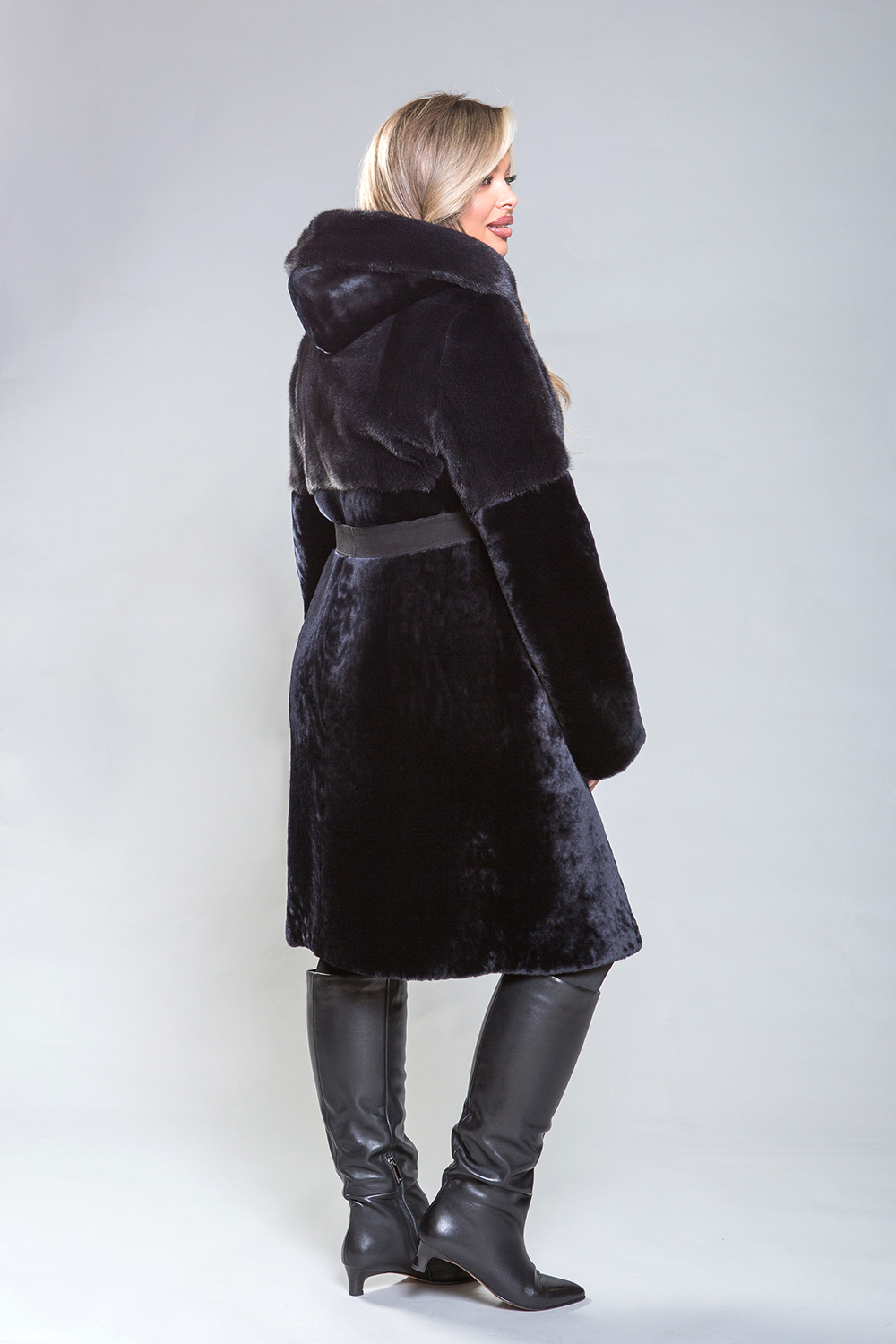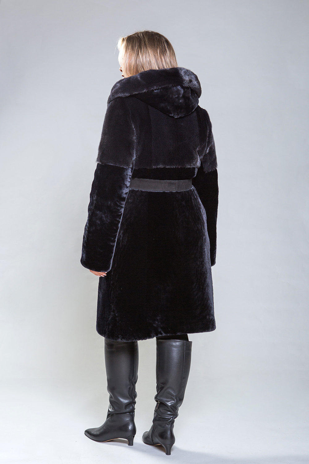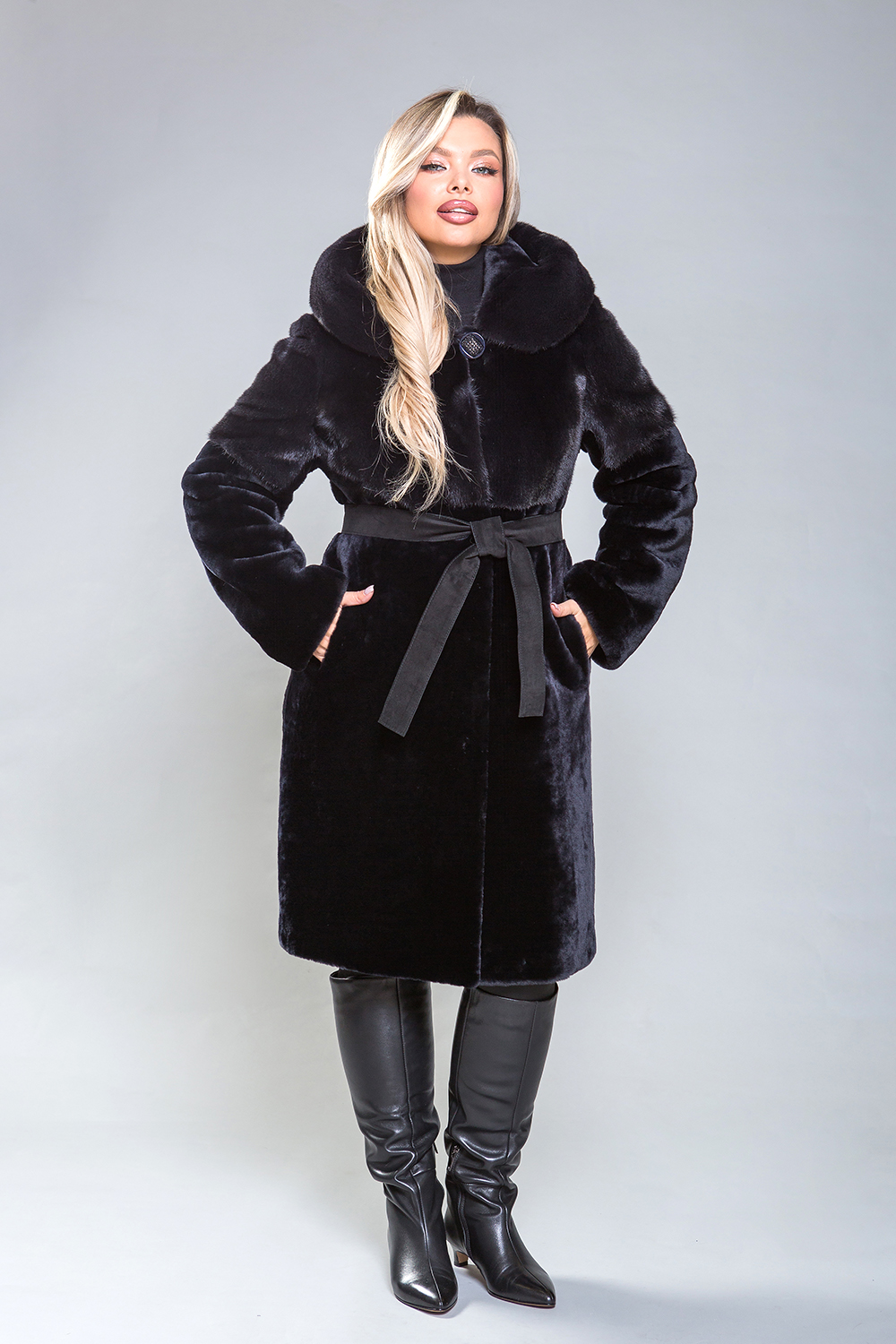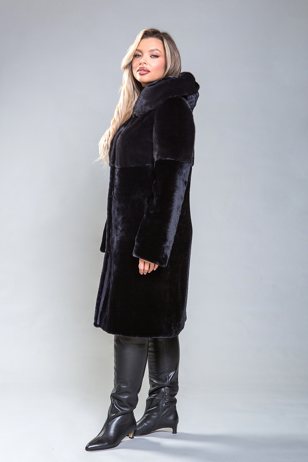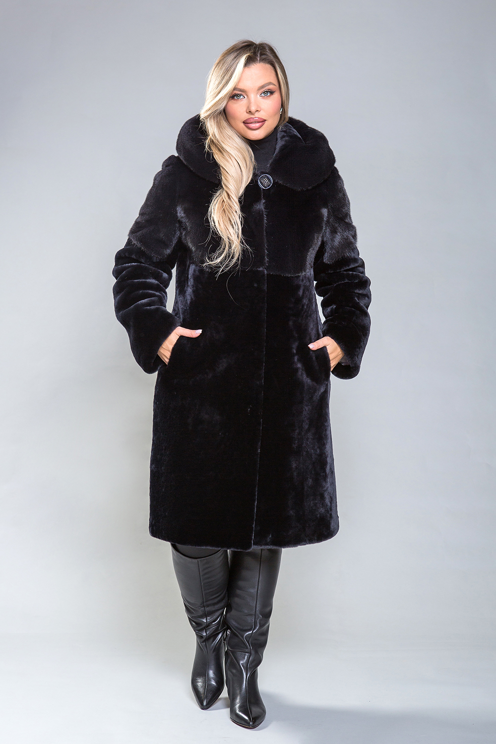 Полупальто из премиальной овчины с изысканным норковым капюшоном и отделкой на передней, задней половинах до талии и верхней части рукавов. Карманы и борта изготовлены из натуральной замши. Длина изделия составляет 100 сантиметров. Элегантный оттенок черничного гармонично сочетается с любым стилем, добавляя уверенности и подчеркивая женское обаяние.