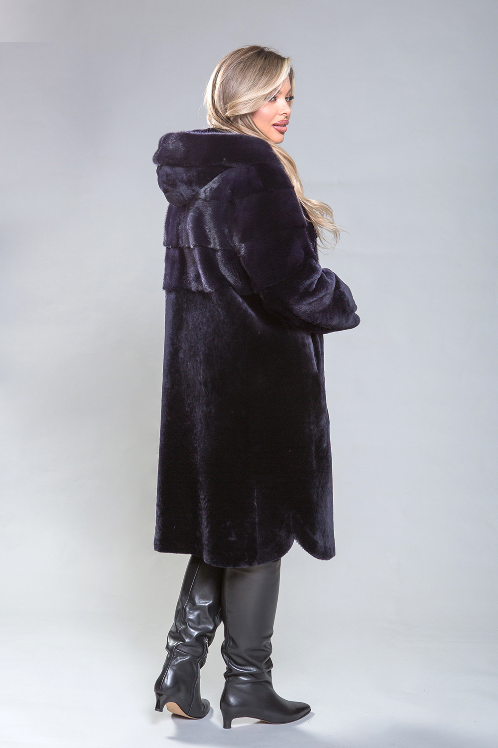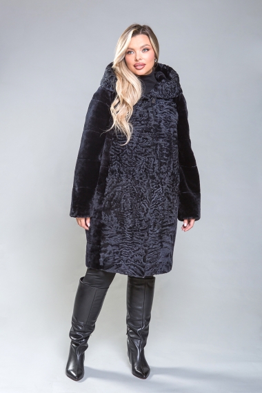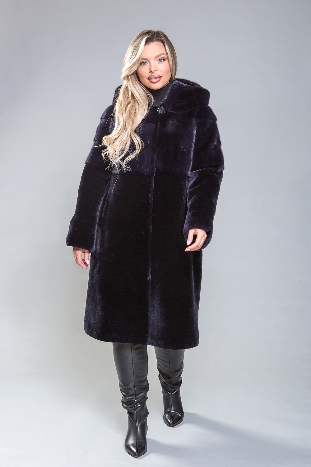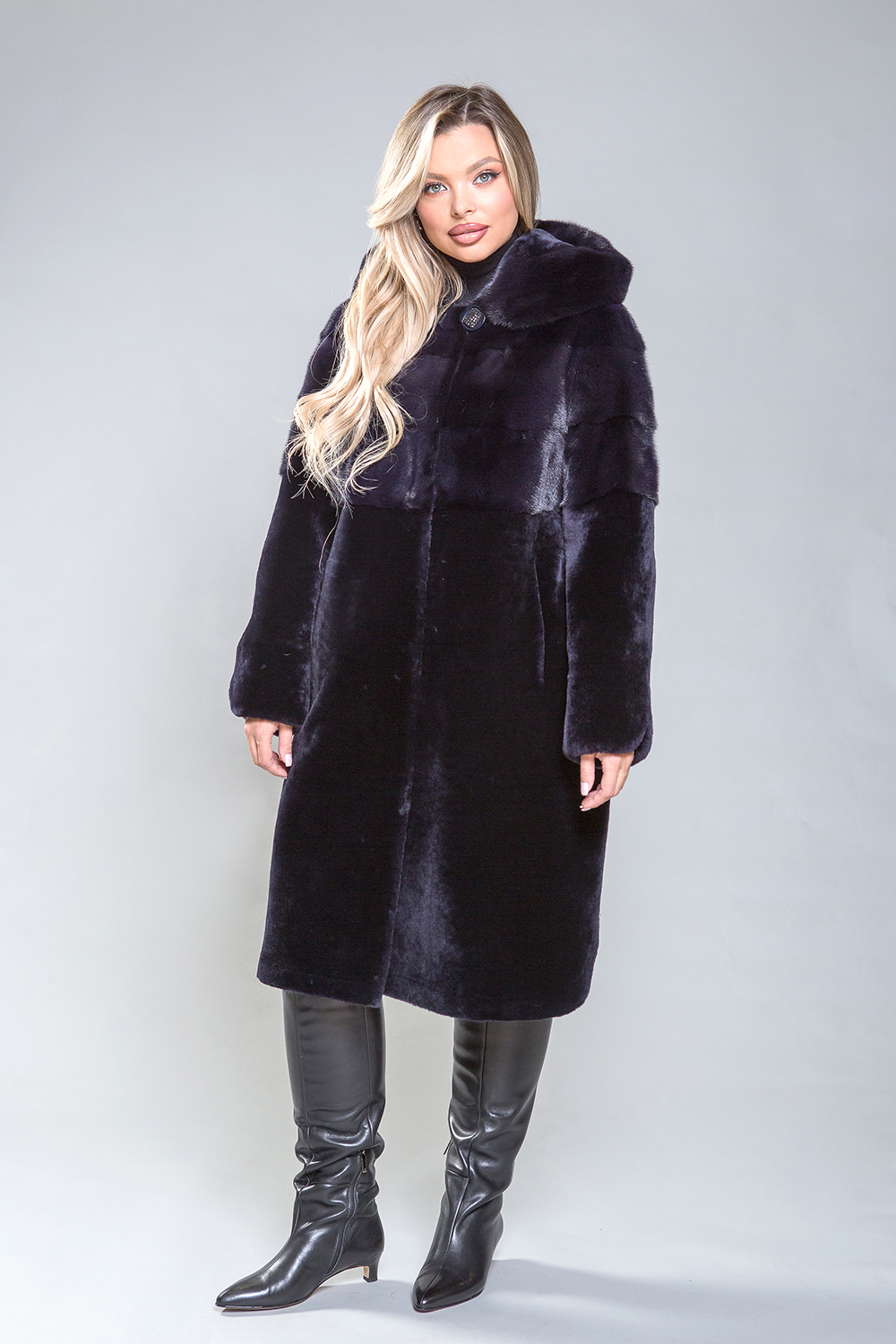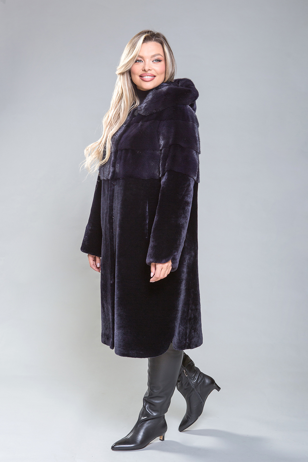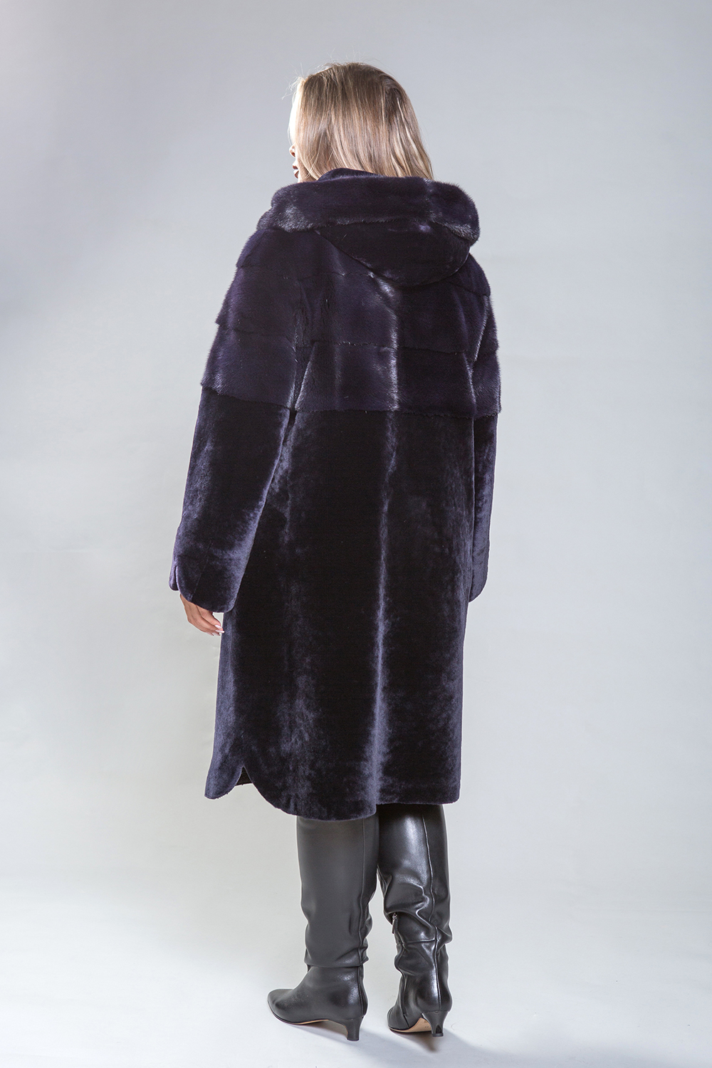 Полупальто из премиальной овчины высшего качества! Его длина составляет 105 см, а дизайн отличается изысканностью. Капюшон, передняя и задняя часть до талии, а также верхняя часть рукавов украшают роскошные норковые пластины, выполненные в поперечном направлении. Изящные закругленные разрезы на рукавах и по низу изделия придают ему утонченность и элегантность. Насыщенный оттенок темного ириса прекрасно сочетается с любым стилем. Это гармоничное сочетание красоты, высокого качества и комфорта делает это полупальто идеальным выбором.