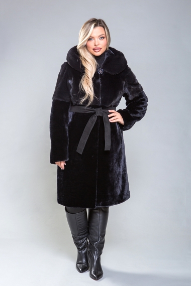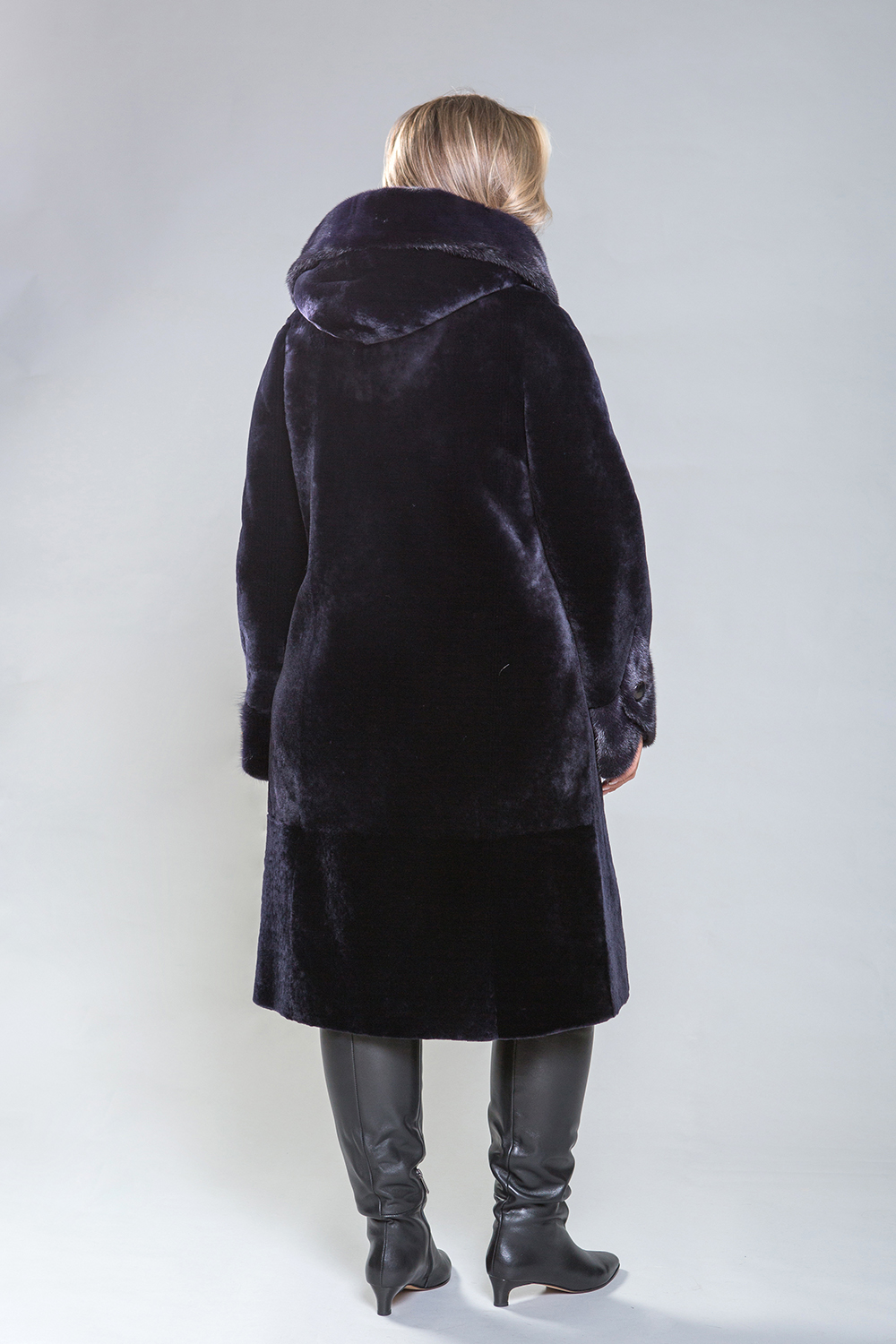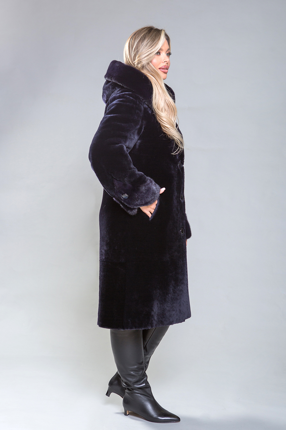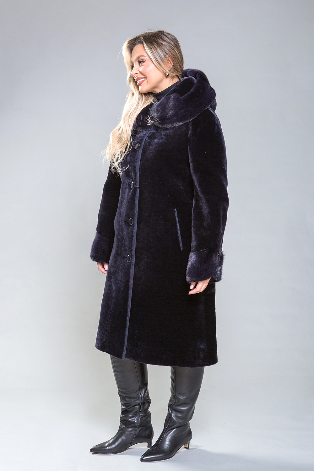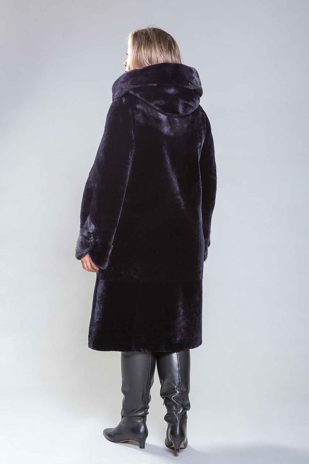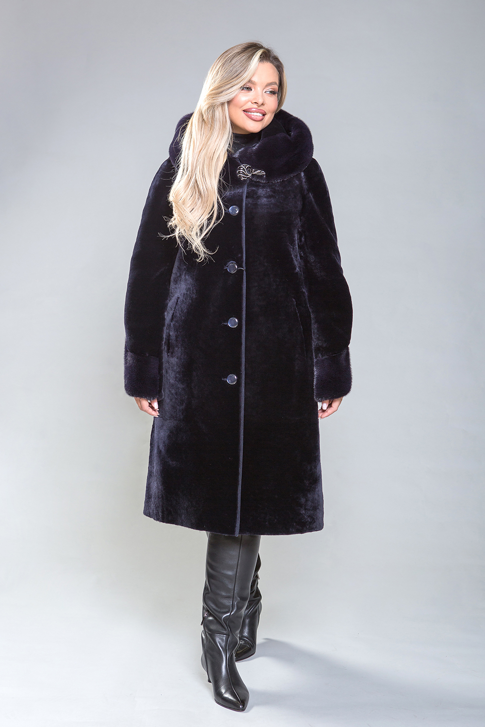 Полупальто из премиальной овчины. Капюшон и манжеты украшены мехом норки. Капюшон фиксируется с помощью декоративной клипсы. Шубка застегивается на пуговицы. Ее длина составляет 105 см. Карманы и борта изготовлены из натуральной замши. Это универсальное решение! Эксперты моды утверждают, что классический фасон шубы подходит для любого типа фигуры, придавая образу изысканность и утонченность.