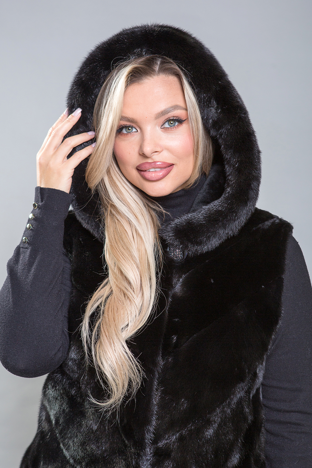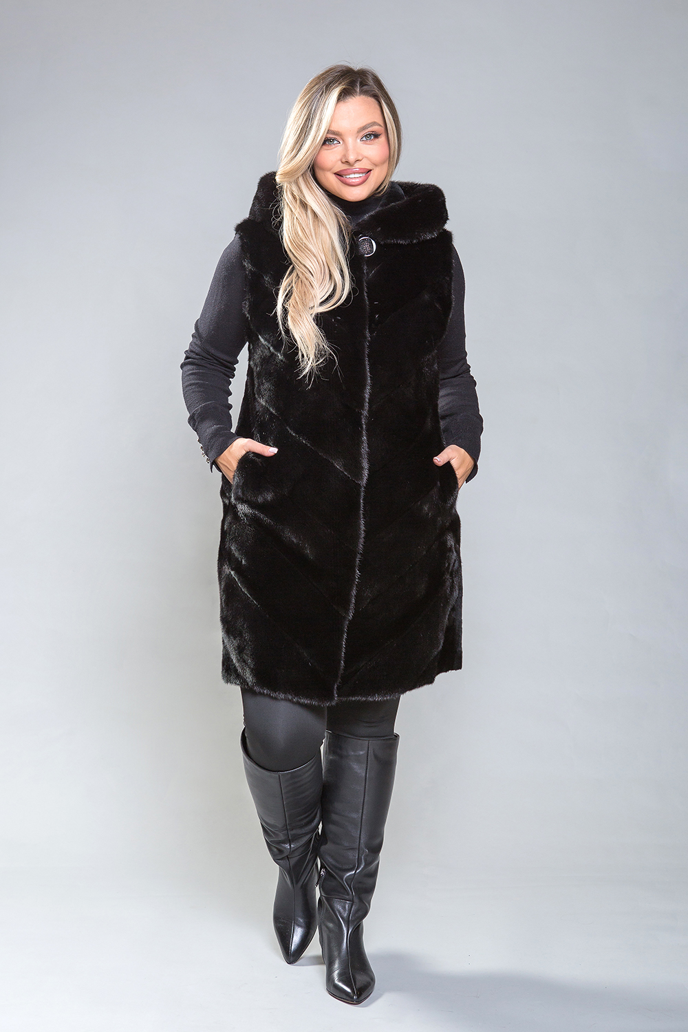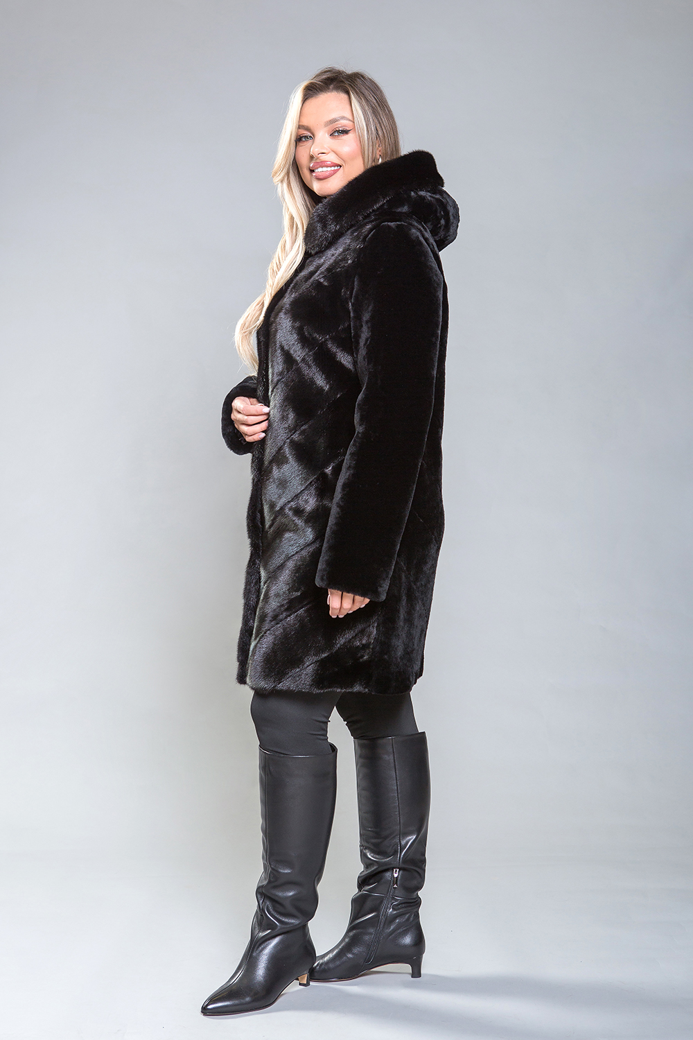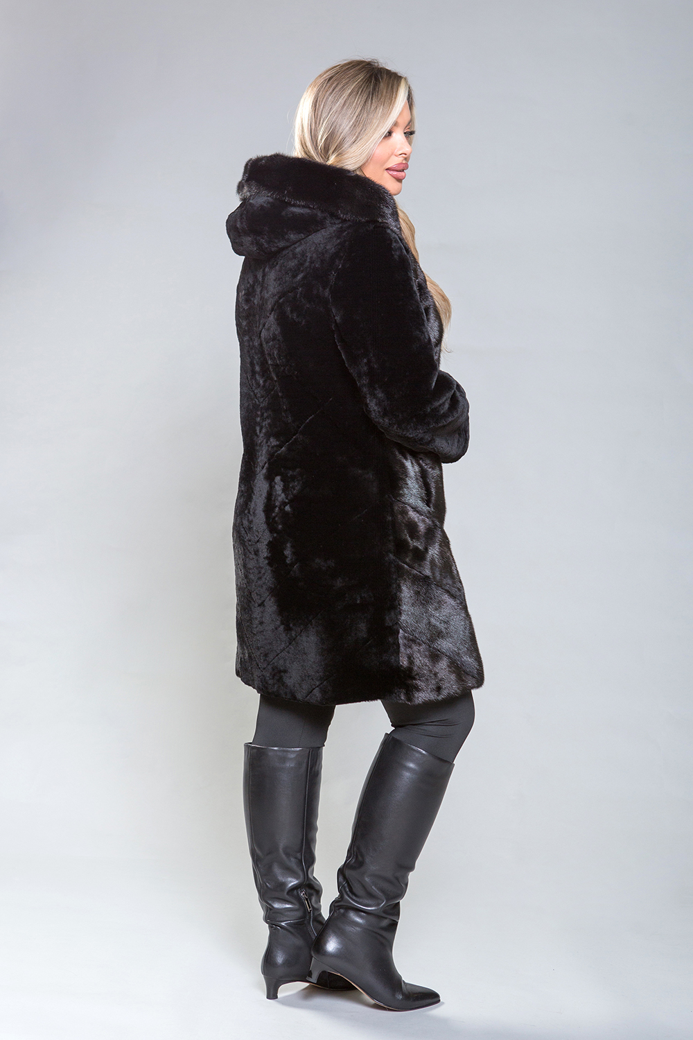 Полупальто из высококачественной овчины. Капюшон и передняя часть декорированы норкой, расположенной в диагональной укладке пластин. Карманы и борта выполнены из натуральной замши. Застежка выполнена в виде клипс. Длина изделия составляет 90 см. Уникальная особенность этой модели — трансформация. Рукава и капюшон отстегиваются, и полупальто превращается в удлиненный жилет! Элегантный черный цвет легко сочетается с любым стилем. Эта шуба не только обеспечивает тепло и комфорт, но и придает неповторимый шарм!