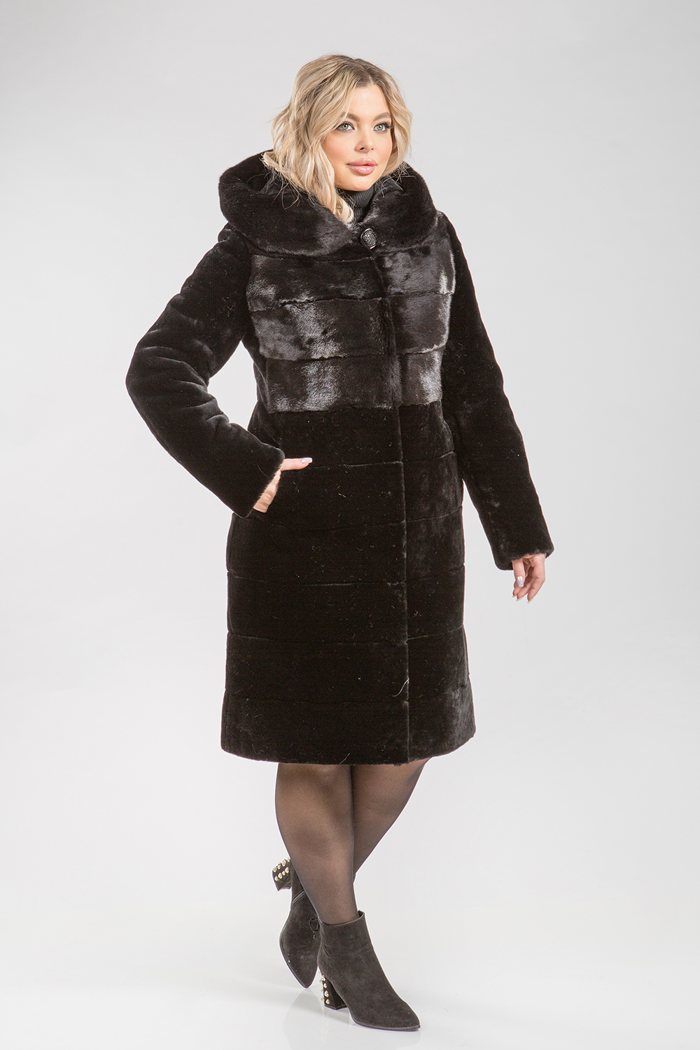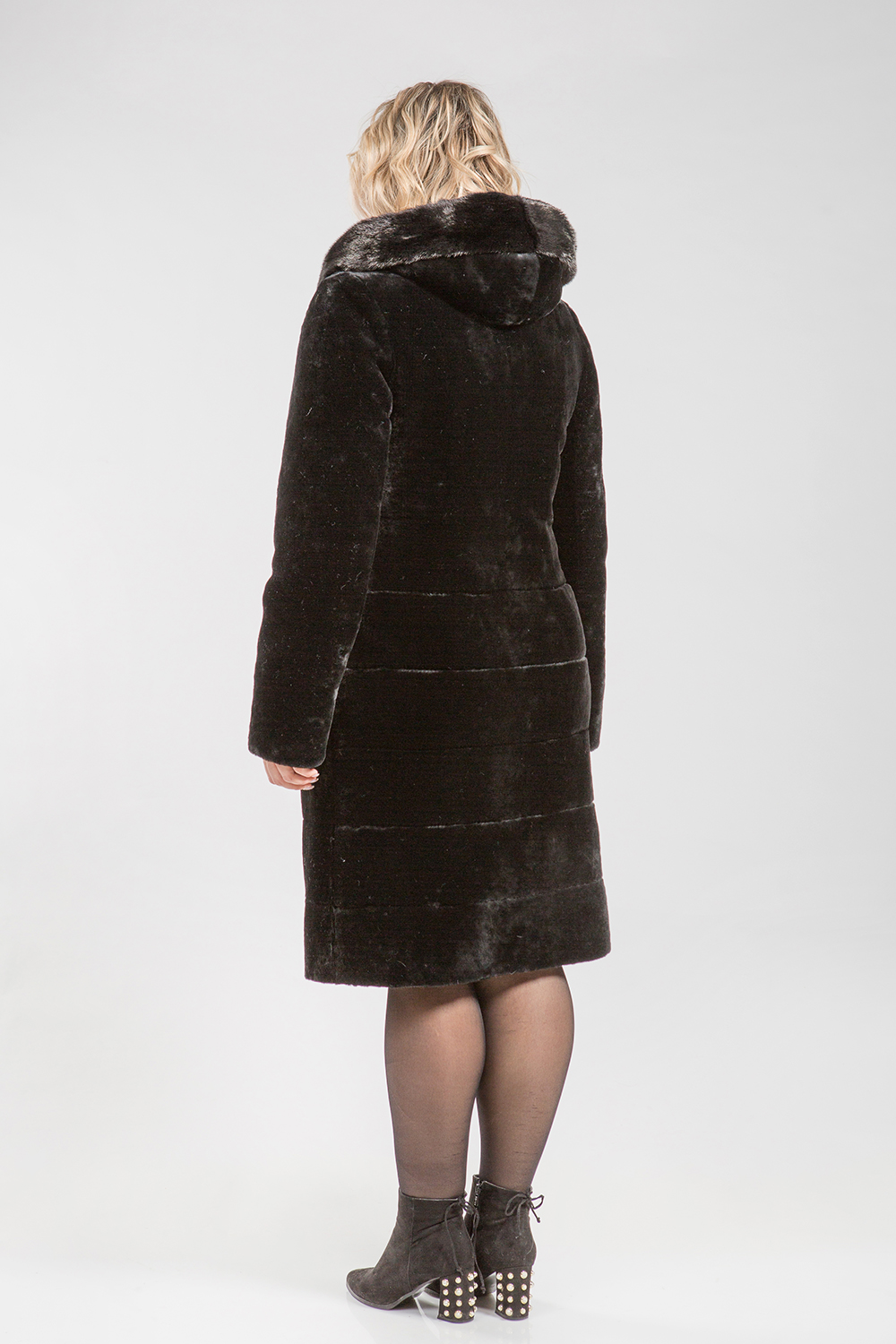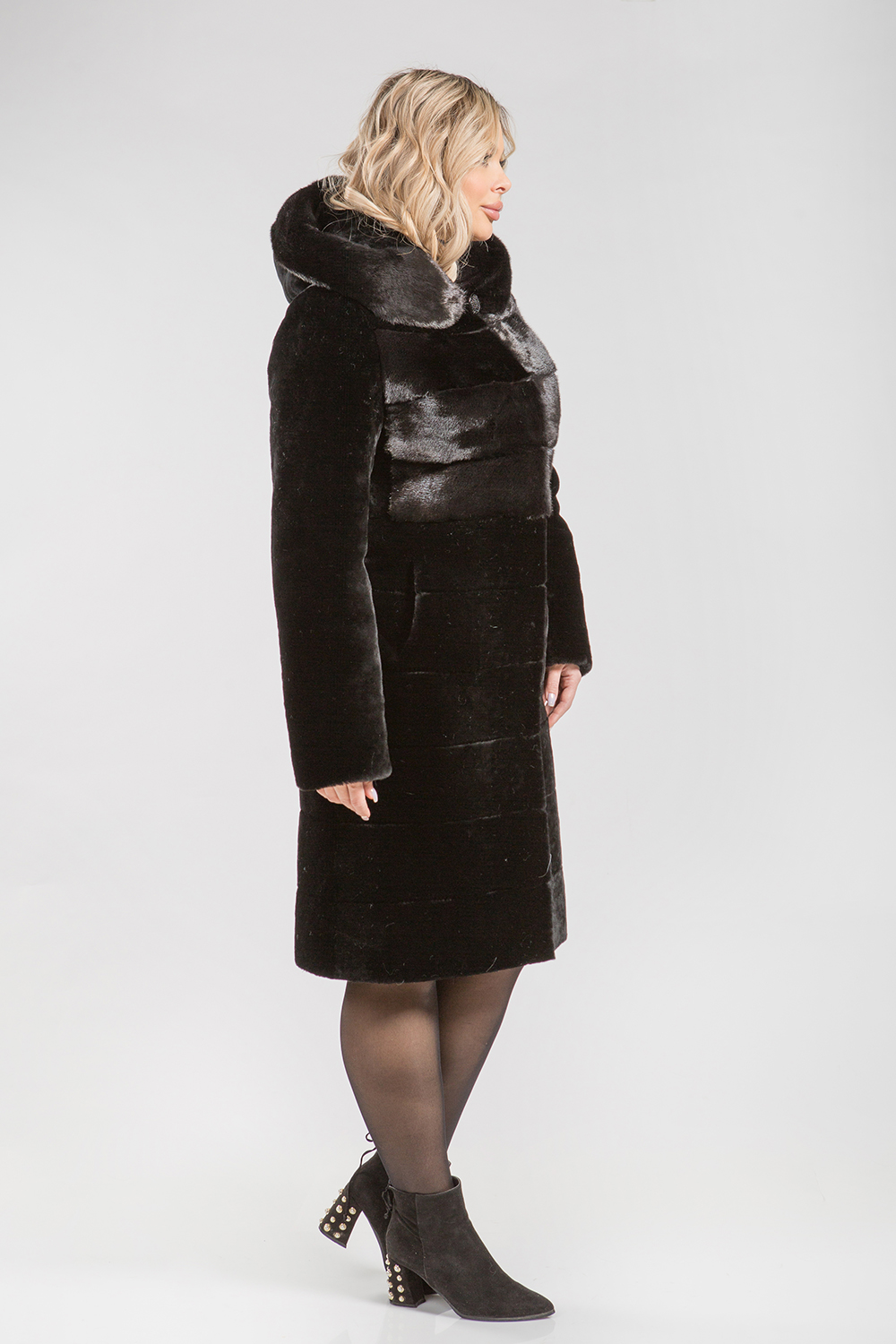 Полупальто выполнено из овчины и украшено норковым мехом на капюшоне и полочке. Юбка имеет поперечный крой из пластин. Рукава можно подвернуть и укоротить по желанию. Карманы и борта отделаны натуральной замшей. Длина изделия составляет 110 см.