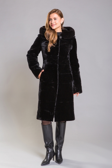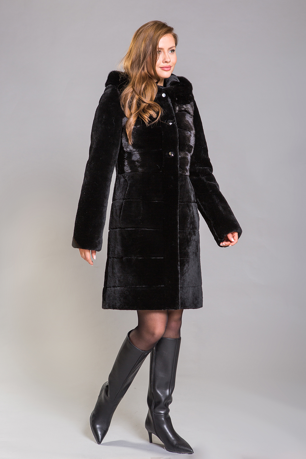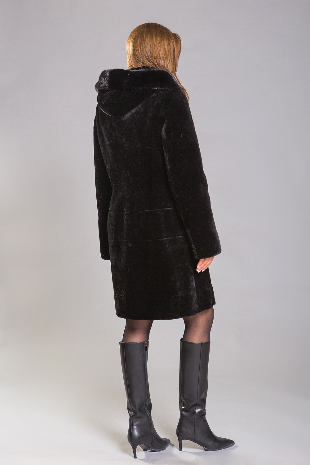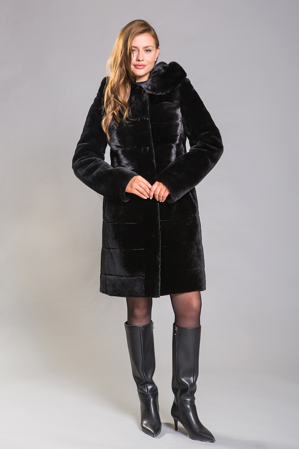 Полупальто из овчины с капюшоном, украшенным норковым мехом, — это воплощение стиля и элегантности, идеально подходящее для холодных зимних дней. Пластинчатый крой придает модели современный и утонченный вид.