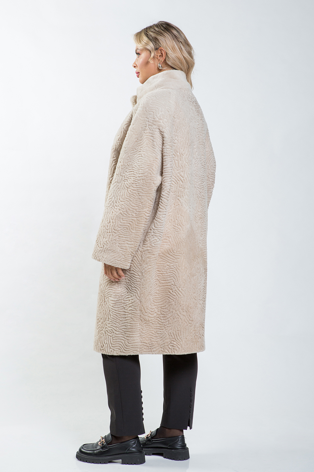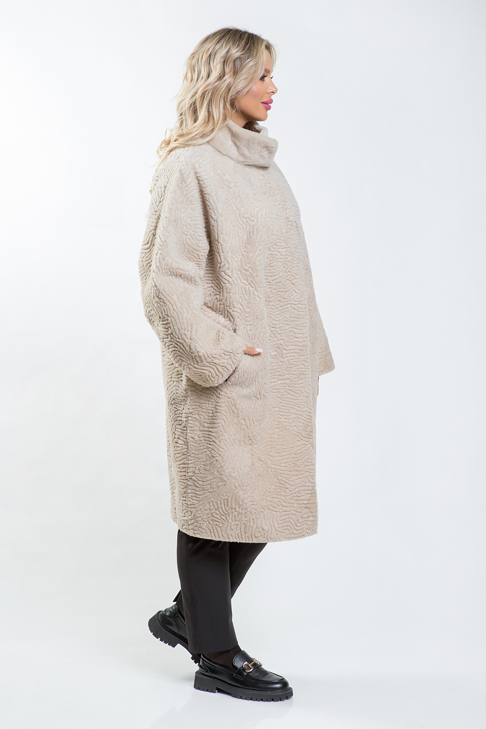 Полупальто из меха овчины. Воротник модели-стойка. Крой изделия пластины с ажурной выстрижкой. Модель застегивается на клипсы. Длина изделия 105 см. Стильная шубка жемчужного оттенка освежает и омолаживает образ! Обратите внимание на современный фасон шубки, который скрадывает объемы и скрывает все проблемные места.