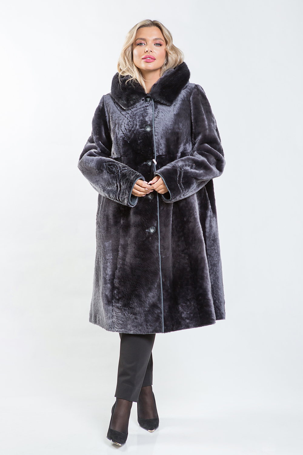 Полупальто из меха овчины. Капюшон модели дополнен мехом норки. Крой изделия пластины. Модель декорирована вышивкой и стеклярусами. Рукава, кармашки и борта изделия обработаны натуральной кожей. Модель застегивается на пуговицы. Длина изделия 108 см. Меховое пальто из меха овчины является оптимальным вариантом для повседневного образа. Шубка обеспечивает надежную теплозащиту и комфорт!