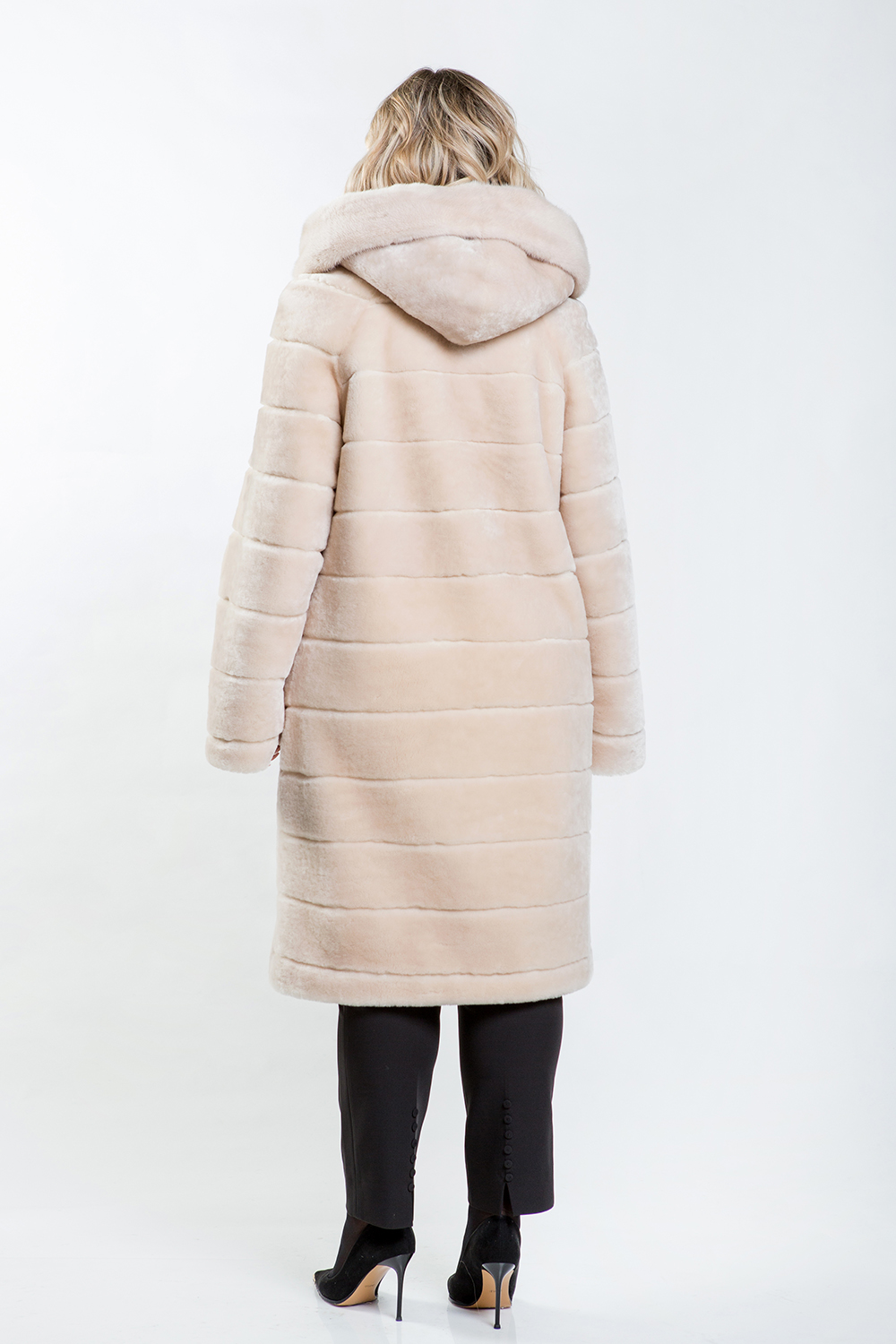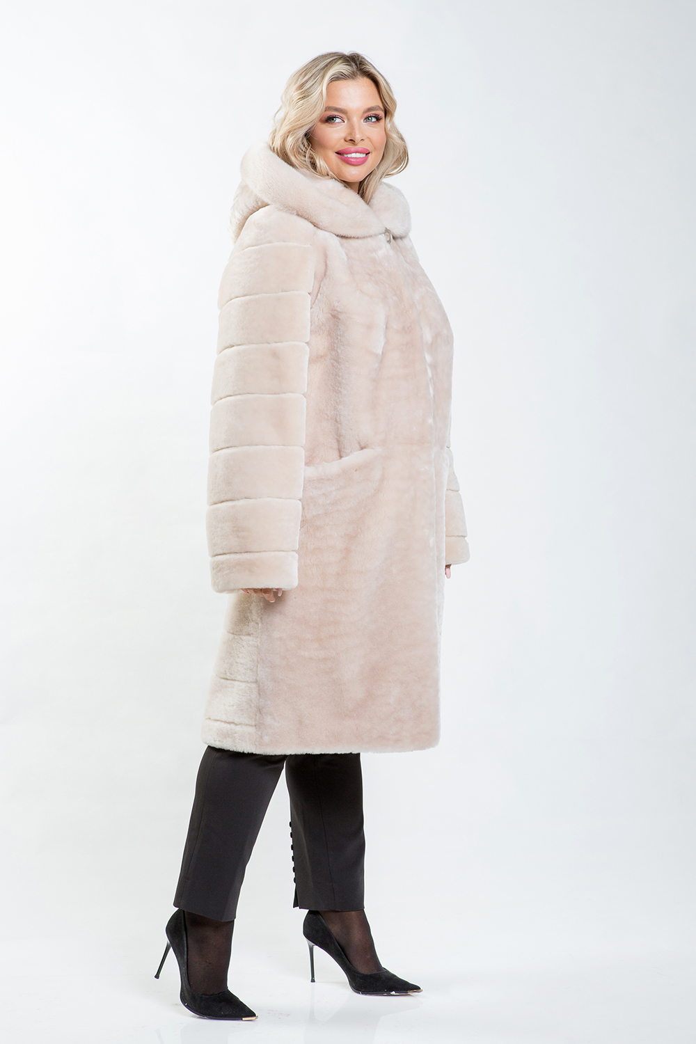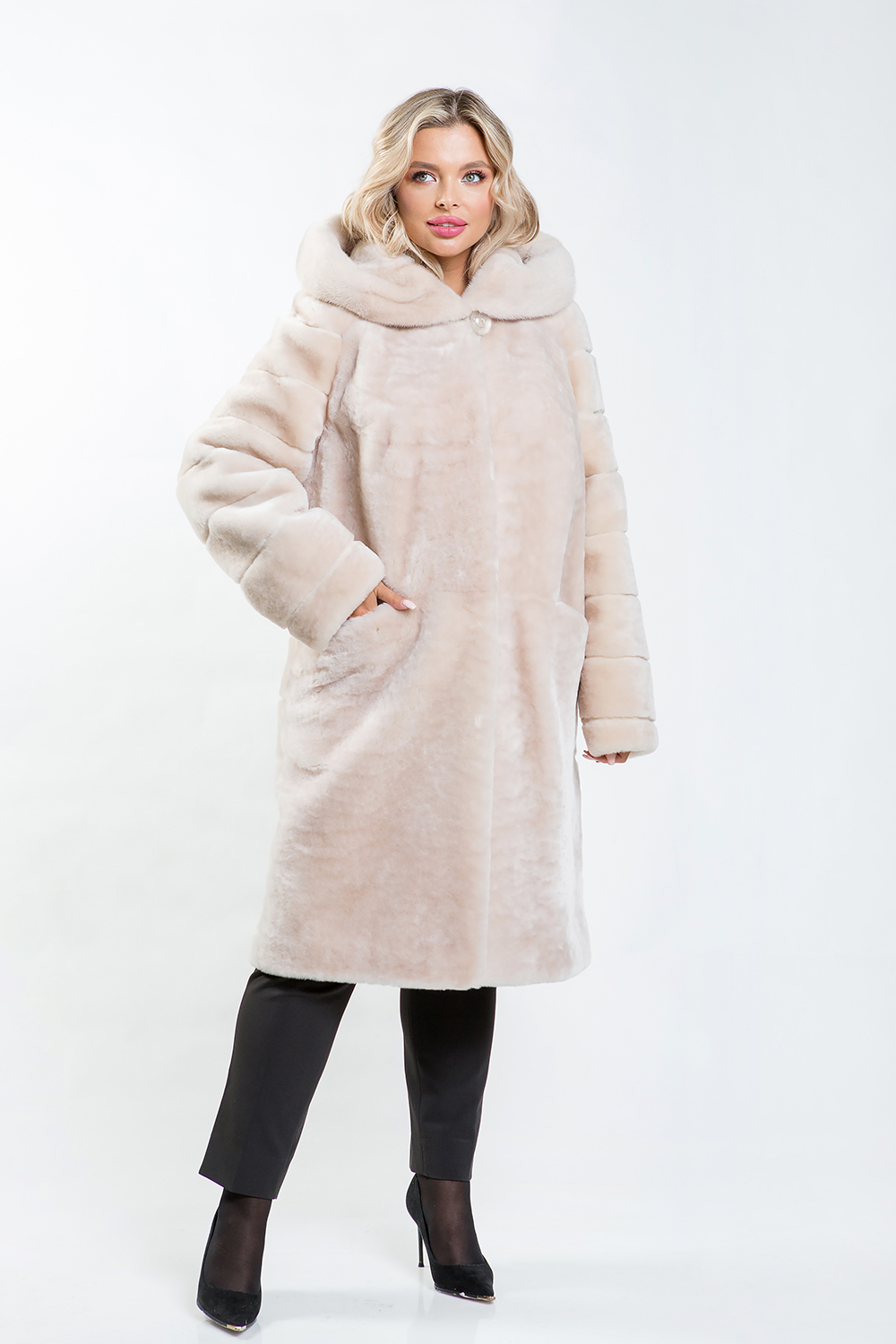 Полупальто из меха овчины. Капюшон модели дополнен мехом норки. Крой изделия комбинированный, перед-пластины, а спинка и рукава-поперечная выкладка пластин. Длина модели 110 см. Светлый жемчужный оттенок шубки освежает и омолаживает образ. Такое полупальто будет к лицу и блондинкам и брюнеткам!