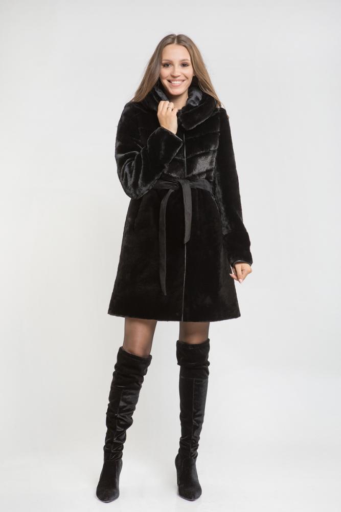 Полупальто из меха овчины. Капюшон изделия декорирован мехом норки. Перед модели - диагональная выкладка пластин из норочки. Длина изделия 90 см. Борта и низ рукавов модели обработаны натуральной кожей. Благородный цвет черного меха представляет неограниченные возможности для любительниц экспериментов!