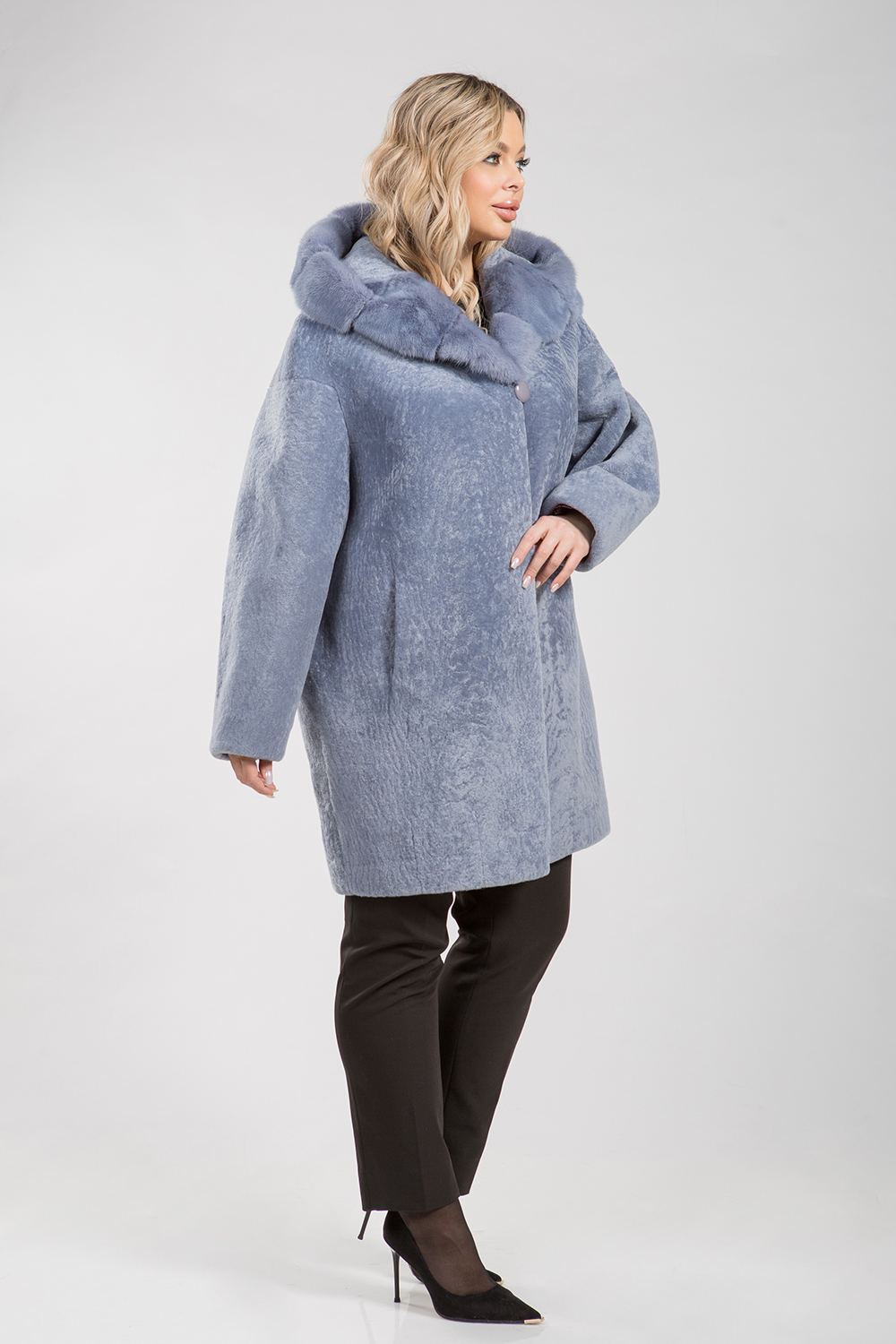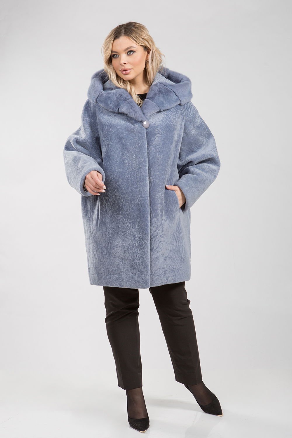 Курточка из меха овчины (астрагана). Капюшон модели декорирован мехом норки. Крой изделия пластины. Фасон рукава свободный. Длина модели 90 см. Изделие застегивается на клипсы. Курточка легкая и теплая. Светлое изделие из натурального астрагана освежает и омолаживает образ! Такая курточка идеально подходит для любой зимней погоды!