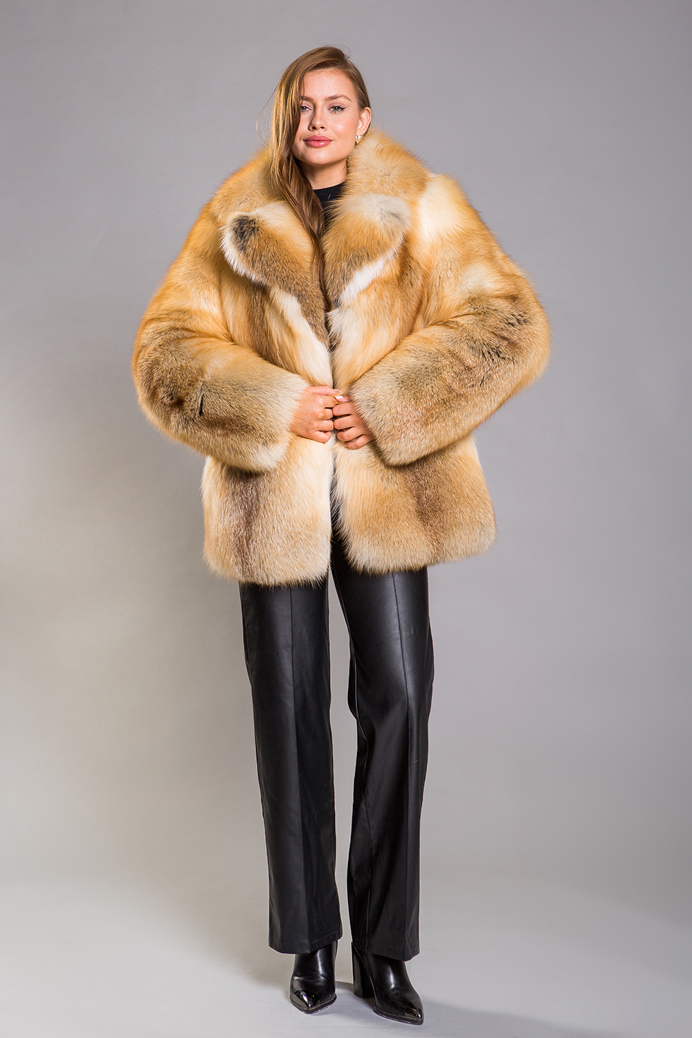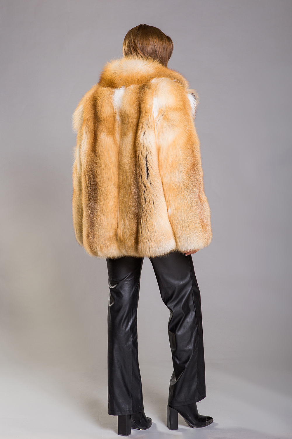 Роскошная куртка из меха лисы с английским воротником — настоящее украшение вашего гардероба! Внутри на талии есть регулирующая утяжка, которая позволяет создать идеальный силуэт. Длина модели составляет 70 сантиметров.