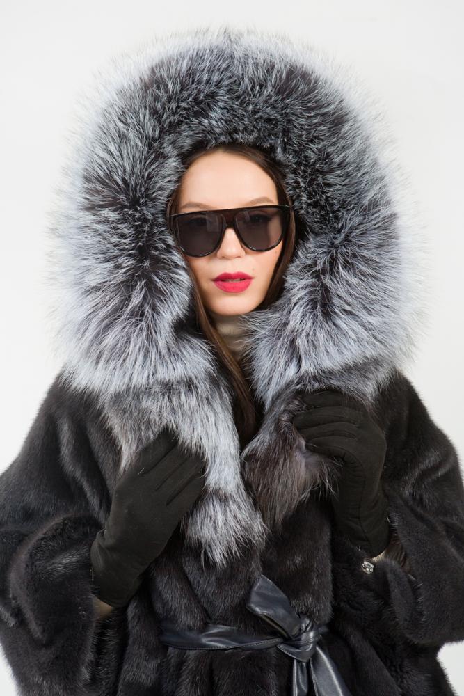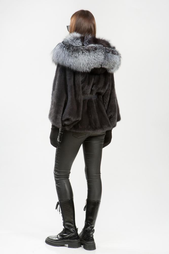 Эта очаровательная курточка, выполненная из меха норки, имеет капюшон, украшенный чернобурой лисой. Крой изделия представляет собой смесь традиционного роспуска с добавлением пластин, что придает ему особую текстуру и рельеф. На рукавах имеются регулирующие утяжки, которые позволяют моделировать и подчеркивать свою фигуру. Длина изделия составляет 70 сантиметров.