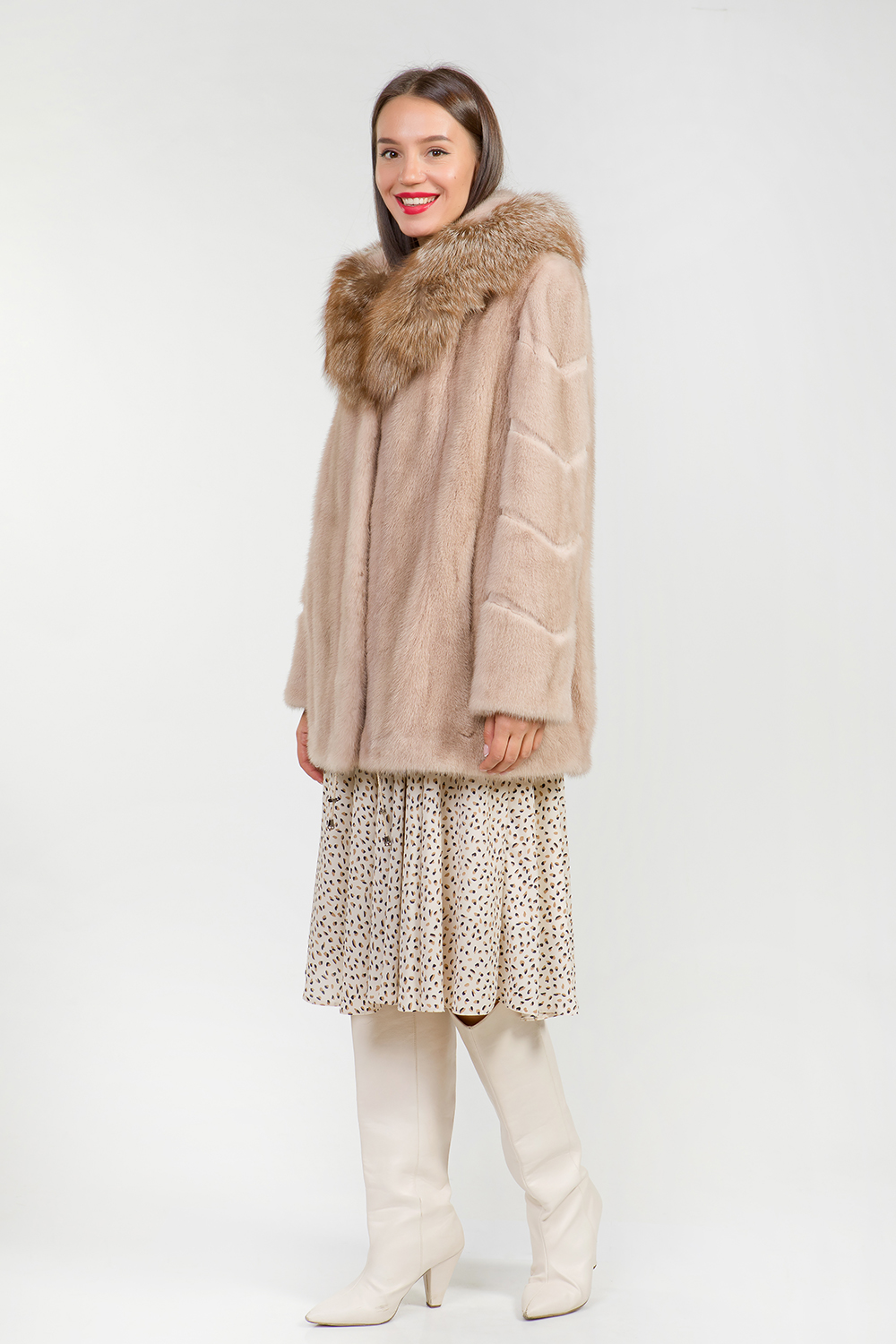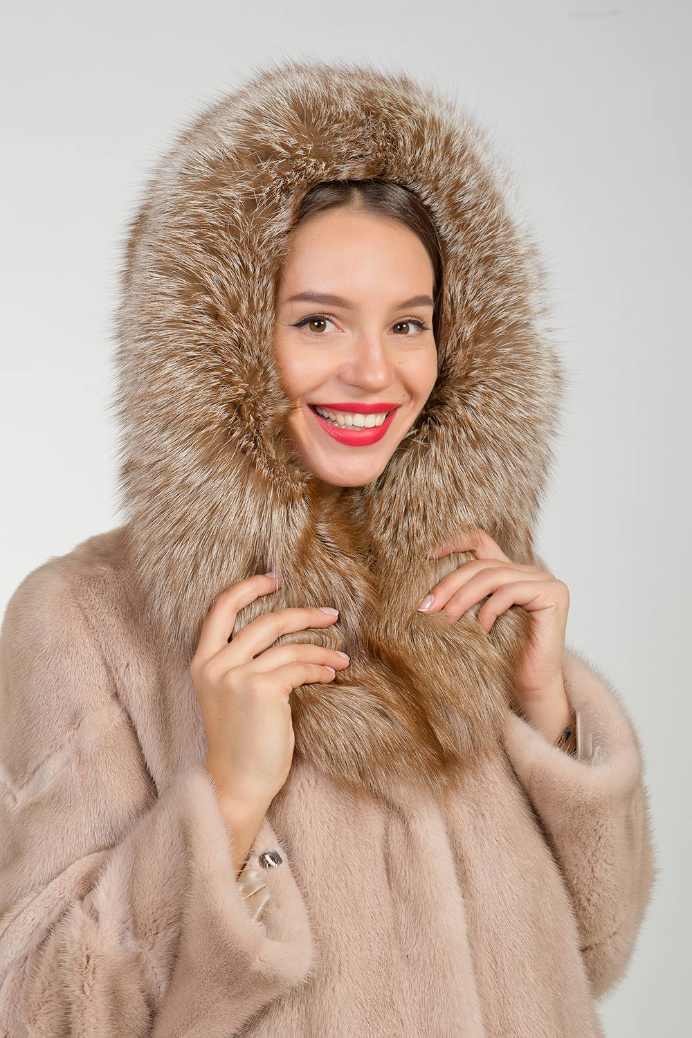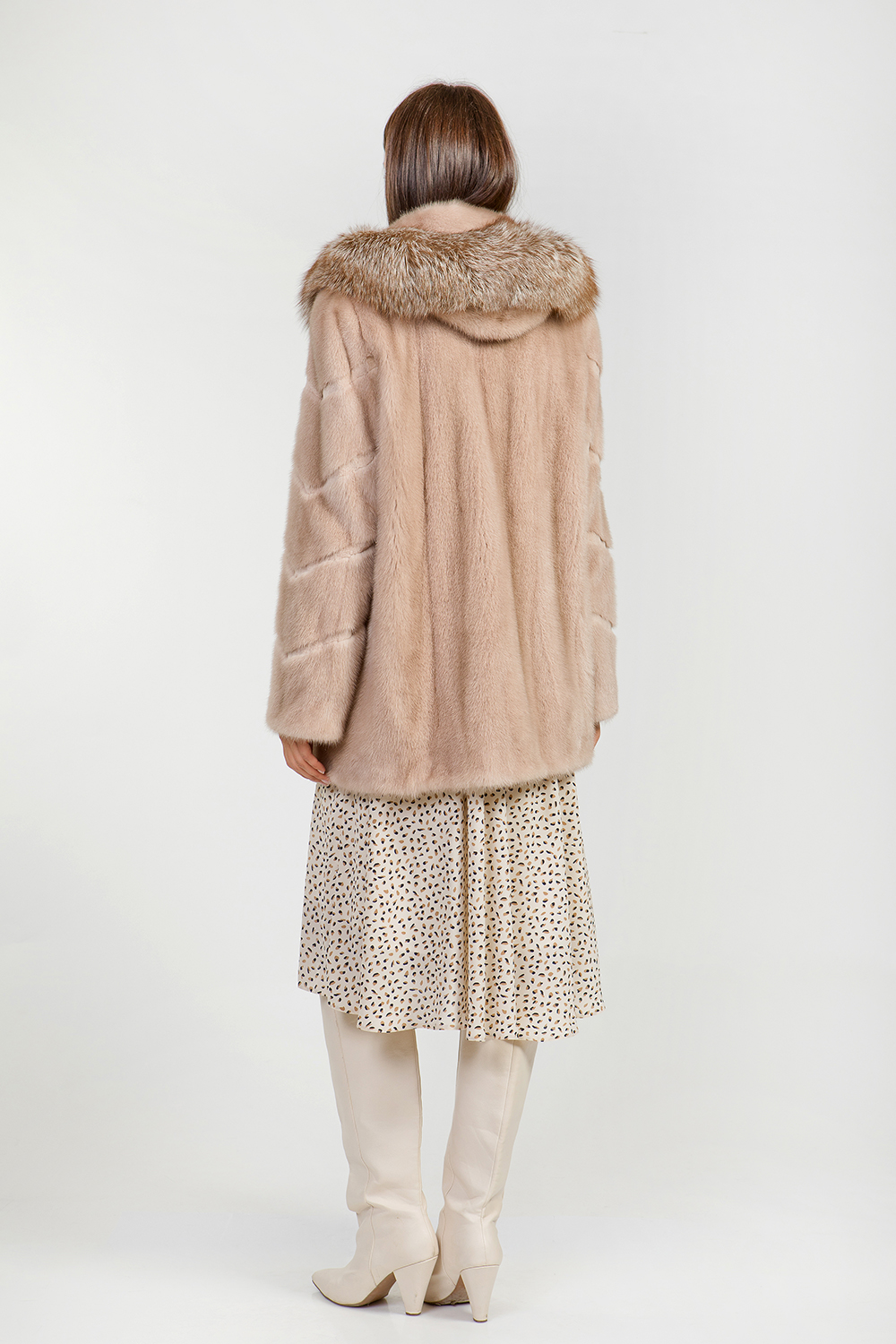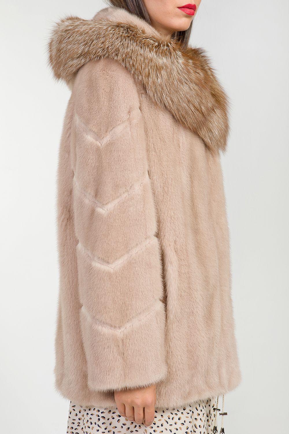 Куртка из норкового меха с капюшоном, украшенным лисьим мехом. Модель имеет свободный крой с вставками из пластин. Регулируемые утяжки на рукавах и по низу изделия обеспечивают идеальную посадку. Длина куртки составляет 80 см. Эта модель подходит для любого типа фигуры благодаря универсальному фасону. Нежный оттенок циркона придает образу свежесть и женственность.