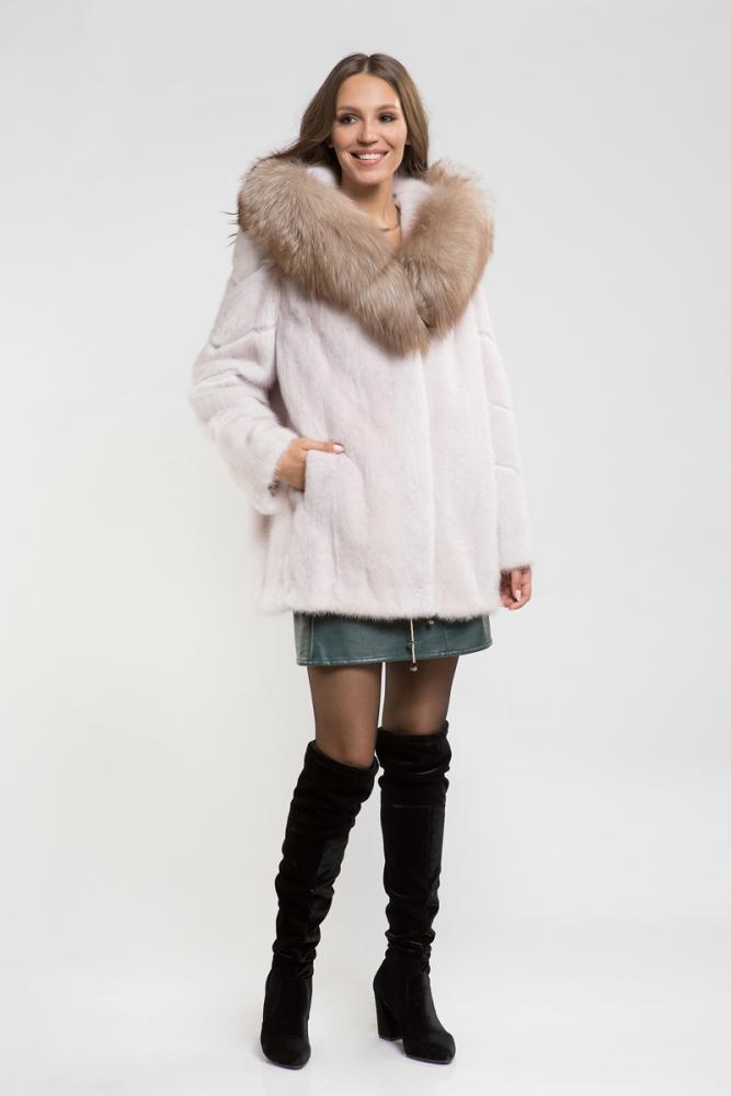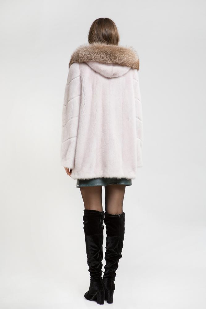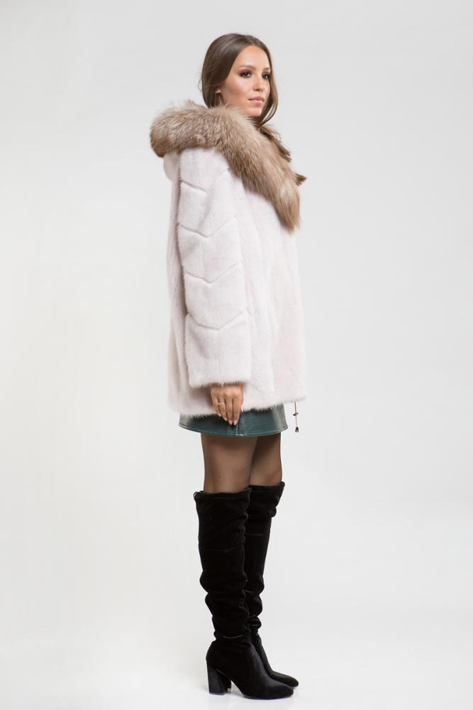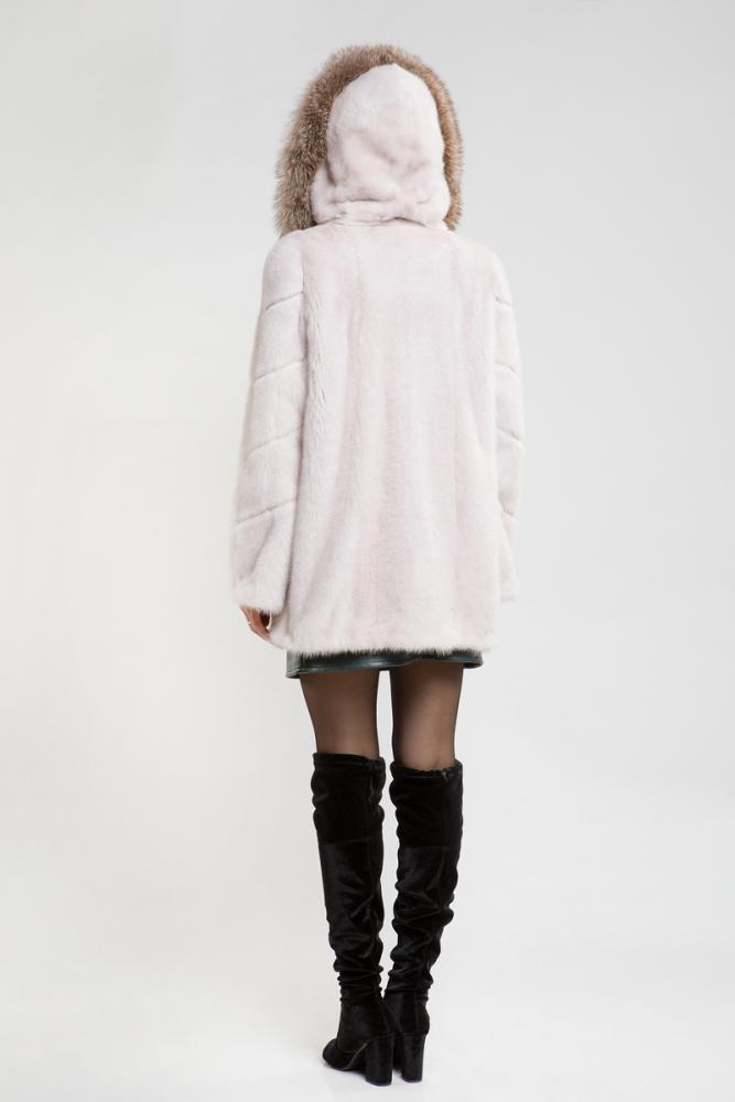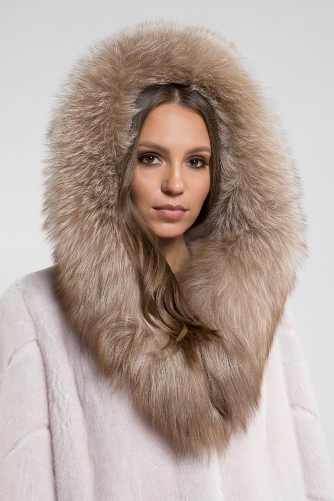 Норковая куртка с капюшоном, украшенным лисьим мехом. По краям и на рукавах предусмотрены утягивающие элементы для регулировки. Длина изделия составляет 80 см. Элегантный капюшон и роскошный мех этой шубы подчеркивают статус стильной и успешной женщины!