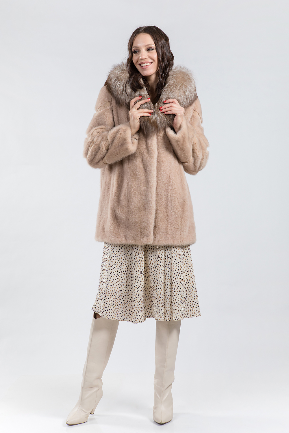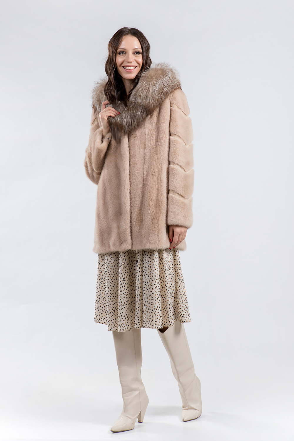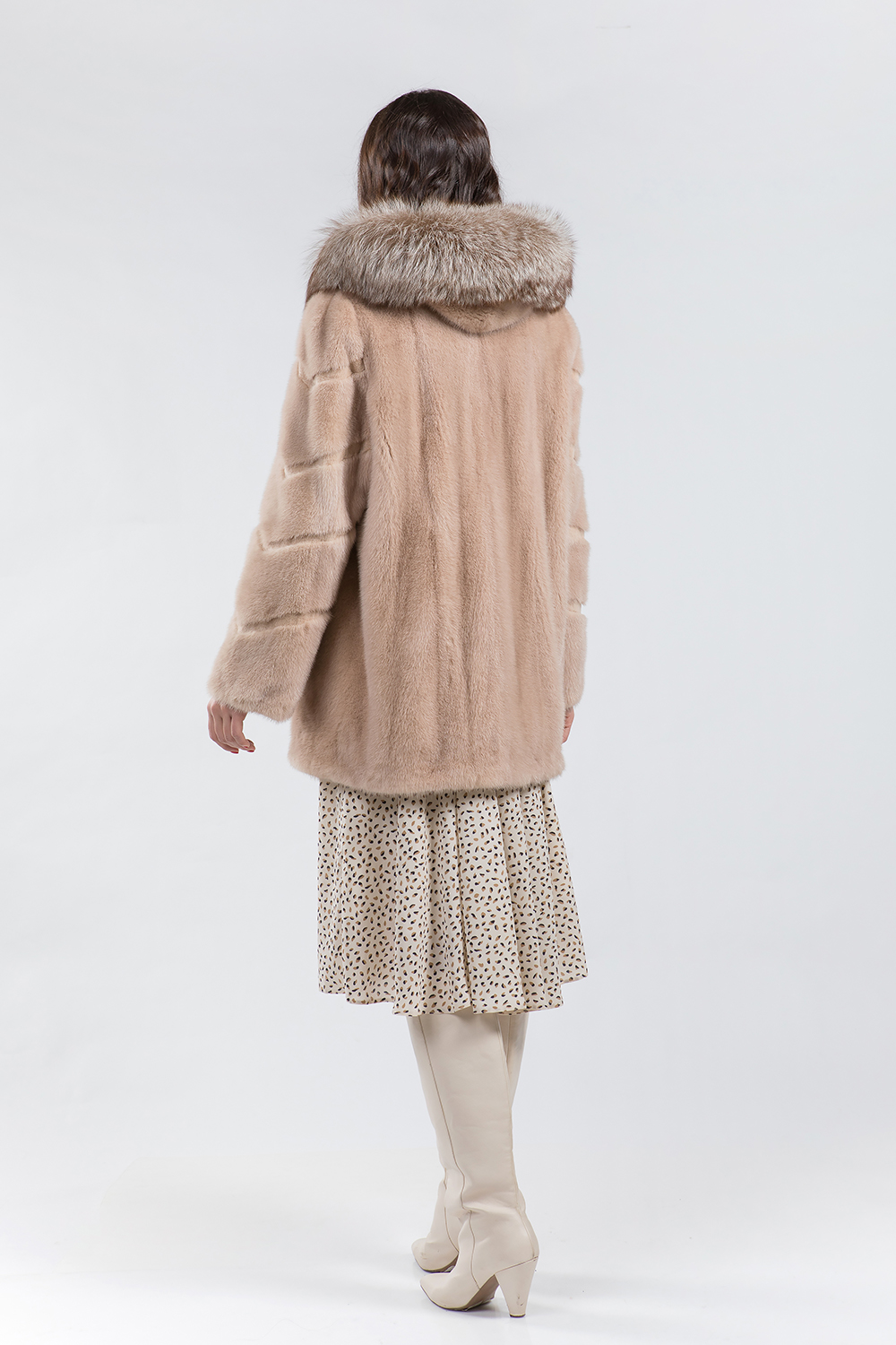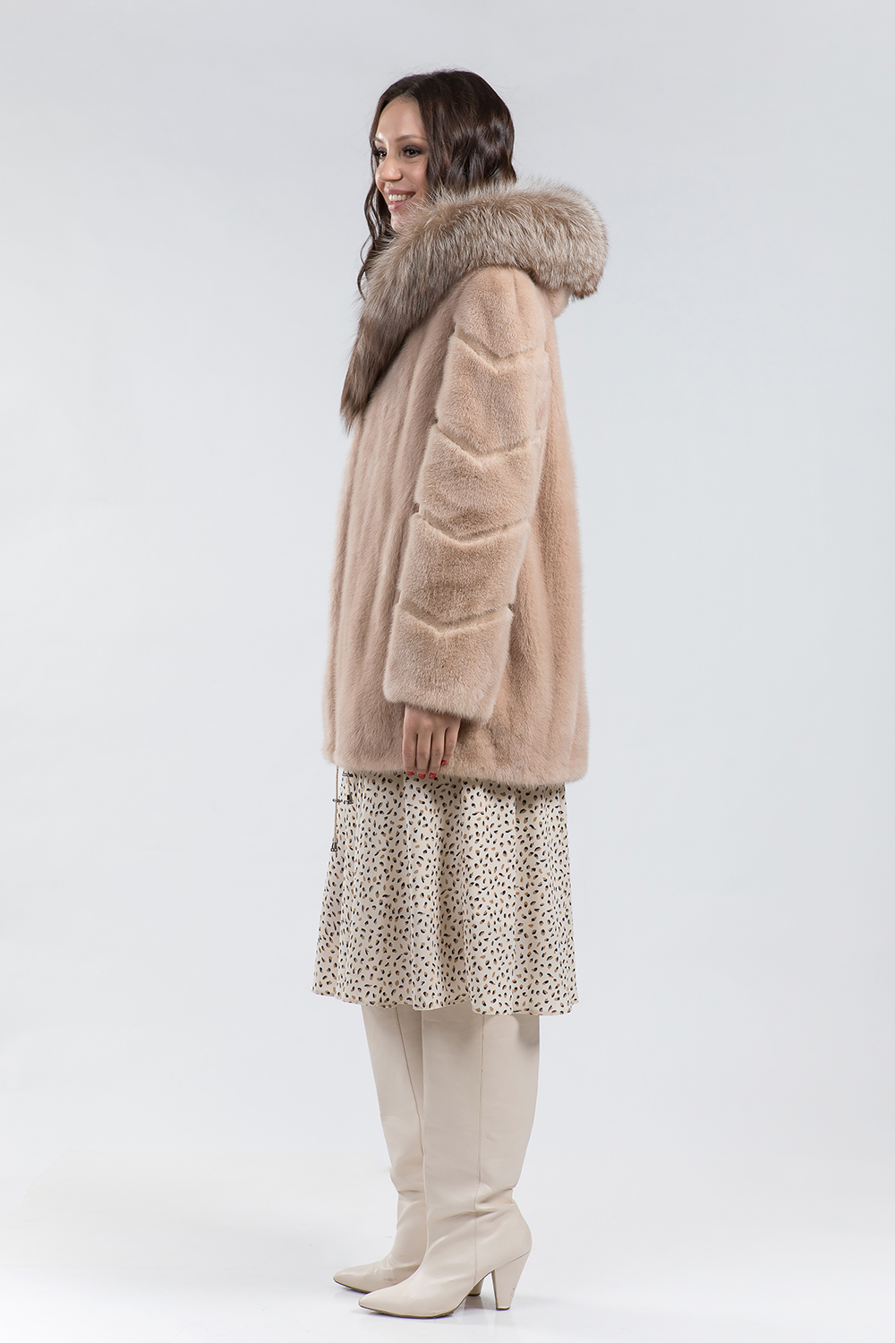 Норковая куртка с капюшоном, отороченным лисьим мехом. Модель выполнена в технике роспуска с добавлением пластин. Рукава украшены диагональной выстрижкой. В нижней части и на рукавах предусмотрены регулируемые утяжки. Длина куртки составляет 80 см. Она имеет универсальный крой, подходящий для любого типа фигуры. Нежный оттенок циркона придает образу свежесть и женственность.
