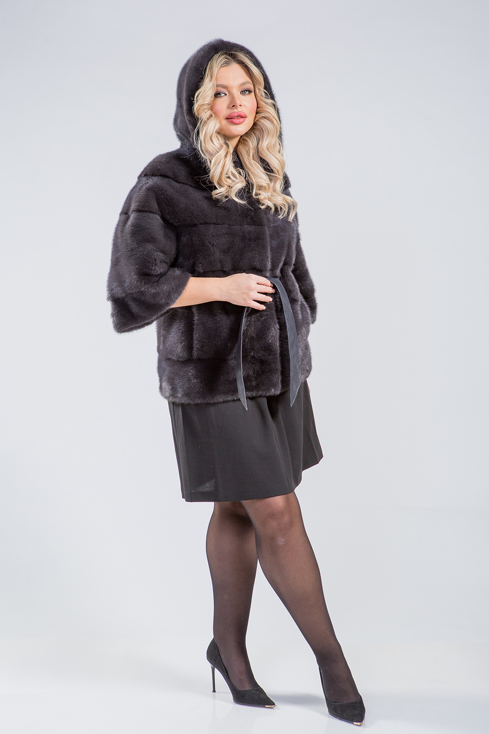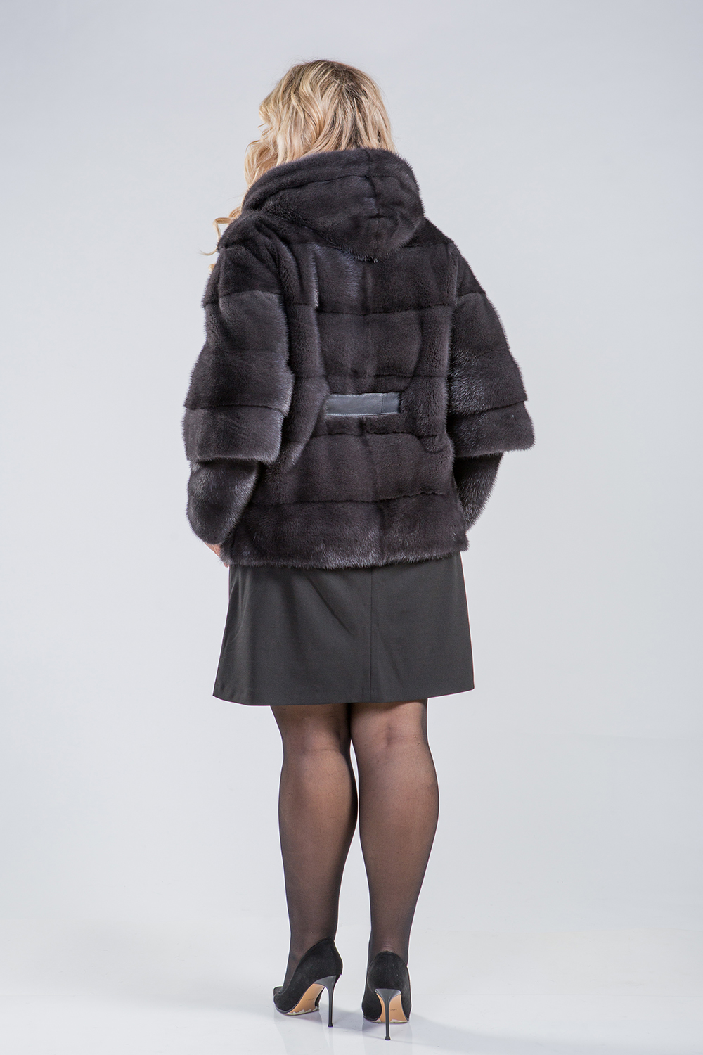 Куртка из норкового меха с капюшоном, скроенная по диагонали из отдельных пластин. Её рукава отстёгиваются и могут быть укорочены, что делает эту модель особенно функциональной. Длина изделия составляет 70 см.