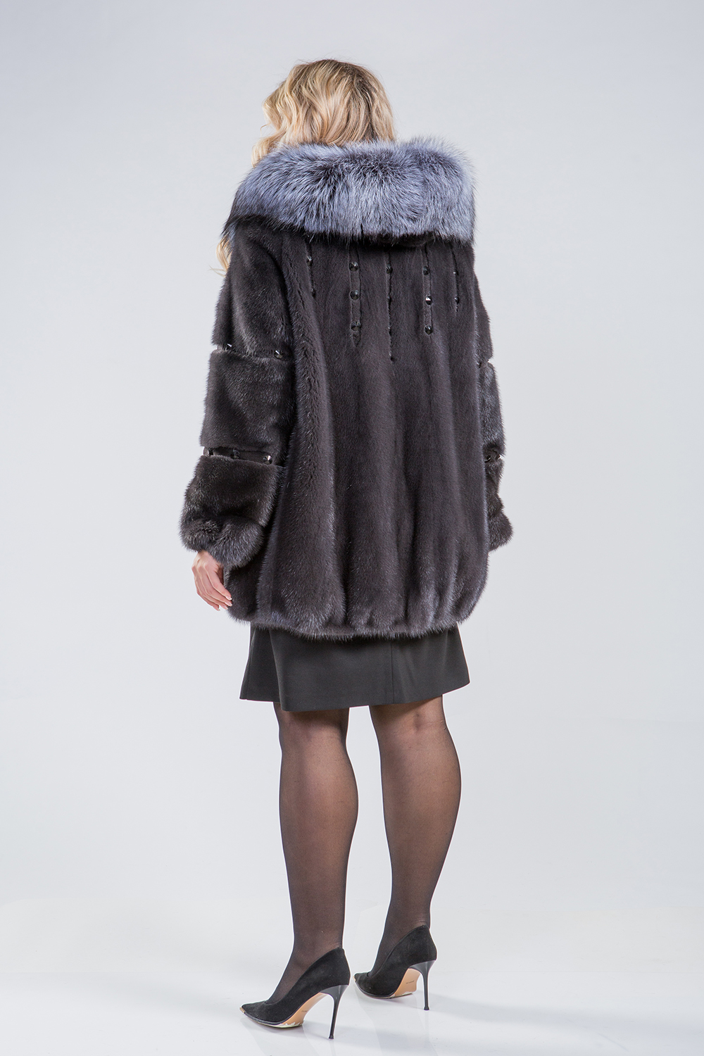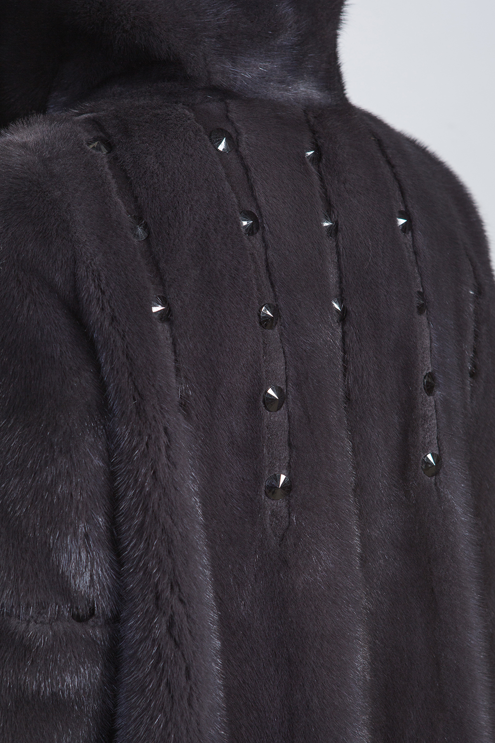 Эта очаровательная норковая курточка имеет капюшон, украшенный мехом чернобурой лисы. Крой изделия выполнен в технике роспуска с добавлением пластин. Рукава и спинка украшены выстрижкой и стразами, что придает модели особый шарм. Низ курточки и рукава слегка присборены. Длина изделия составляет 80 см, что делает его универсальным и подходящим для любого типа фигуры. А роскошный объёмный капюшон из лисы станет отличным решением для тех, кто не любит носить головные уборы!