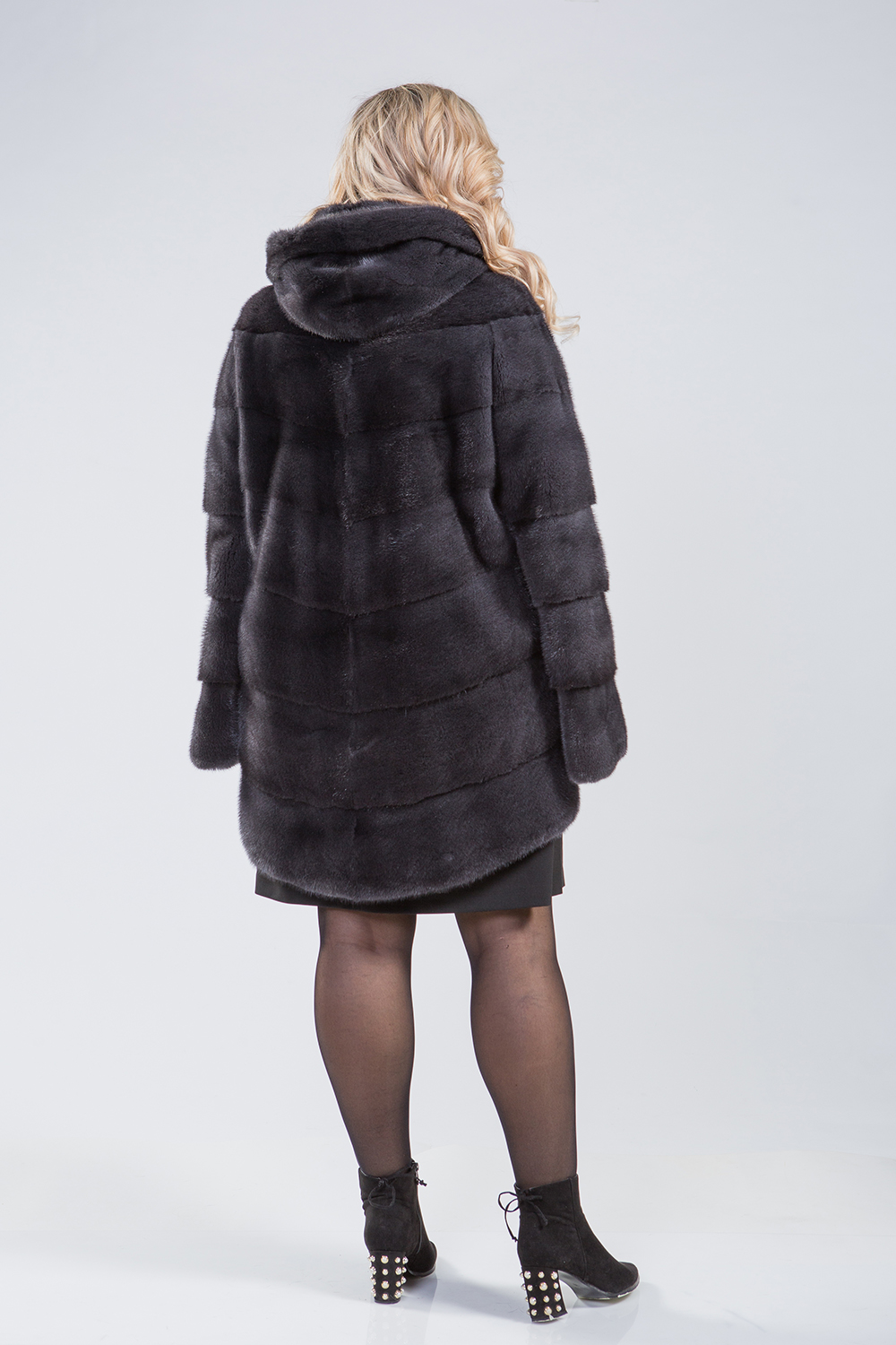 Куртка из меха норки с капюшоном. Крой изделия выполнен в слегка диагональной выкладке пластин. На рукавах и внизу модели предусмотрены регулирующие утяжки, которые позволяют превратить её в универсальную модель. При желании вы можете ослабить утяжки и получить классическую куртку. Длина изделия составляет 90 см.