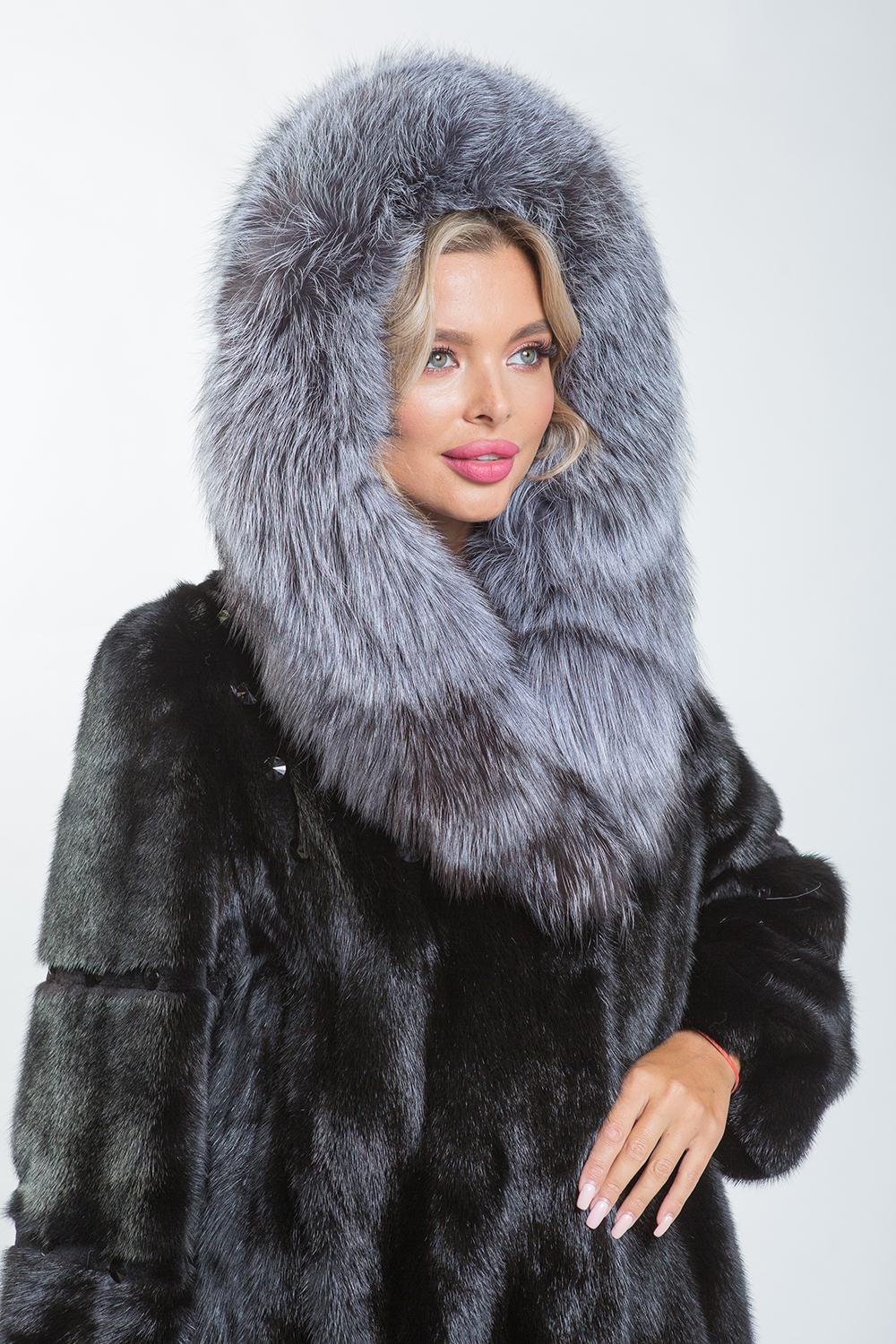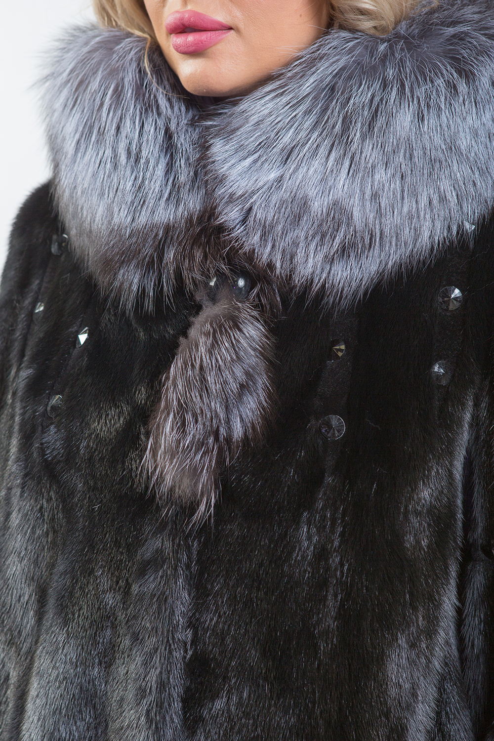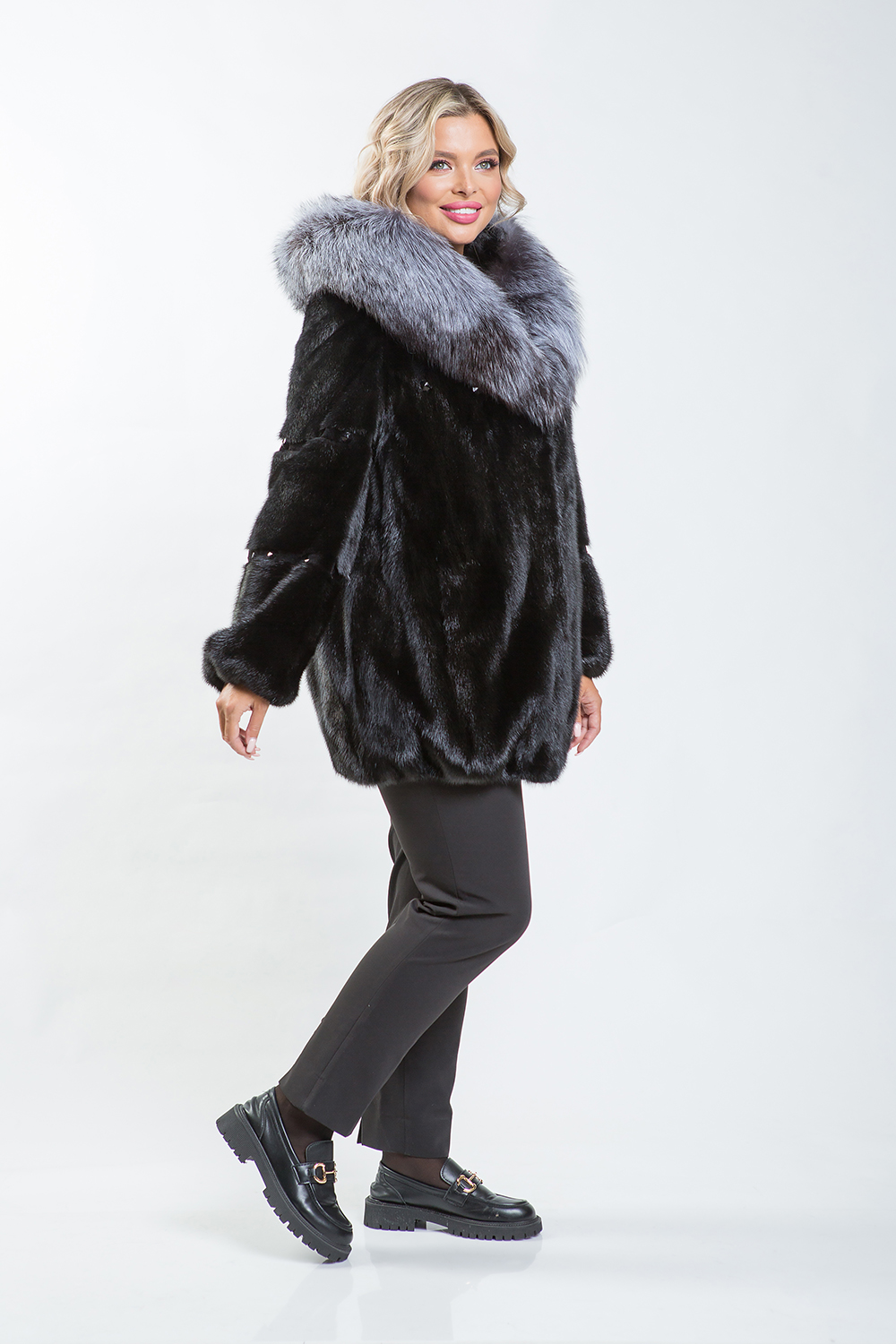 Эта курточка выполнена из меха норки, а капюшон украшен мехом чернобурой лисы. Модель кроится по технологии роспуска с добавлением пластин. Рукава и спинка украшены оригинальной выстрижкой и стразами. Низ куртки и рукава слегка присобраны. Длина изделия составляет 80 см.