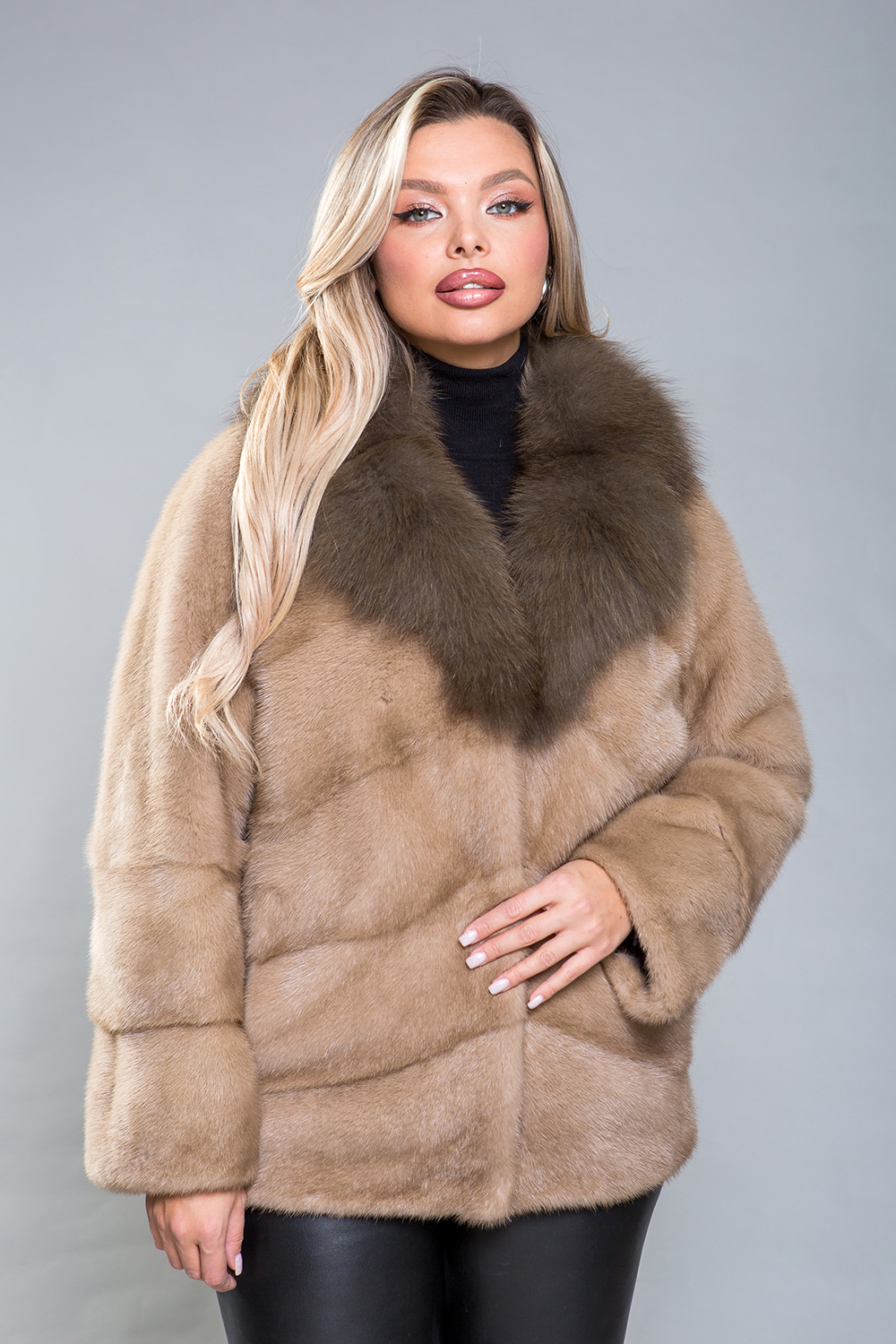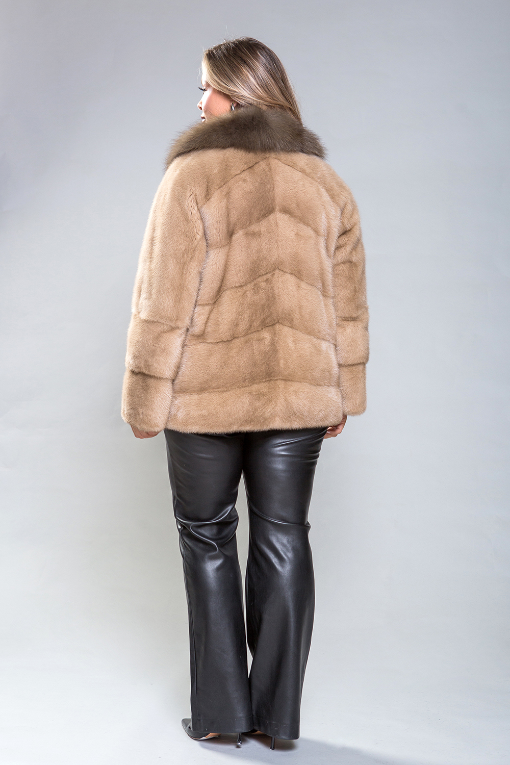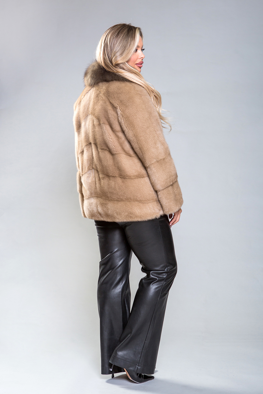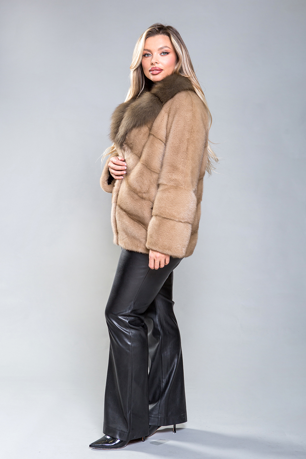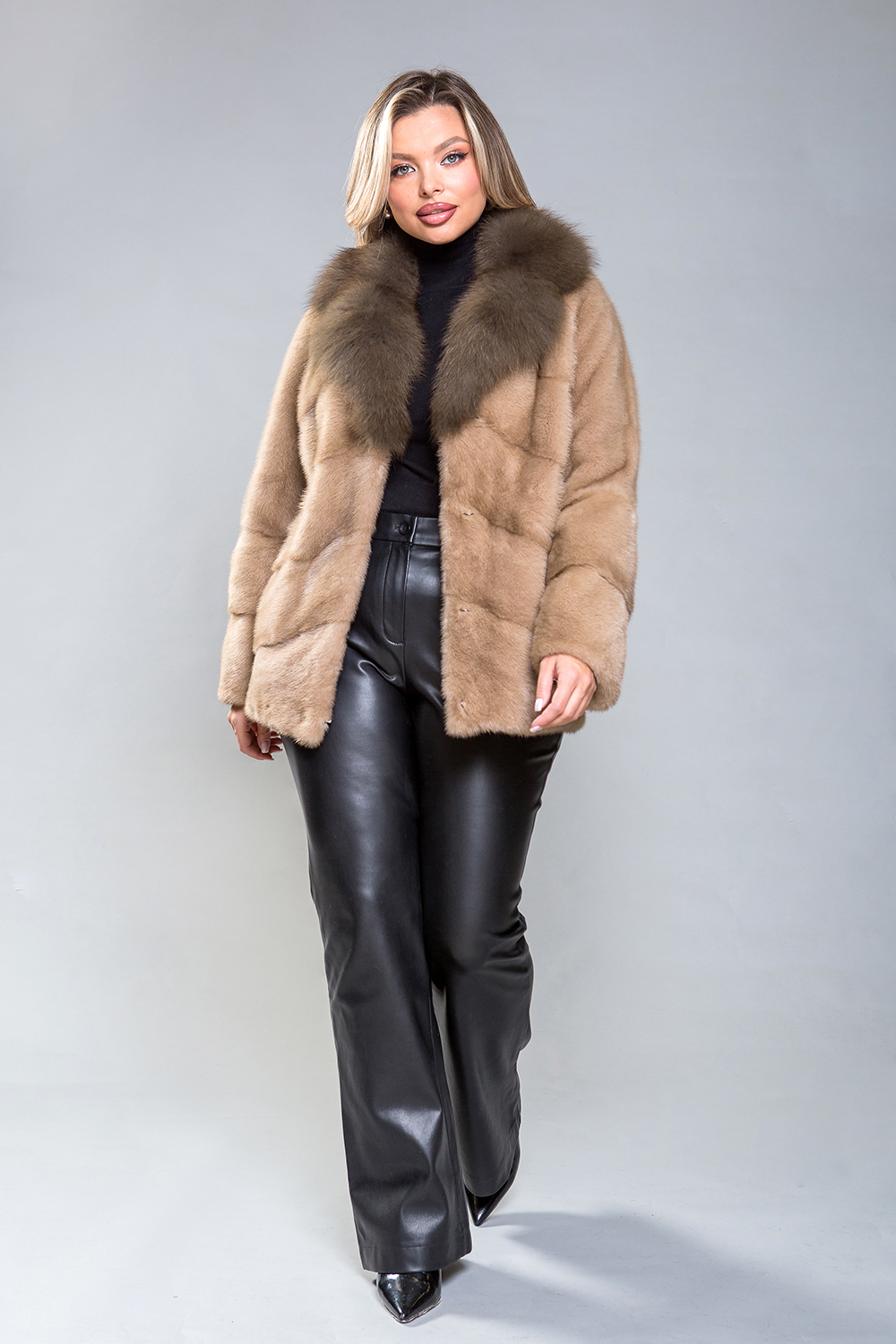 Норковая куртка с английским воротником из меха куницы. Воротник можно застегнуть на классический манер. Модель выполнена в технике диагональной выкладки пластин. Изделие регулируется утяжками на талии, рукавах и внизу. Длина куртки — 70 см. Она отлично сочетается с брюками любого кроя и юбками любой длины. Эта куртка универсальна, комфортна и уютна.