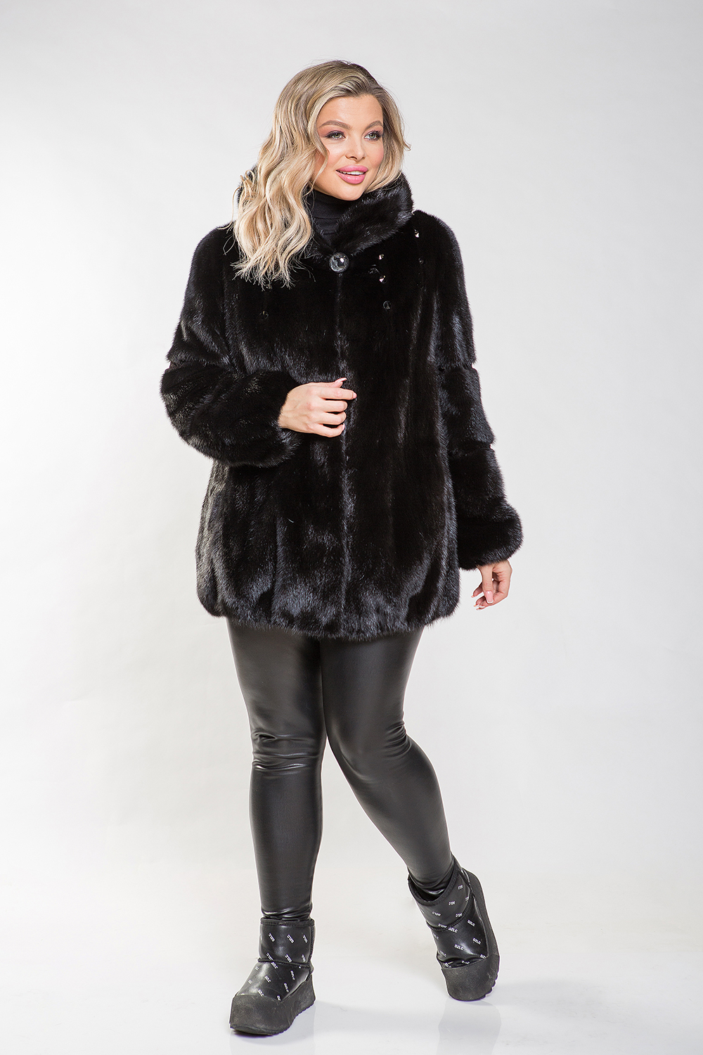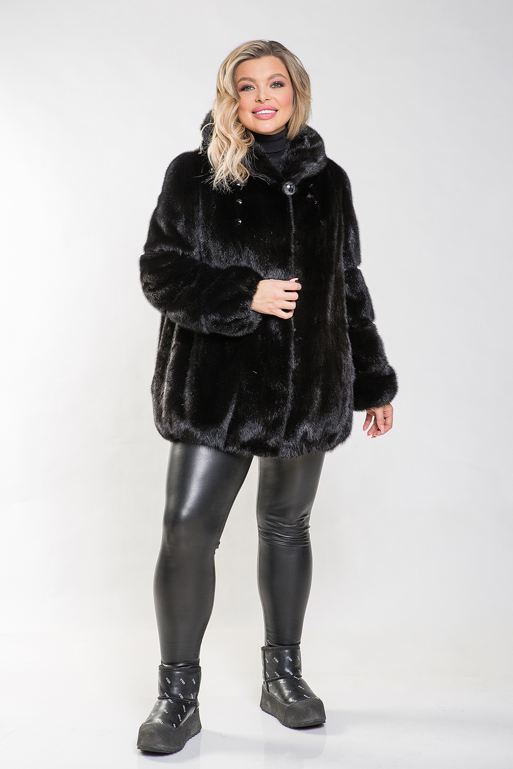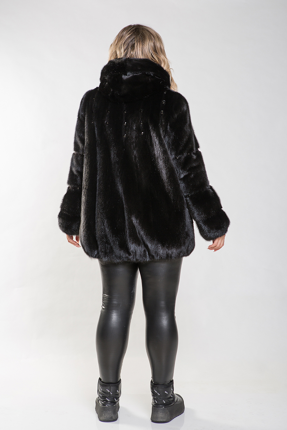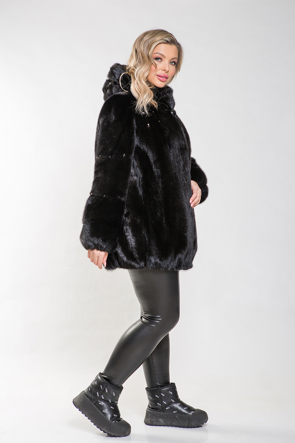Норковая курточка с капюшоном, выполненная в технике роспуска с использованием пластин. Эта модель отличается великолепным блеском благодаря выстрижке и стразам, украшающим рукава и спинку. Низ и рукава слегка присборены, что создает элегантный силуэт.