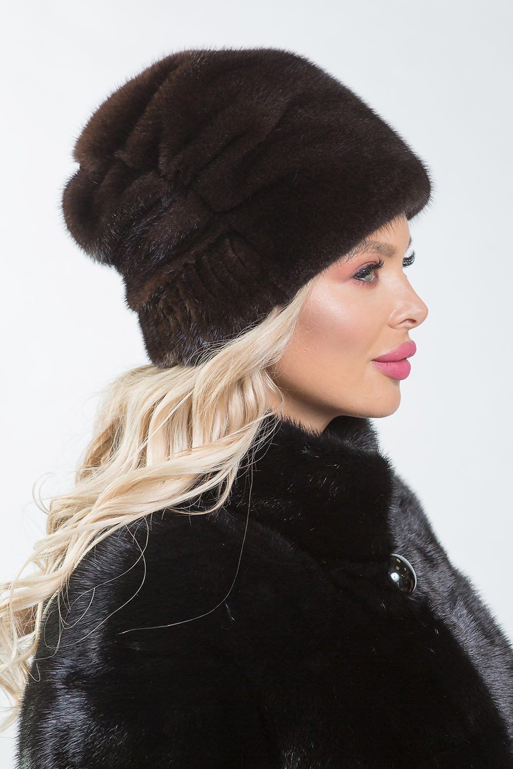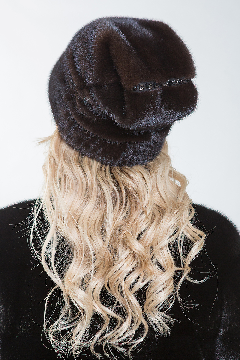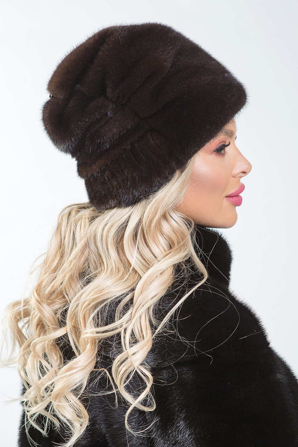 Шапка женская из меха норки. Модель внутри оснащена регулирующей резинкой, чтобы шапочка могла подойти на несколько размеров. Изделие декорировано сзади бусинками и стеклярусами. Модель универсальная и теплая, ее легко можно свернуть и положить в женскую сумочку. Она не займет много места и не потеряет форму. Шапочка великолепного цвета шоколада подойдет к любому меховому пальто и будет согревать в морозную погоду!