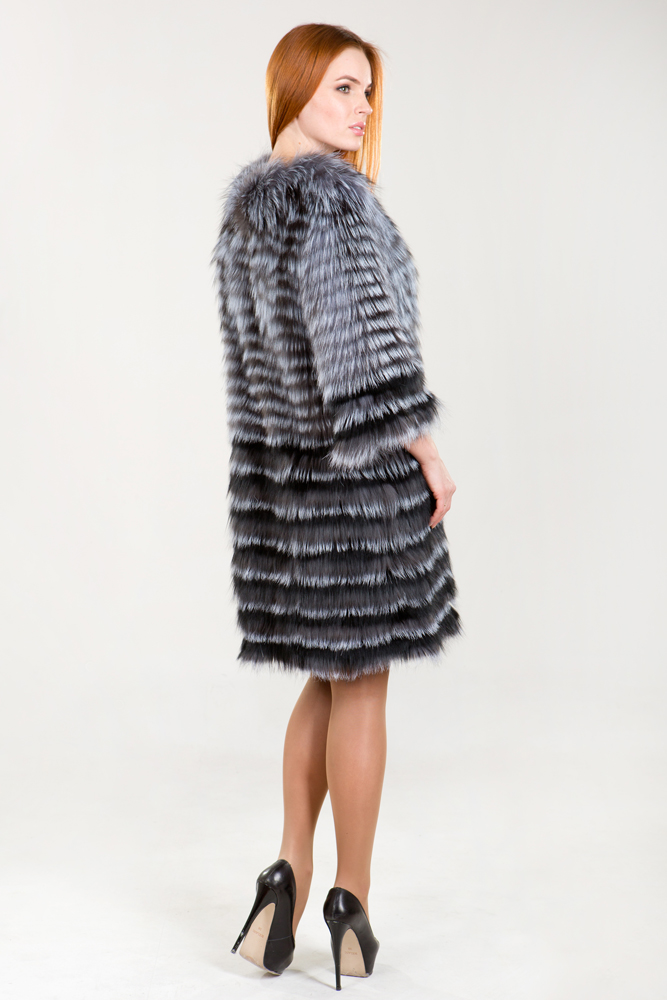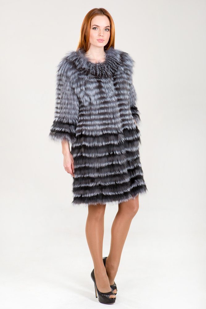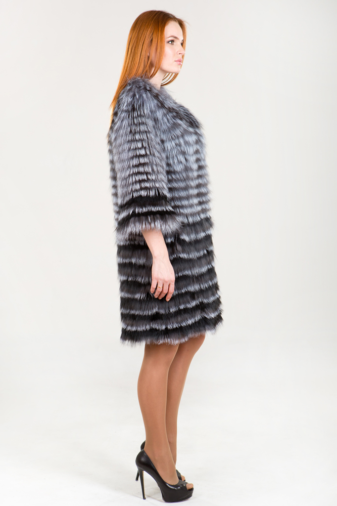 Оригинальное полупальто из меха чернобурой лисы на трикотажной основе. Классическая прямая модель. Рукава укорочены, что позволяет носить меховое пальто с длинными перчатками и митенками.