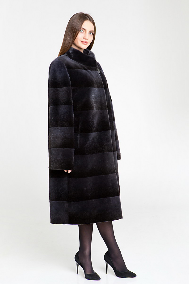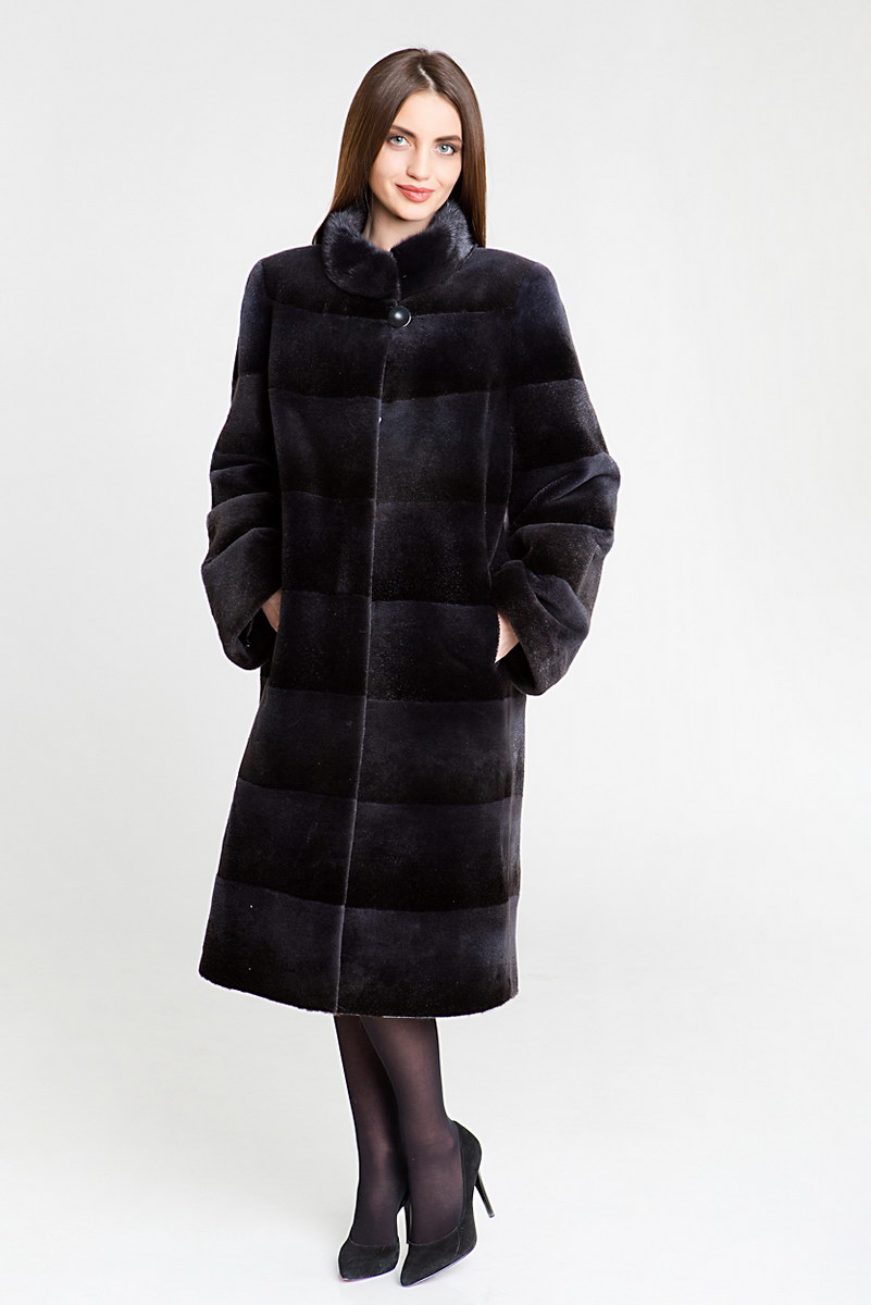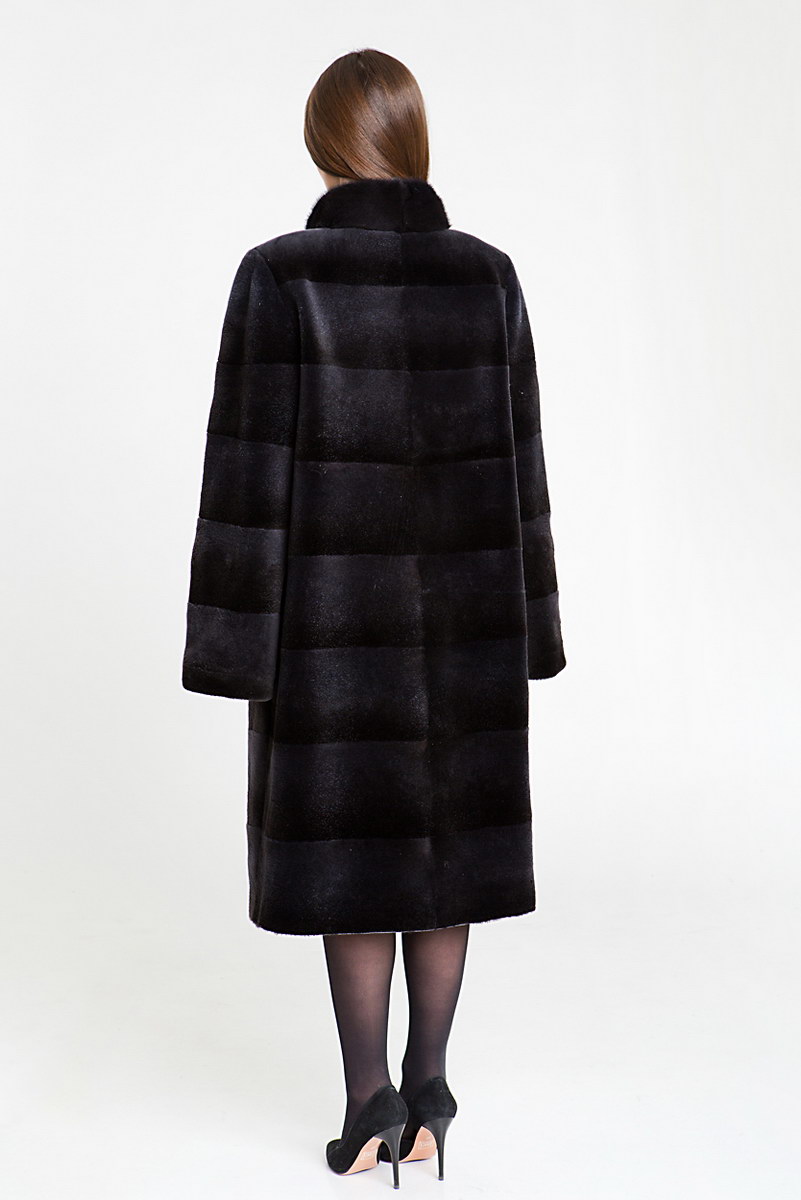 Полупальто из меха стриженой нутрии. Крой изделия поперечная выкладка пластин. Лаконичный дизайн, длина миди и воротник стойка гармонично сочетаются между собой и создают красивый силует.