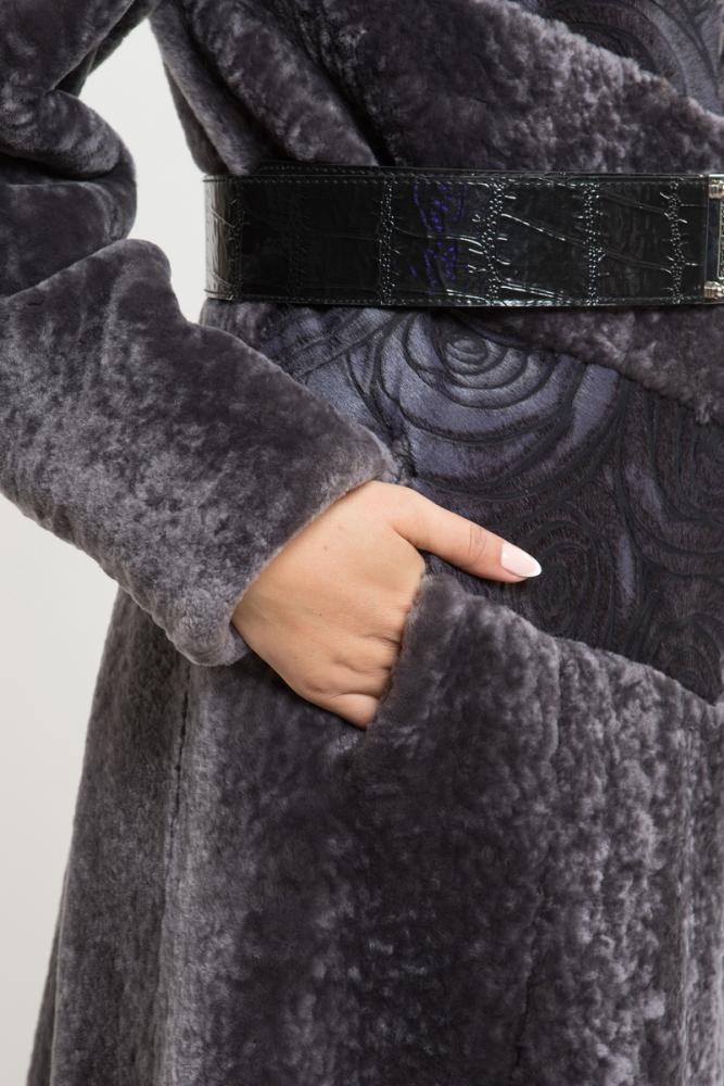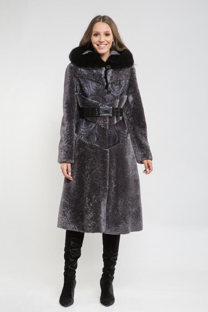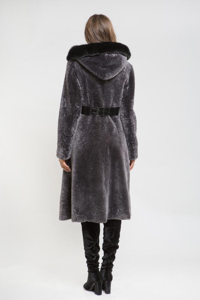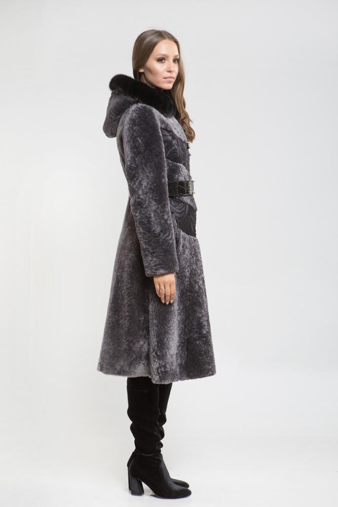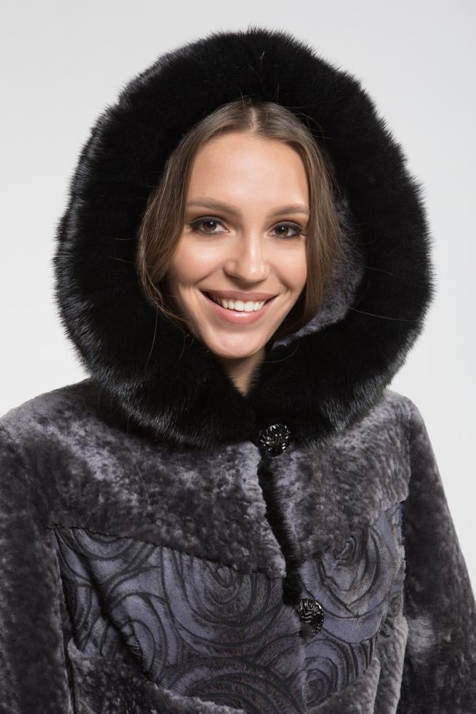 Полупальто из меха овчины. Капюшон изделия дополнен мехом норки. Очень интересно смотрятся выстриженные геометрические линии на меховом полотне из пони. Приталенный крой шубки прекрасно подчеркивает женскую стройность.