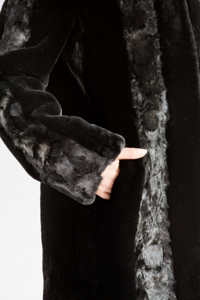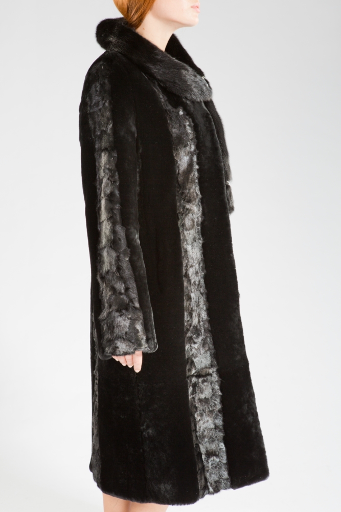 Полупальто из меха овчины. Воротник модели дополнен мехом норки и фиксируется декоративной клипсой. Длина изделия 110 см. Шубка декорирована вставками из меха норки. Рукава модели могут подворачиваться, образуя манжеты. Эта элегантная модель для ценительниц строгого классического стиля!