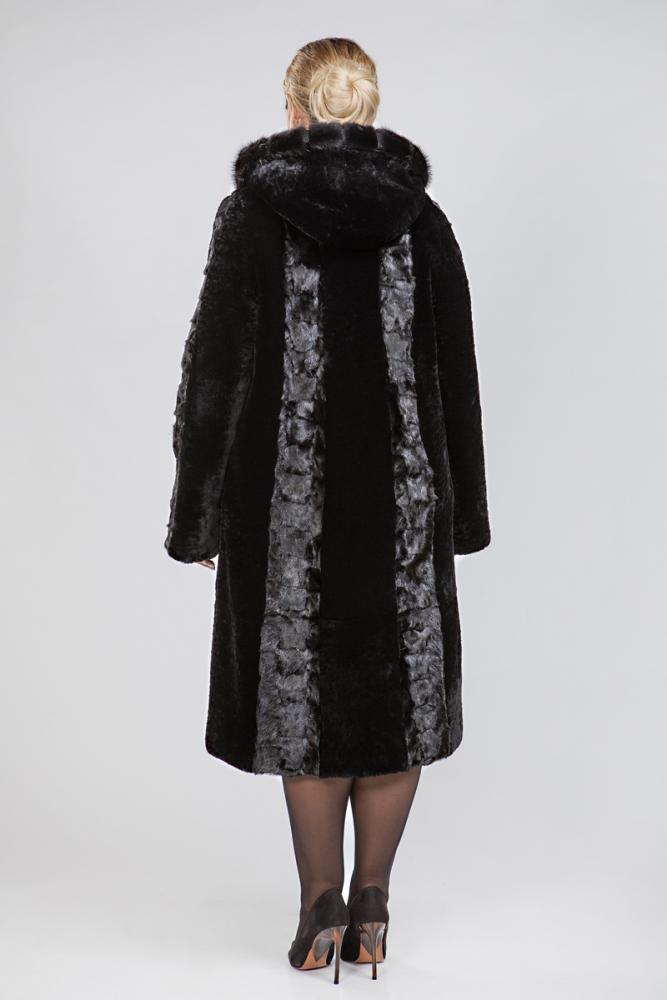 Полупальто из меха овчины. Капюшон модели дополнен мехом норки и фиксируется декоративной клипсой. Длина изделия 110 см. Шубка декорирована вставками из меха норки. Рукава модели могут подворачиваться, образуя манжеты. Шубка очень теплая, практичная и комфортная!