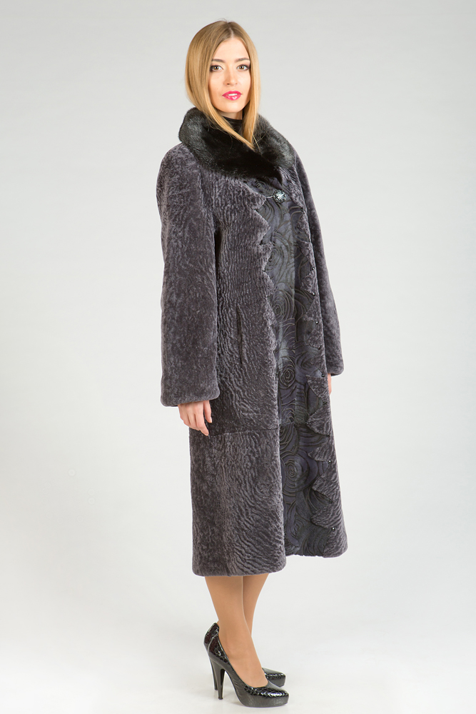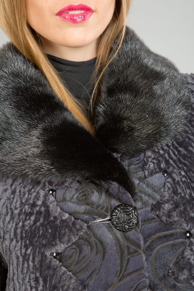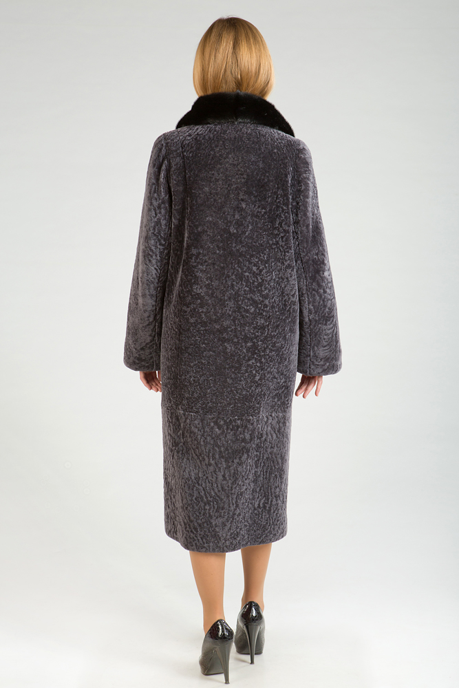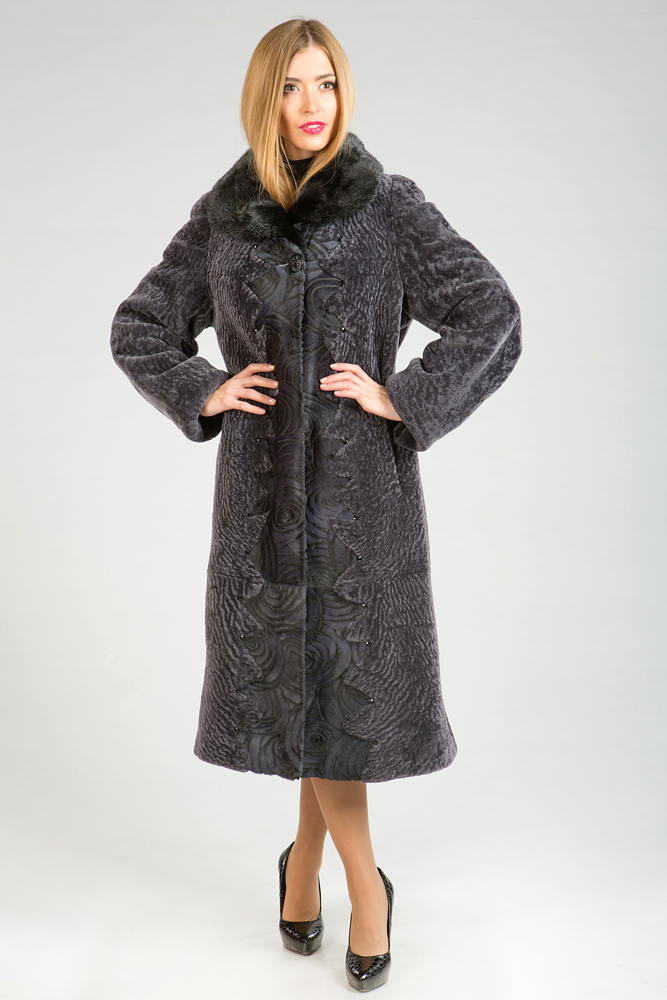 Полупальто из меха овчины ( астрагана). Воротник изделия дополнен мехом норки. Борта изделия выполнены из натуральной кожи. Перед модели декорирован мехом пони. Застегивается шубка на клипсы и пуговицу. Длина изделия 110 см. Шубка благородного цвета муссона обладает эстетическими достоинствами. Классический стиль модели никогда не выйдет из моды!