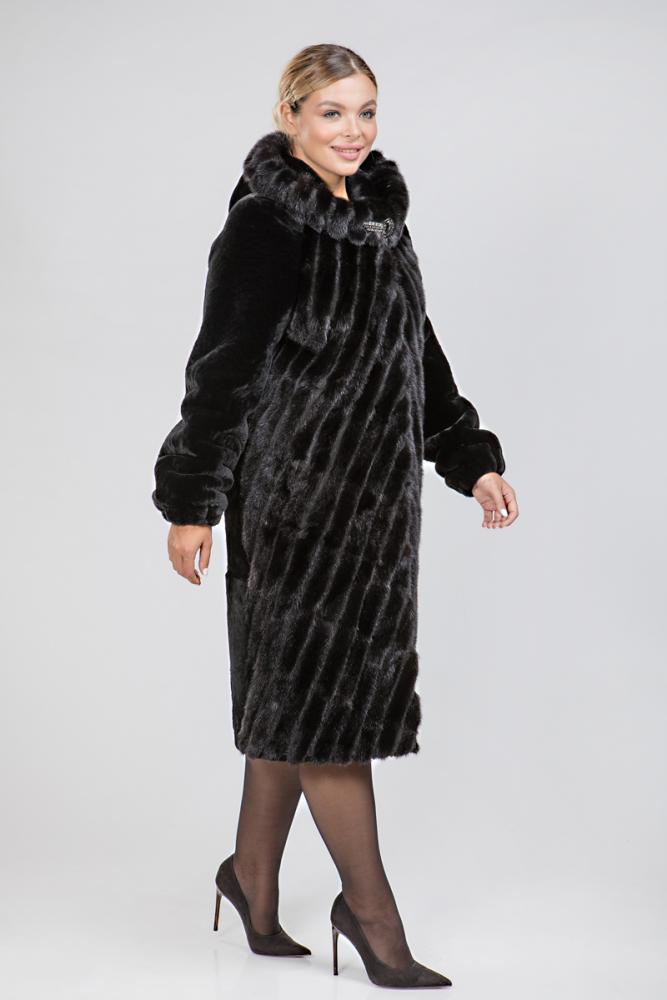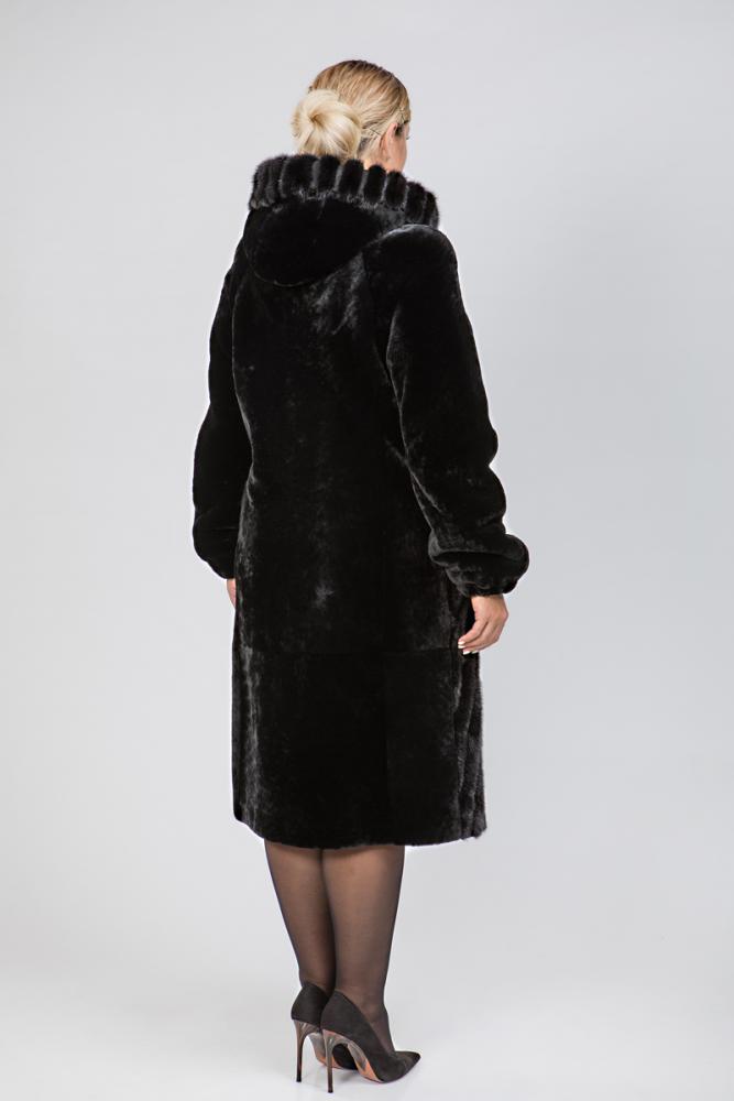 Полупальто из меха овчины. Капюшон модели дополнен мехом норки и фиксируется декоративной клипсой. Длина изделия 105 см. Перед шубки полностью декорирован раскладкой меха норки и натуральной замши. Такая теплая и оригинальная шубка способна подчеркнуть привлекательность дамы!