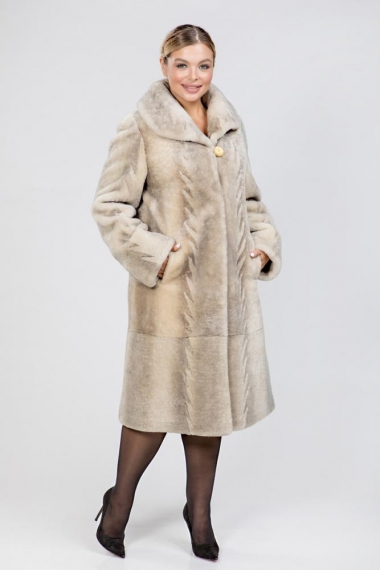 Полупальто из меха овчины. Воротник модели дополнен мехом норки. Изделие застегивается на пуговицы. Длина модели 110 см. Перед изделия декорирован фигурной выстрижкой. Такая теплая и элегантная шубка для ценительниц строгого классического стиля.