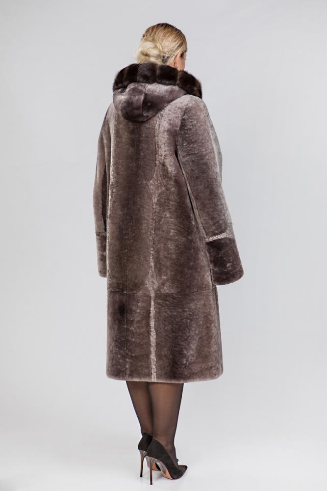Полупальто из меха овчины. Капюшон модели дополнен мехом норки. Модель слегка расклешена. Изделие застегивается на клипсы. Шубка декорирована фигурной выстрижкой. Рукава модели могут подворачиваться, образуя манжеты. Длина изделия 110 см. Такая элегантная модель для ценительниц строгого классического стиля! Очень теплая и комфортная шубка!