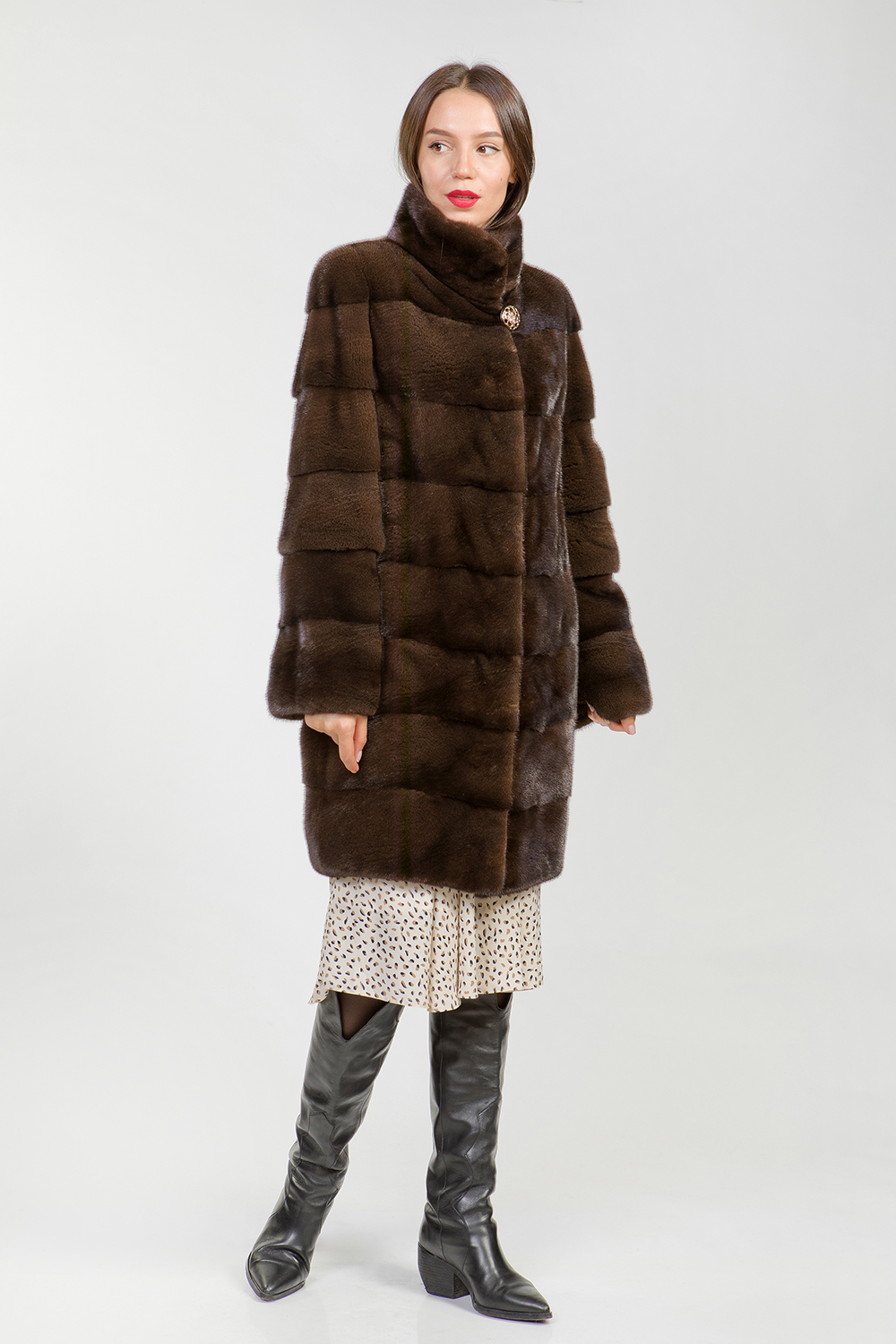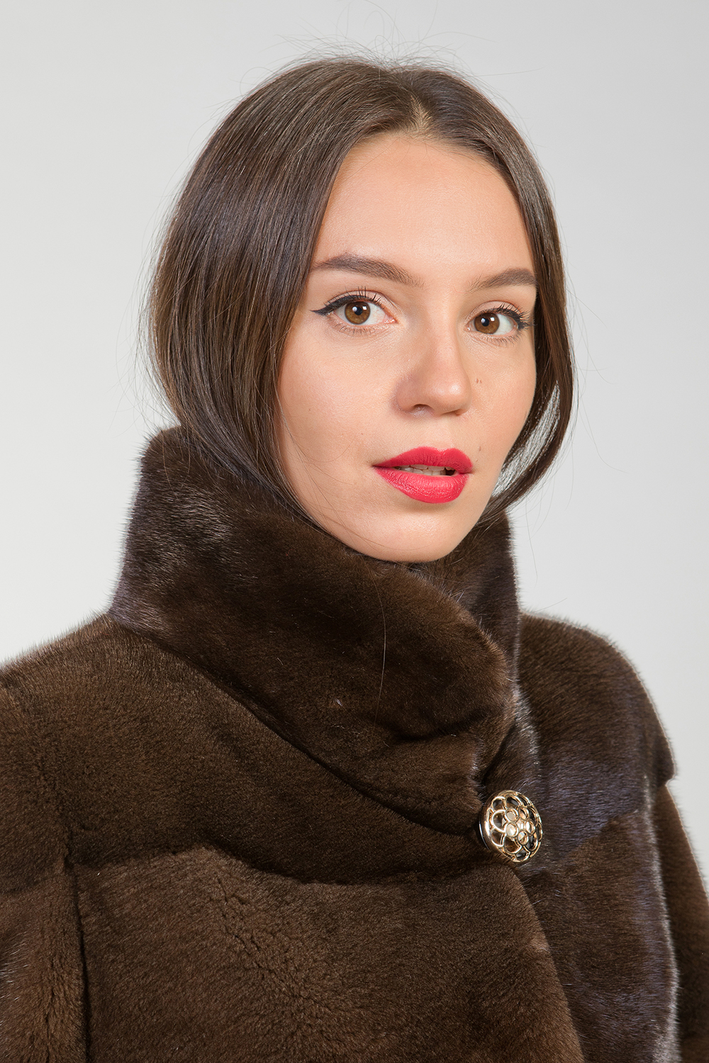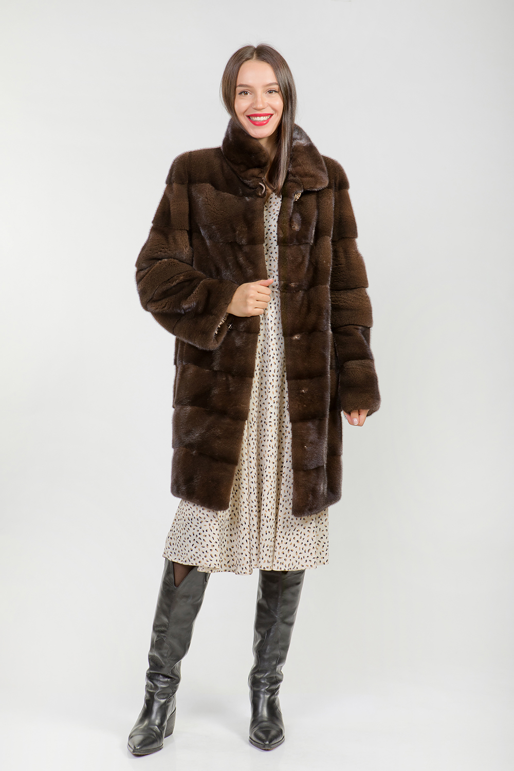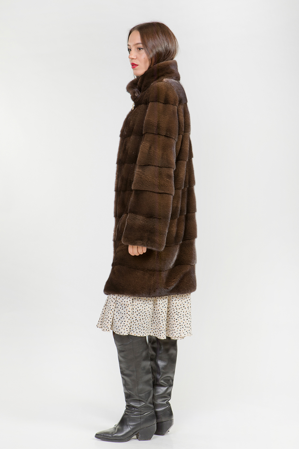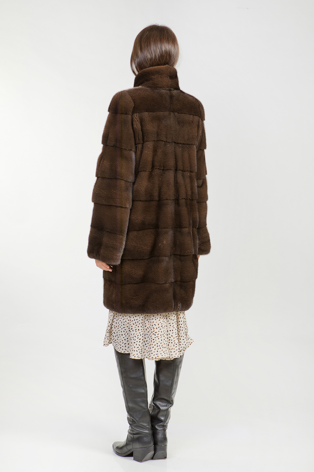 Полупальто из меха норки с воротником-стойкой. Крой изделия выполнен из поперечно уложенных пластин. Длина полупальто составляет 95 см. Простой прямой силуэт и великолепный мех придают этой шубке утонченность и уникальность.