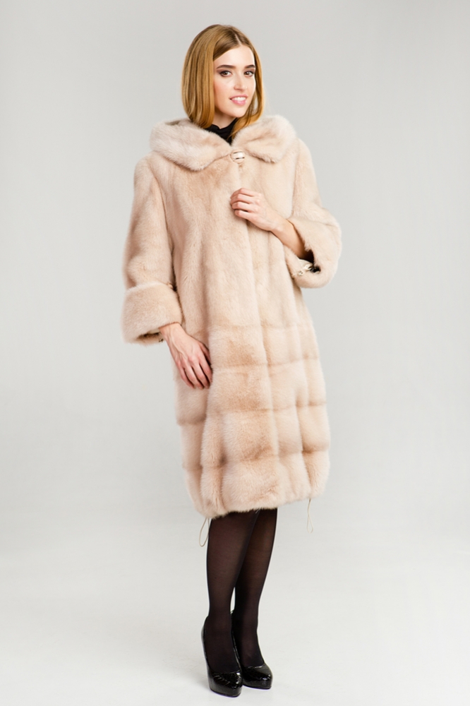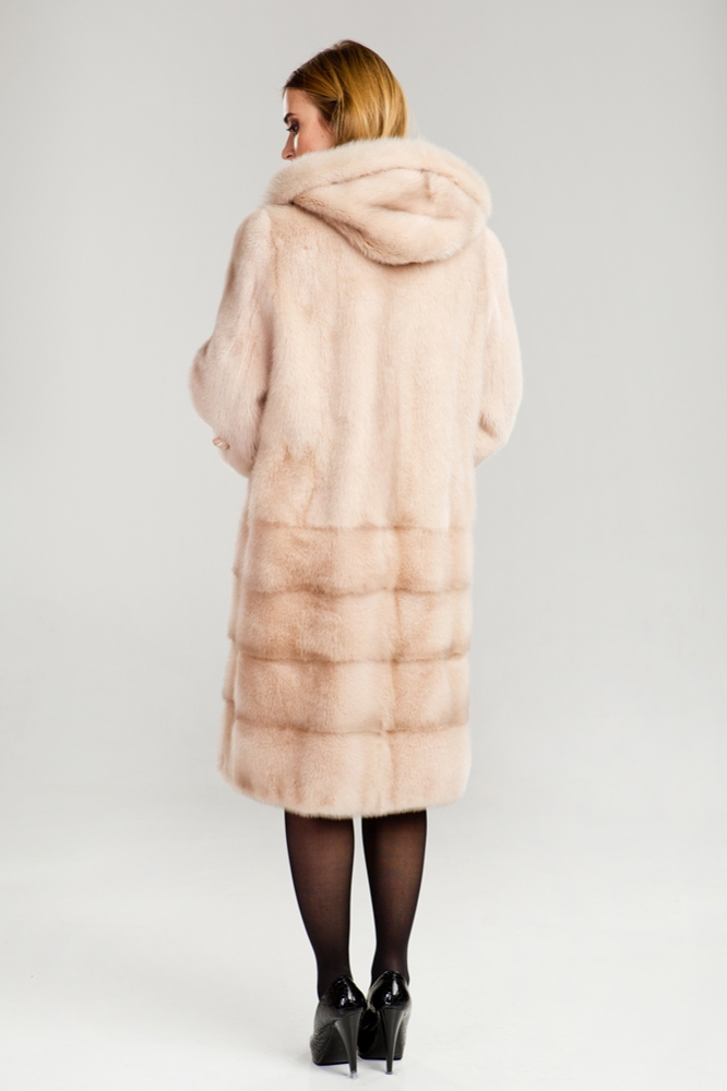 Полупальто из норкового меха с капюшоном. По низу изделия выполнена поперечная выкладка пластин. Длину рукавов можно регулировать, делая их короче. В такой уютной и стильной шубе вы будете выглядеть элегантно и оригинально!