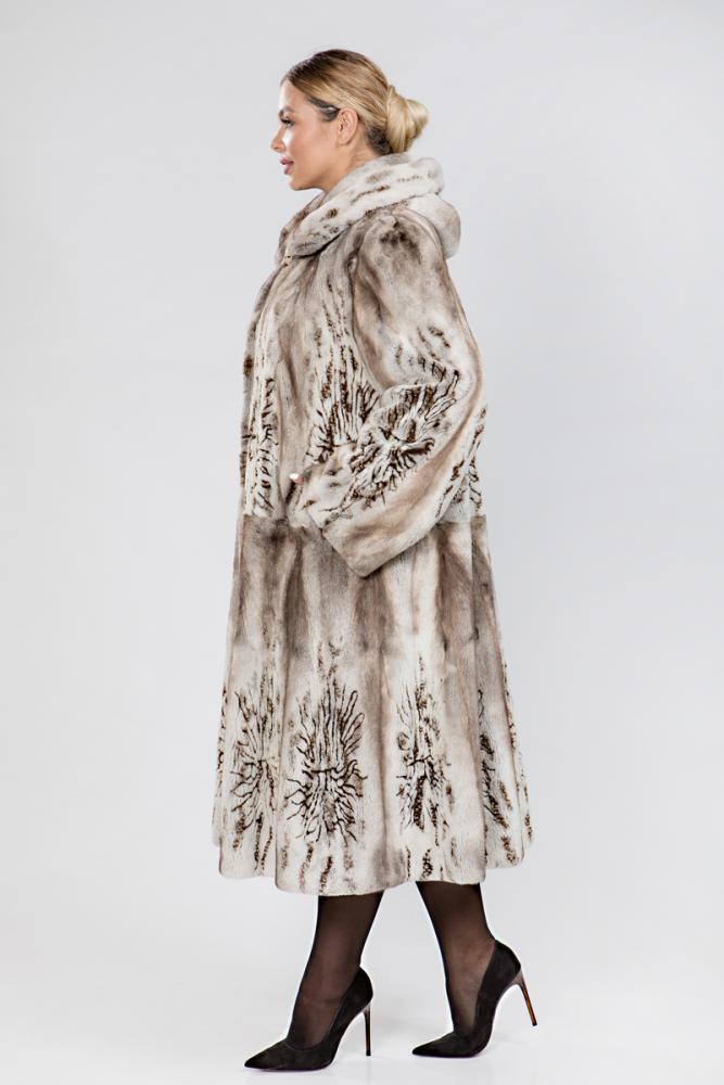 Полупальто из меха стриженной норки с капюшоном. Крой изделия роспуск с добавлением пластин. Внутри модели имеется регулирующая утяжка. Длина изделия 120 см. Меховое пальто декорировано лазерной выстрижкой. Юбка модели к низу имеет большой клеш, поэтому шубка смотрится шикарно!