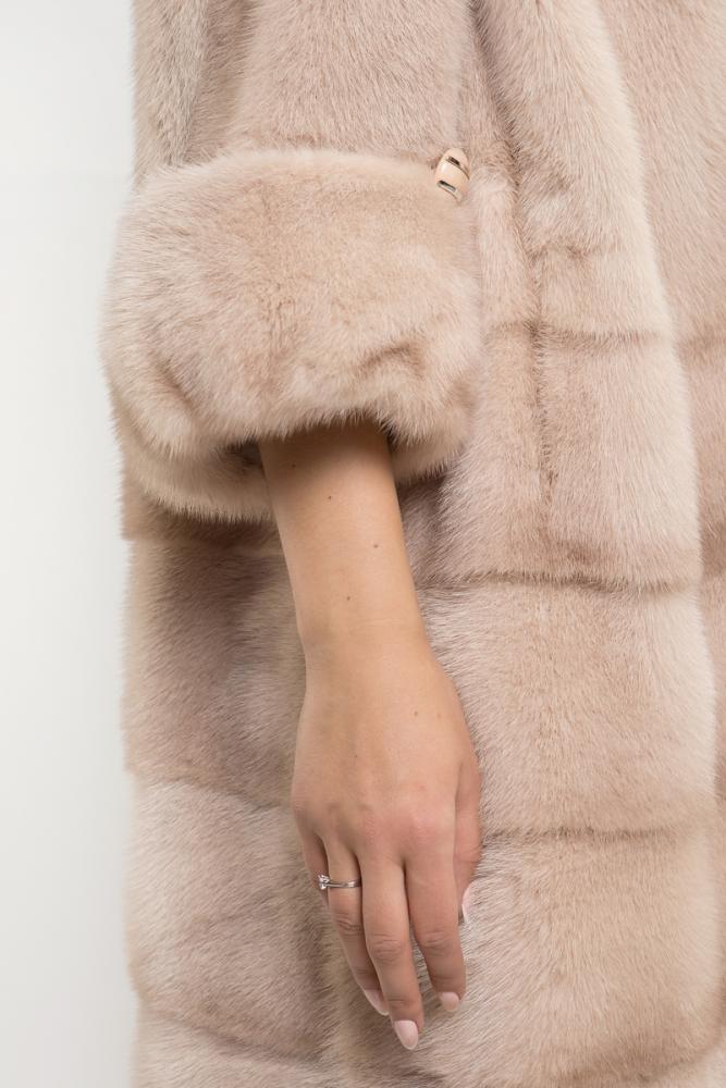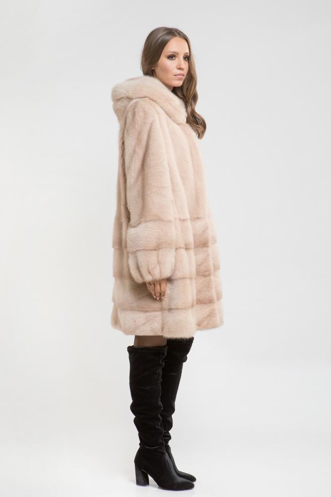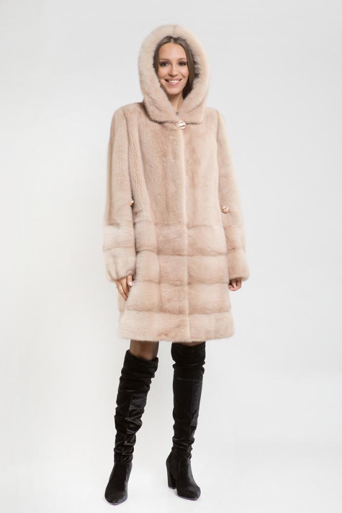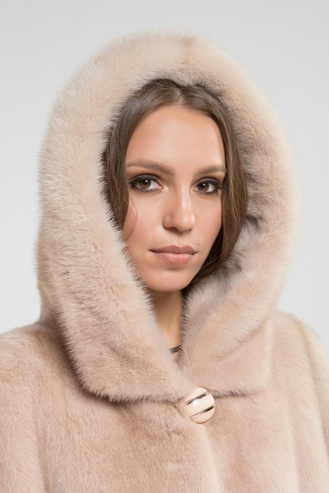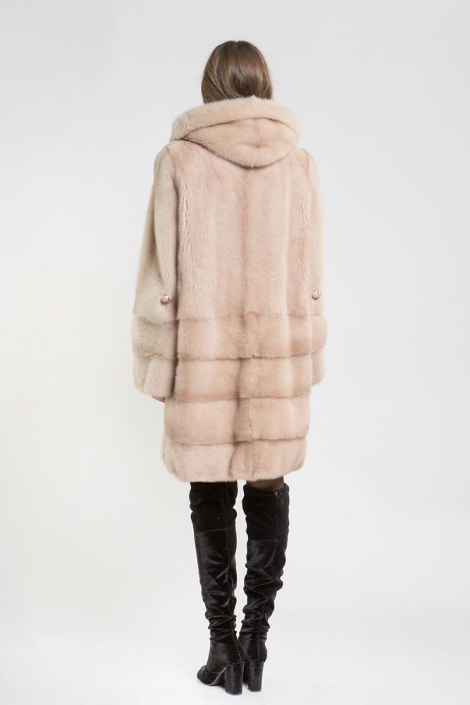 Полупальто из норкового меха с капюшоном. Модель сочетает в себе комбинированный крой и поперечную выкладку пластин в нижней части. Рукава изделия трансформируются в более укороченный вариант, что позволяет их сочетать с длинными перчатками или митенками. Длина полупальто составляет 100 см. Нежный и качественный цвет "миндаль" заслуживает множества комплиментов!
