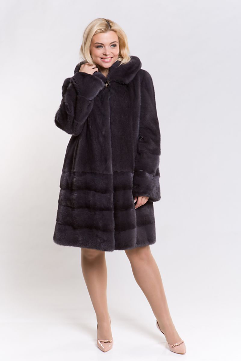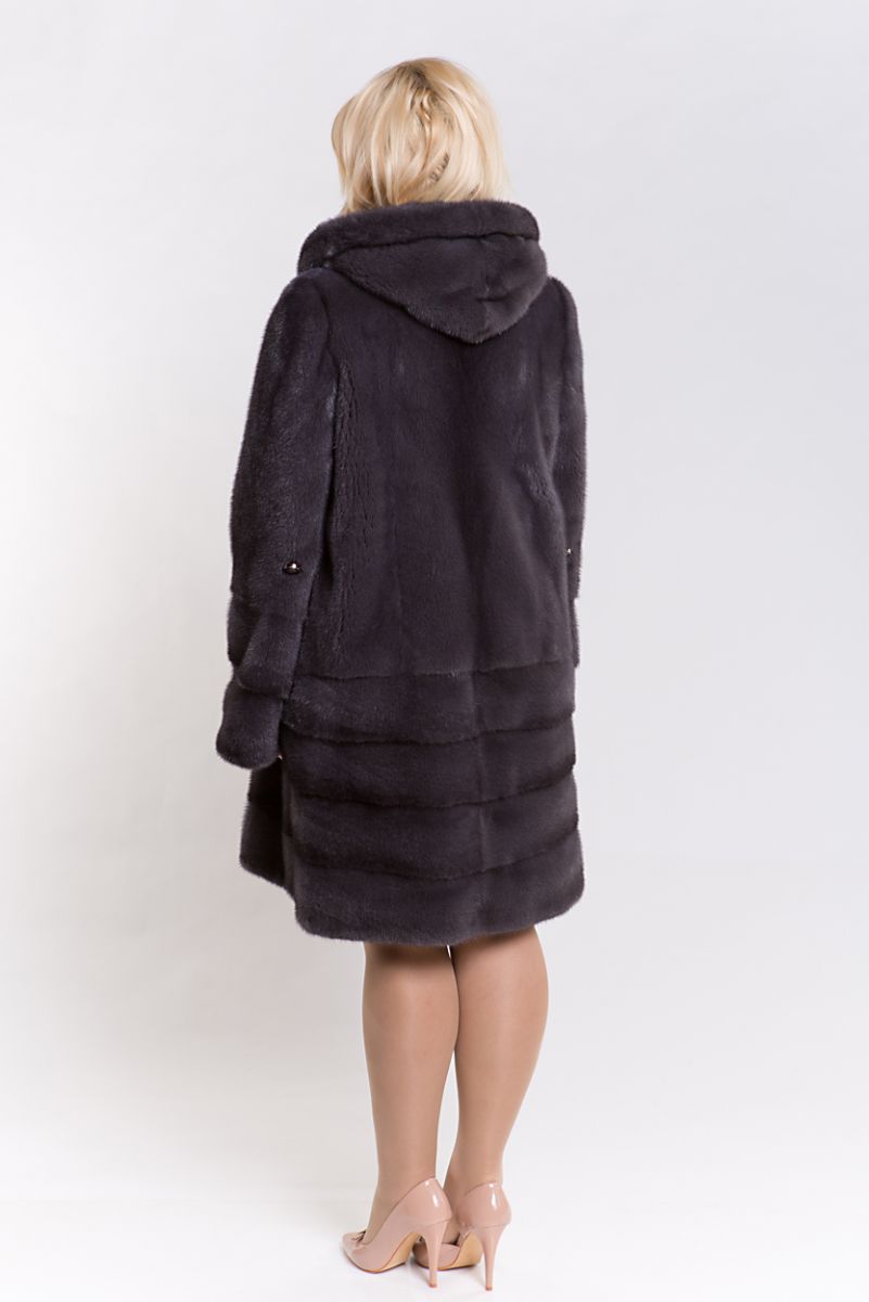 Полупальто из меха норки с капюшоном, выполненное в комбинированном стиле. Верх модели собран в роспуск, а низ — поперечная выкладка пластин. Это меховое пальто оснащено регулирующими утяжками на талии и рукавах, что позволяет создавать идеальный силуэт. Длина изделия составляет 100 см, а рукава можно укоротить по своему вкусу.