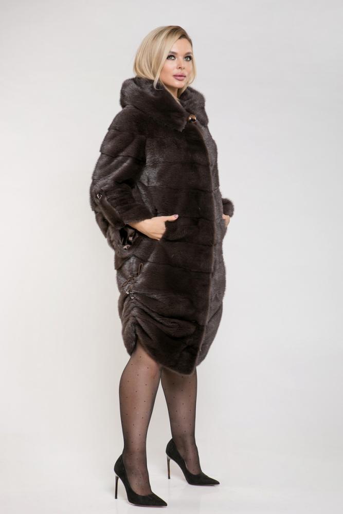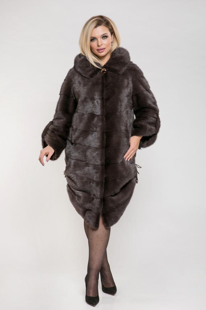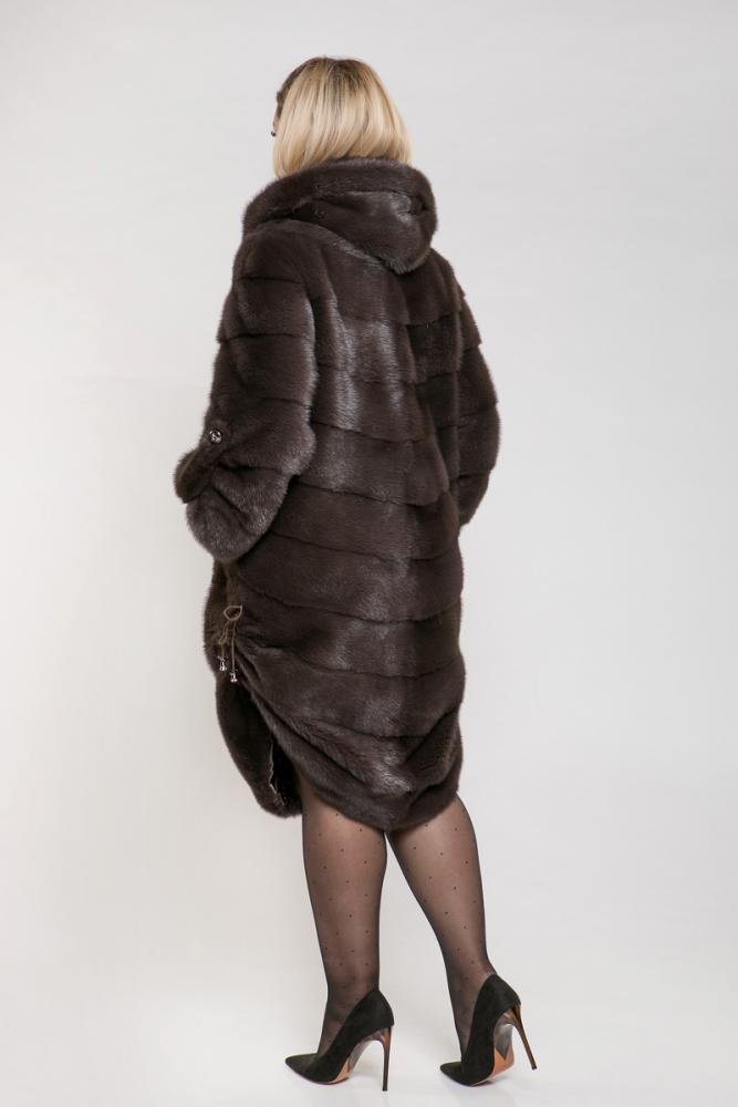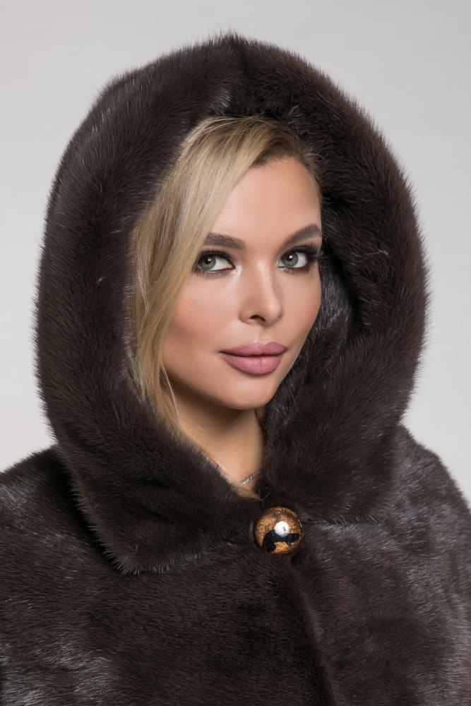 Полупальто из меха норки с капюшоном, выполненное в слегка диагональной выкладке пластин. Модель оснащена регулируемыми утяжками на рукавах и по низу, что позволяет трансформировать ее в универсальный вариант. При необходимости утяжки можно распустить, превратив изделие в классическую шубу. Длина полупальто составляет 110 см. Эта оригинальная и эксклюзивная модель пользуется большой популярностью среди наших покупательниц.