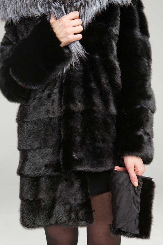 Полупальто женское из меха норки. Капюшон изделия дополнен мехом чернобурой лисы. Крой изделия - поперечная выкладка пластин. Длина шубки 90 см. Рукава и низ модели отстегиваются. Изделие трансформируется в куртку. Это очень удобно, оригинально и практично.