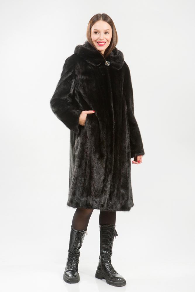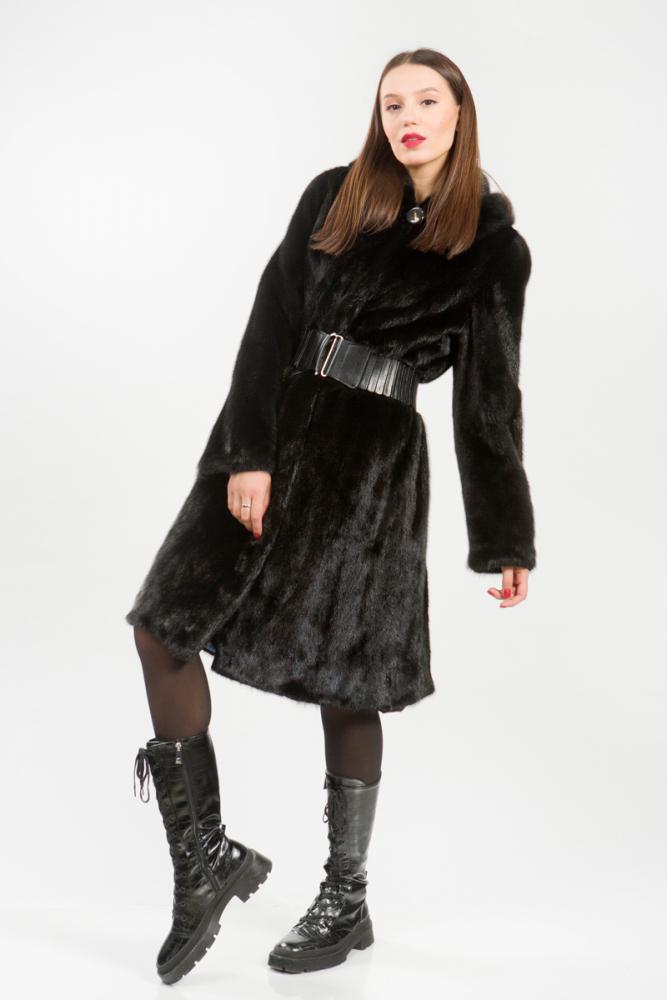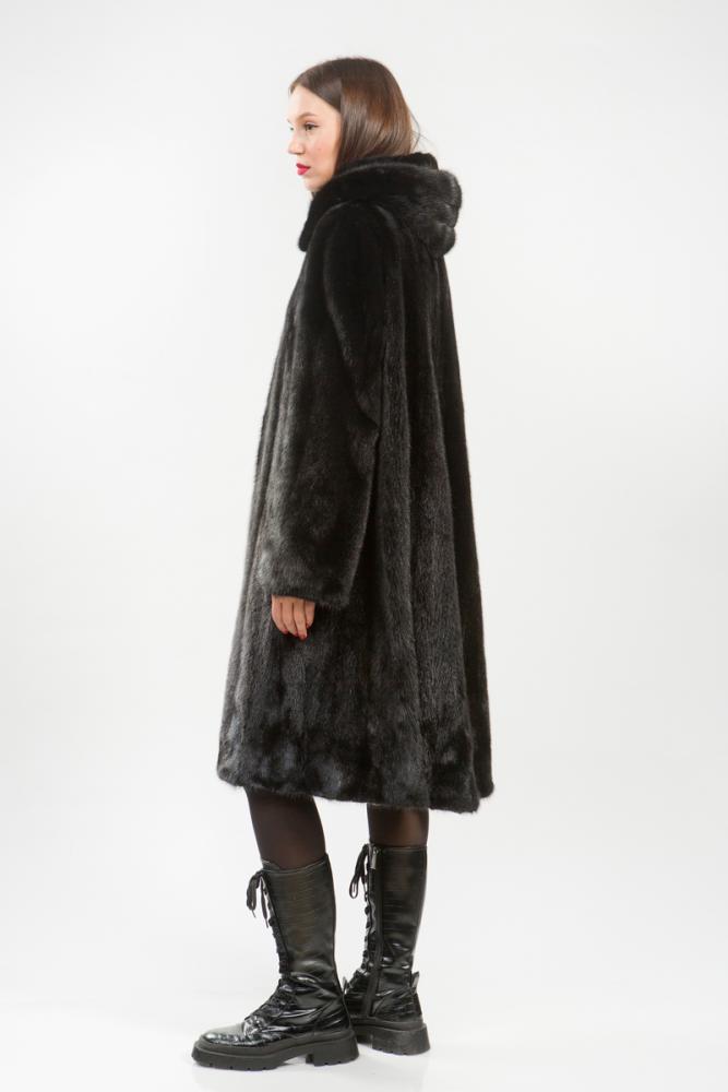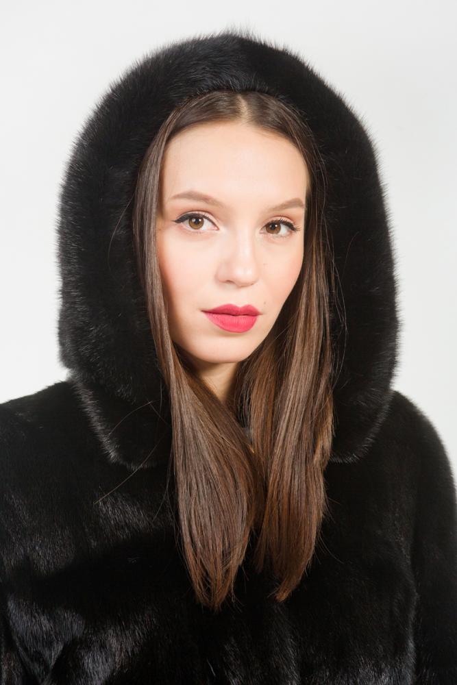 Полупальто из меха норки с капюшоном. Крой изделия роспуск. Внутри на талии и на рукавах модели имеются регулирующие утяжки. Длина изделия 110 см. Шубка к низу расклешена и имеет великолепные фалды. Модель можно носить с поясом. Такая стильная шубка в благородном черном цвете гарантирует образу солидность и презентабельность!