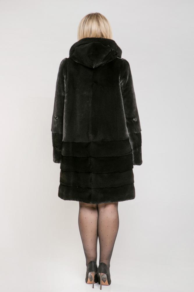 Полупальто из норки с капюшоном, выполненное в свободном крое, а снизу — из поперечно выложенных пластин. Рукава модели можно сделать более укороченными, используя регулирующую утяжку. Длина изделия составляет 100 см. Приобретение такой шубки станет настоящей инвестицией в ваш стиль!