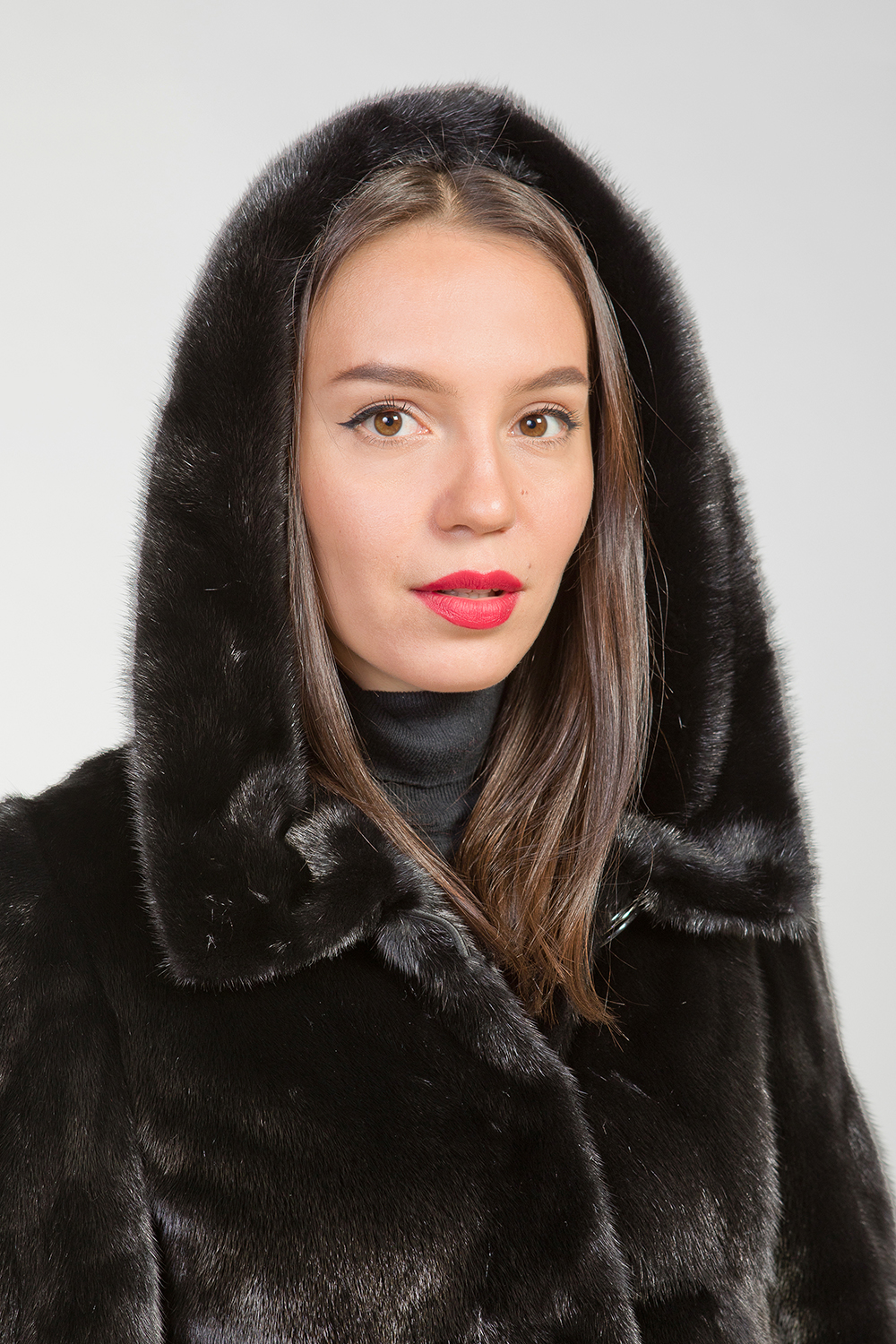 Полупальто из меха норки с капюшоном. Крой изделия роспуск с добавлением пластин. Модель оснащена утяжкой в зоне талии, позволяющая подчеркнуть стройность фигуры. Длина изделия 90 см. Благородный черный цвет меха предоставляет неограниченные возможности для любительниц экспериментов!